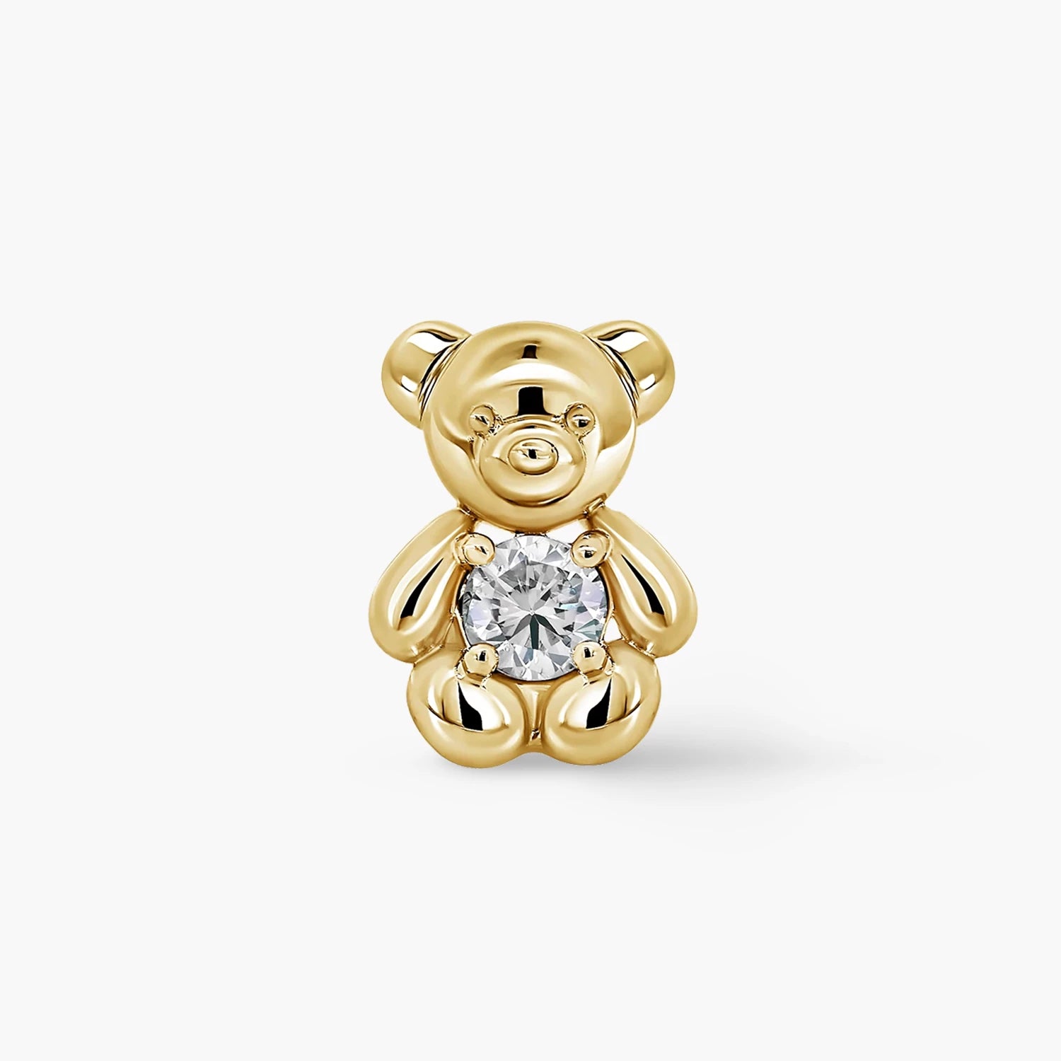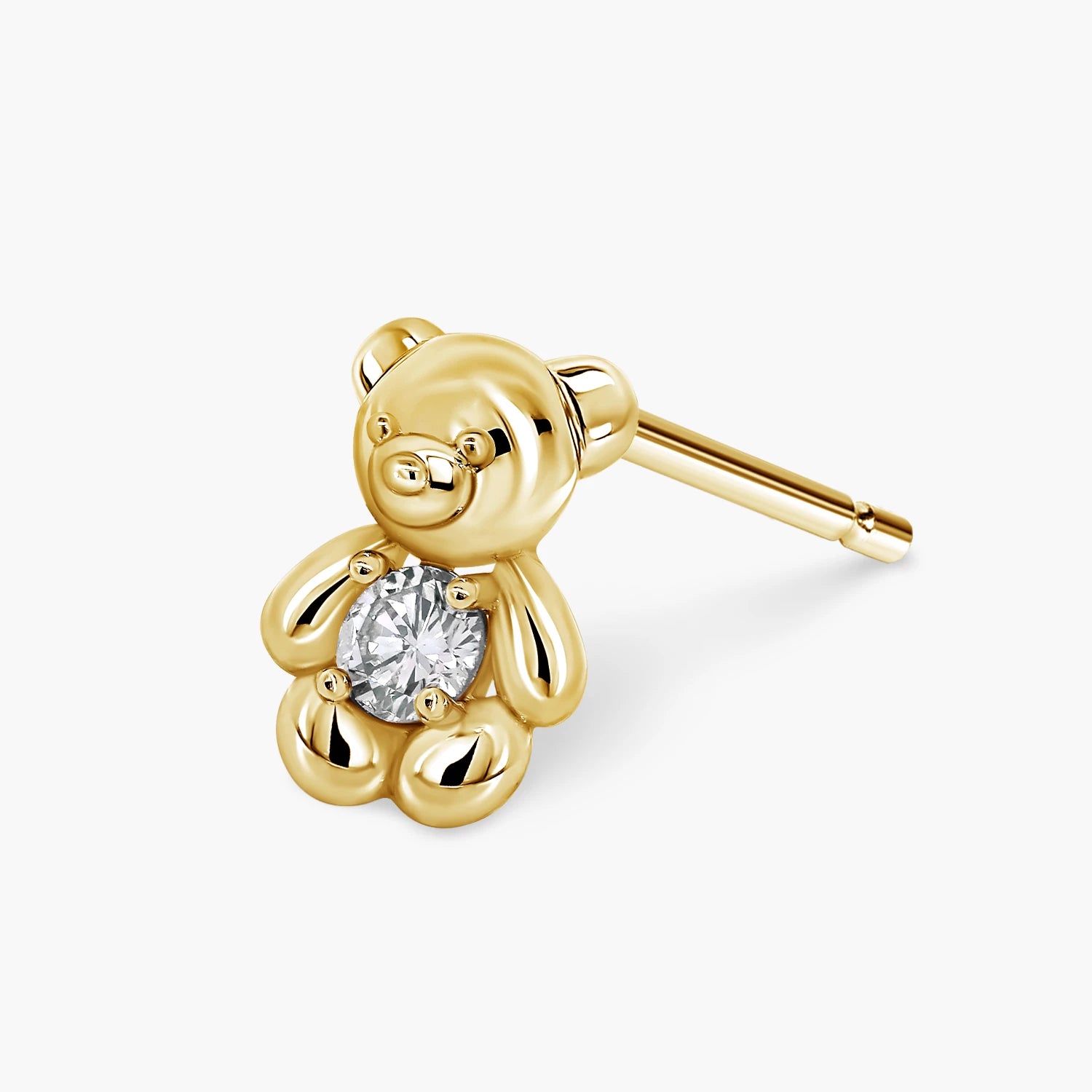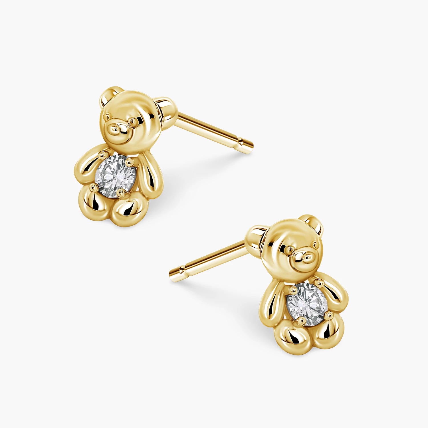 Petite teddy bear studs in white and yellow gold, each set with a natural diamond, totalling 0.1ct for a subtle yet radiant touch of everyday elegance.