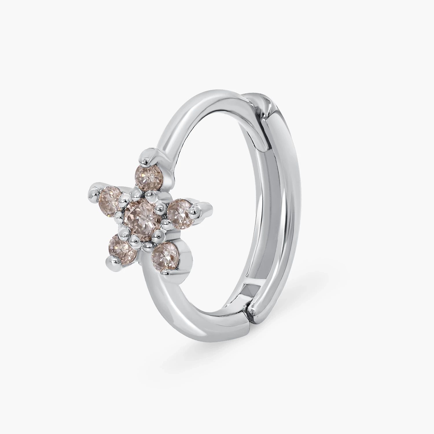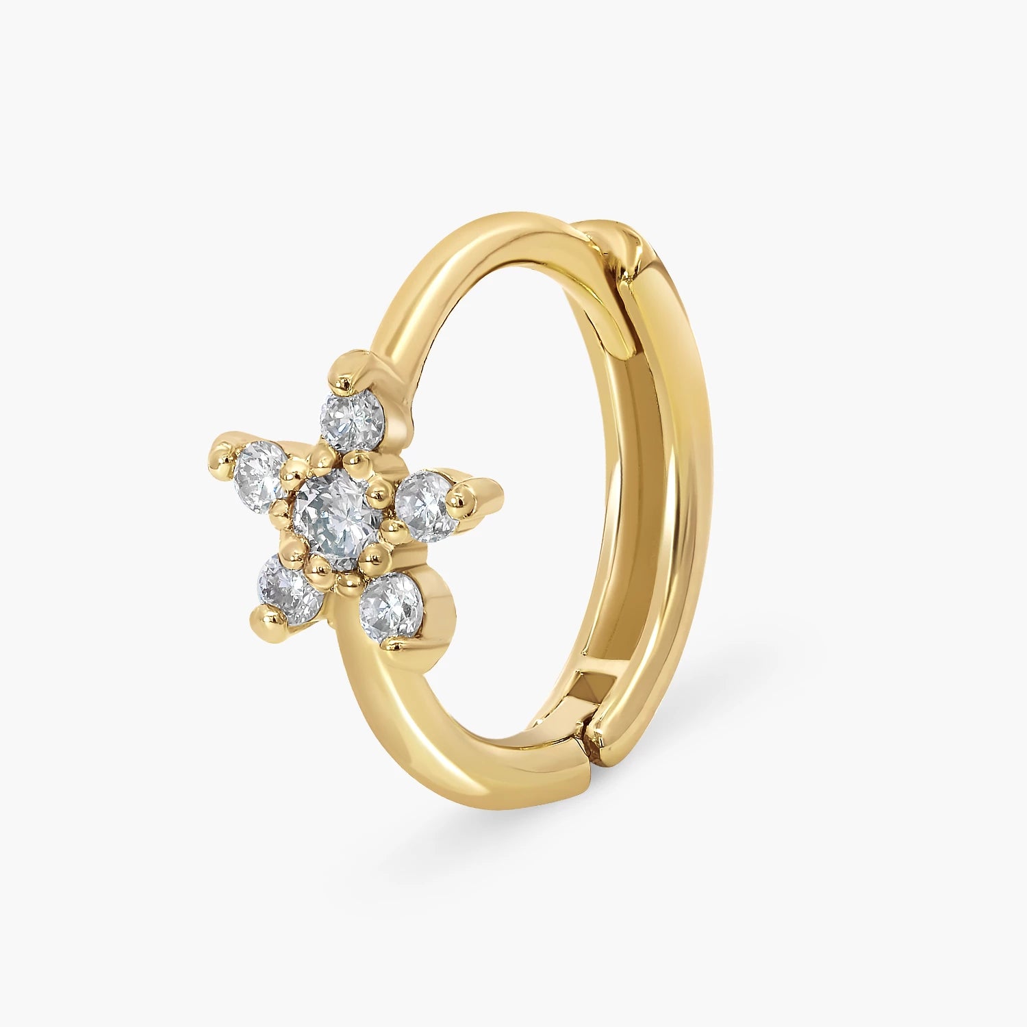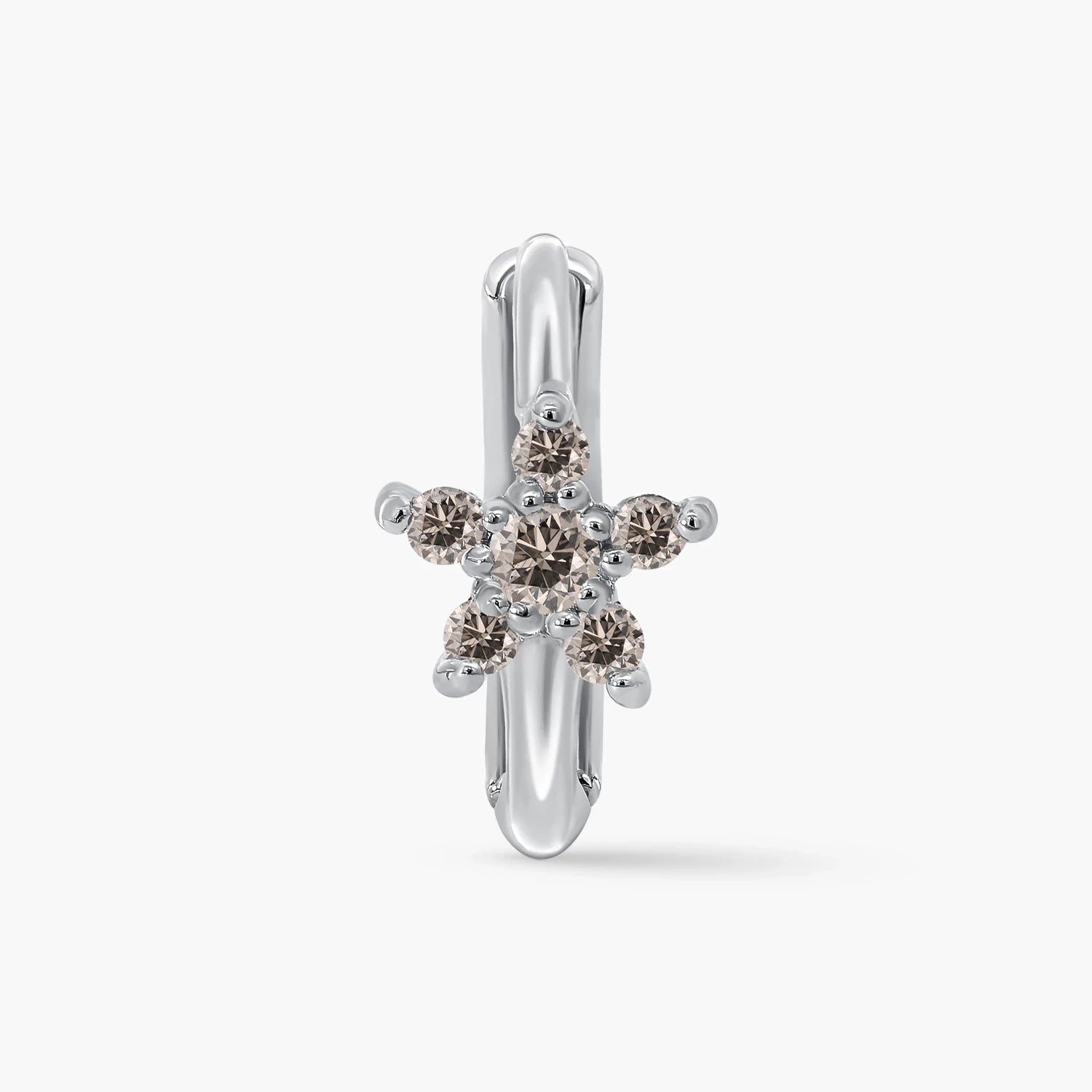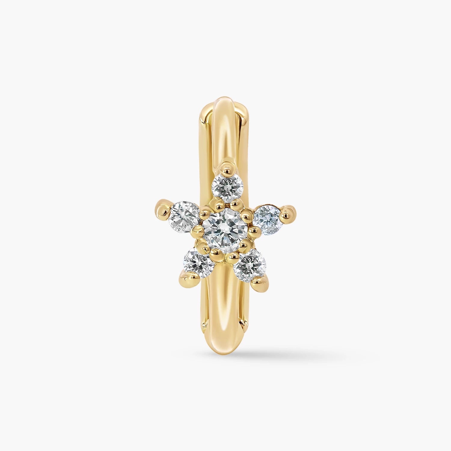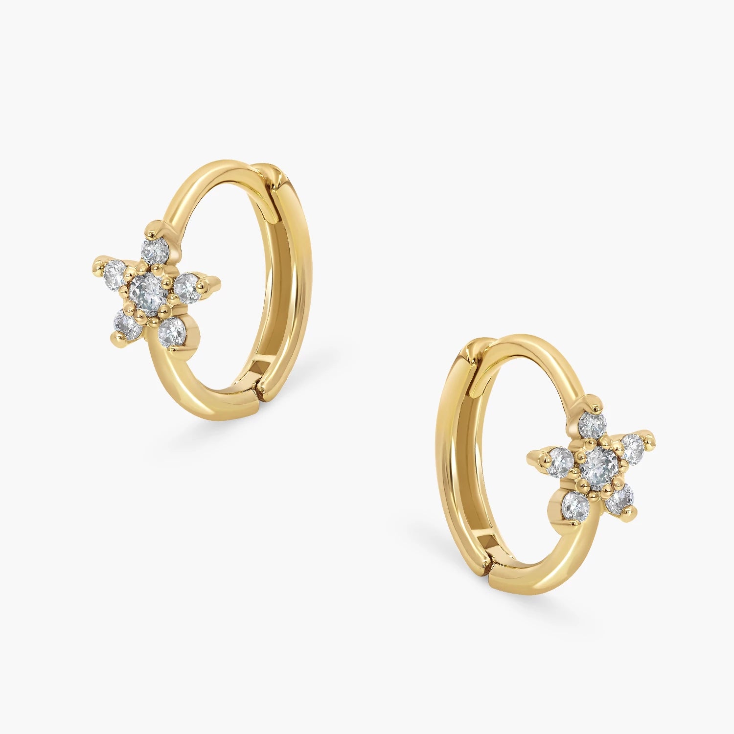 Cute flower Hoop Earrings in white and yellow gold, 14kt gold set with 12 natural diamonds totalling 0.09ct, perfect for adding refined sparkle to any outfit.