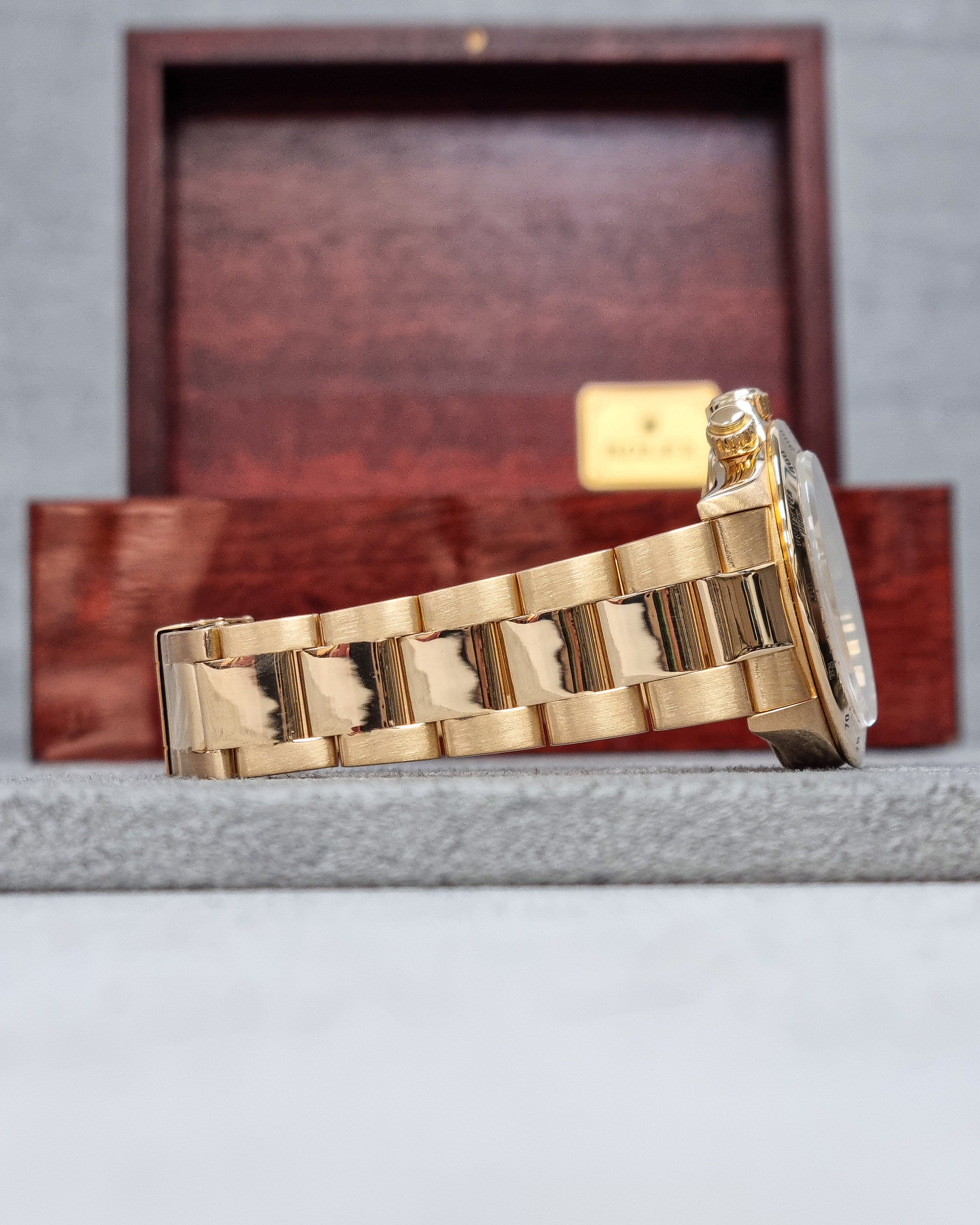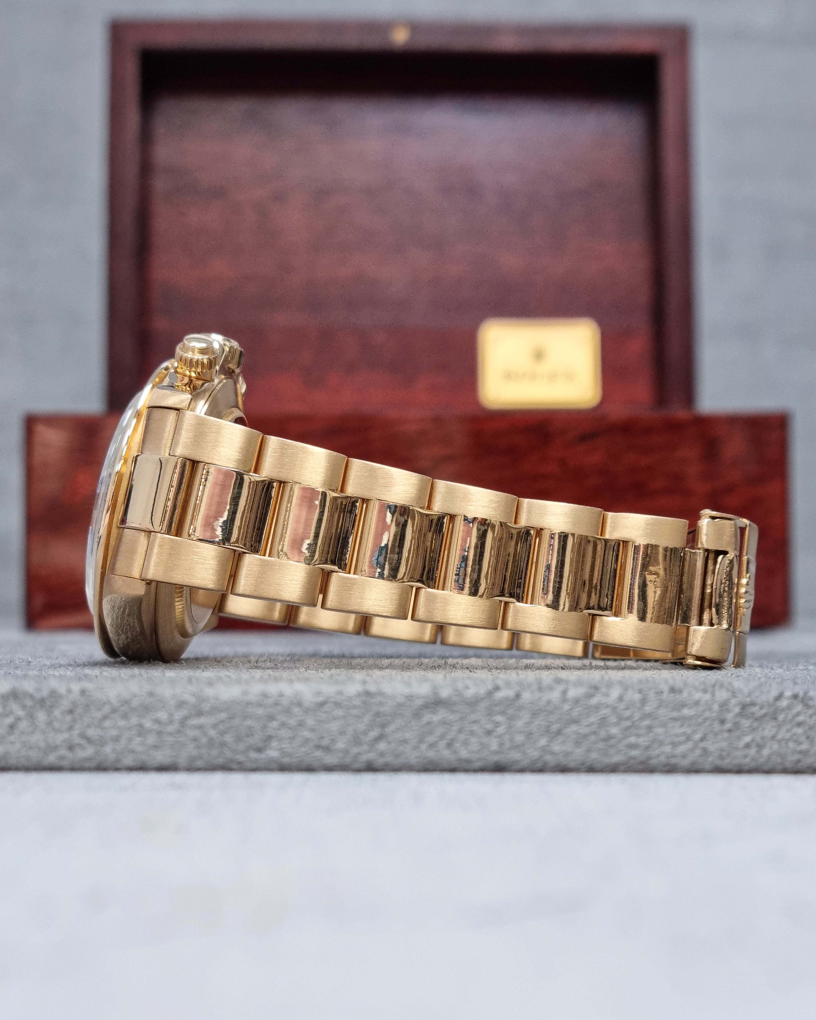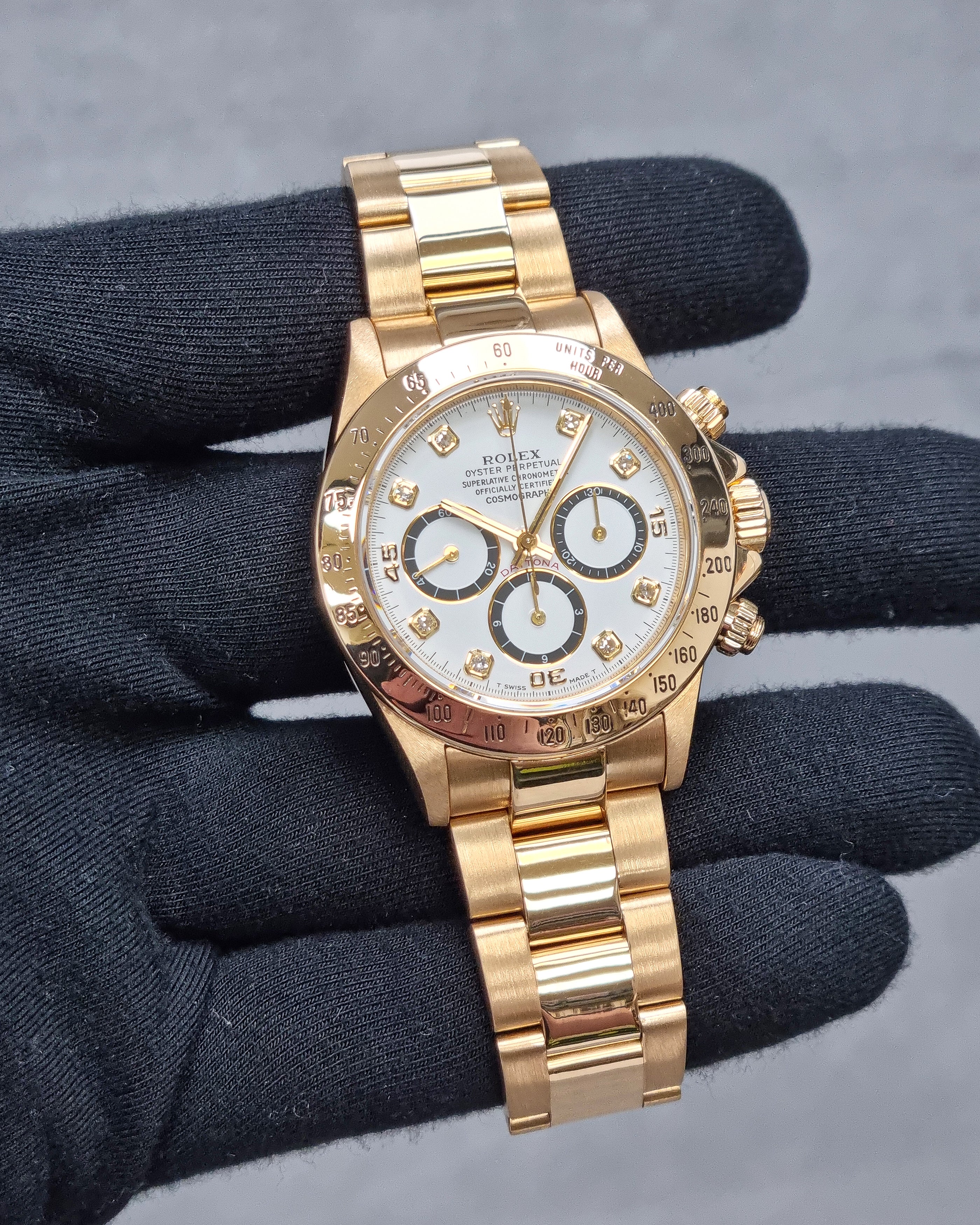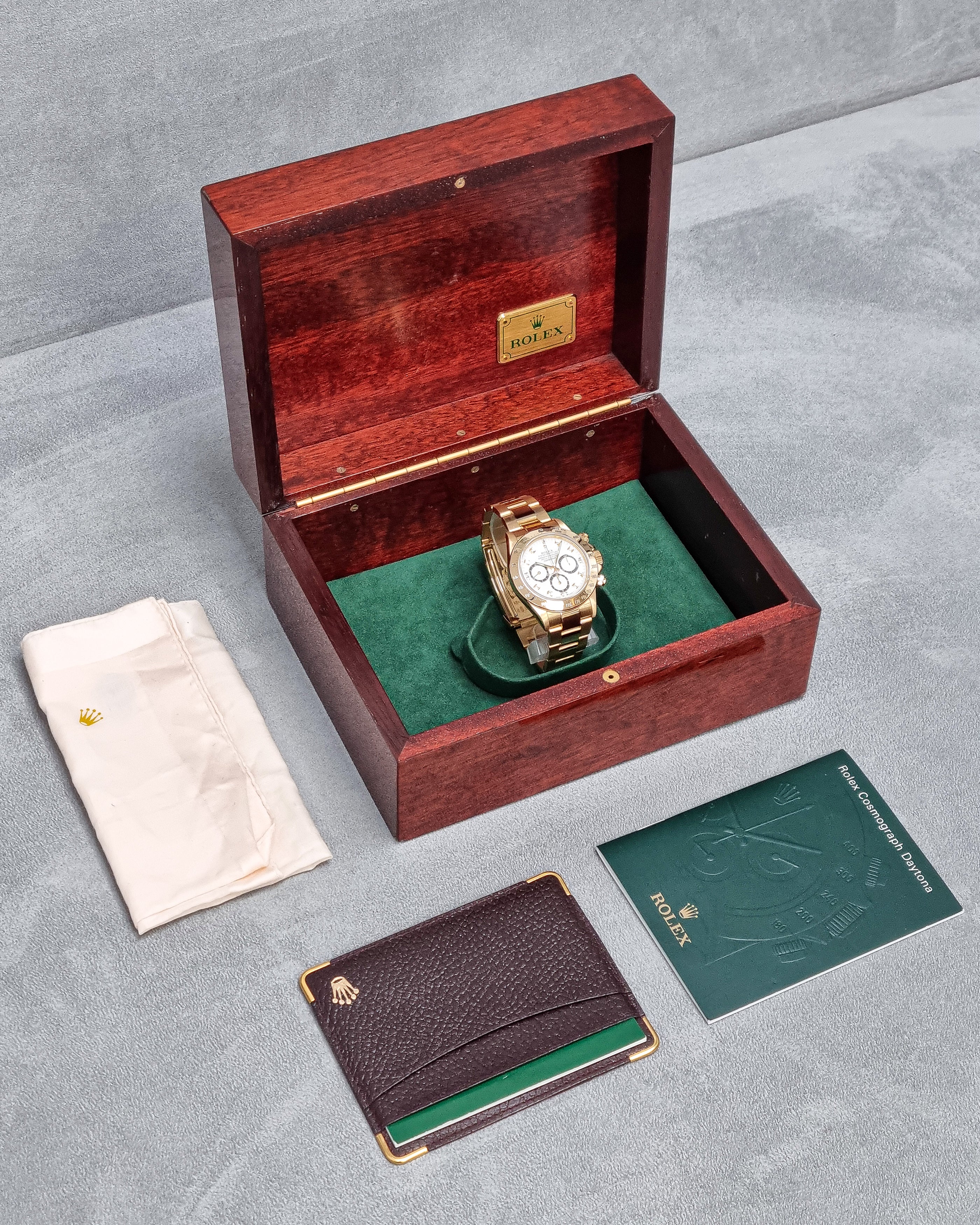 Rolex Daytona – Reference 16528 (1991) – A legendary chronograph crafted in 18kt yellow gold, featuring a white dial with chronograph subdials. The 36mm case and iconic Oyster bracelet deliver both luxury and sporty elegance.