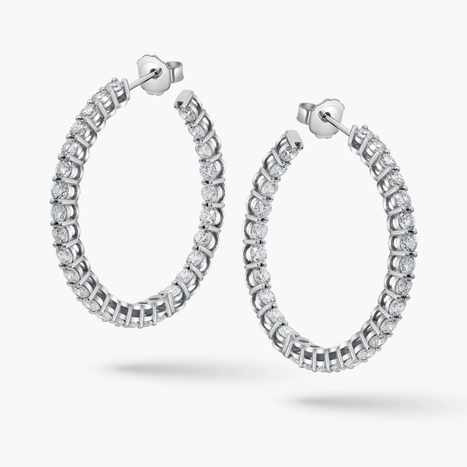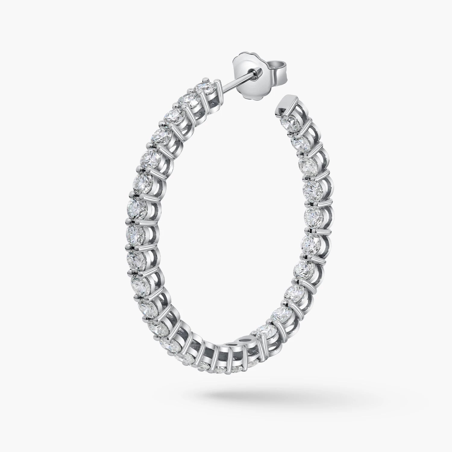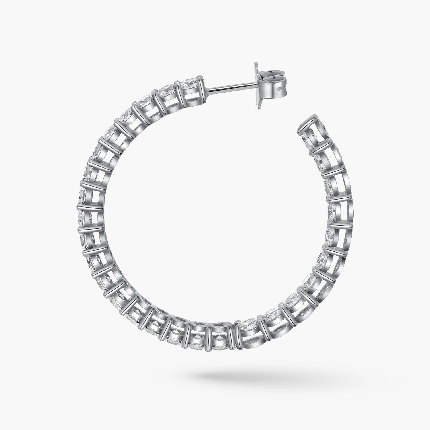 Exquisite 18kt white gold hoop earrings featuring 56 lab-grown diamonds (D–F, VS) with a total weight of 5.00ct. Their graceful design and balanced 11.8g weight offer both comfort and luxury, creating a continuous circle of brilliance that catches the light from every angle.