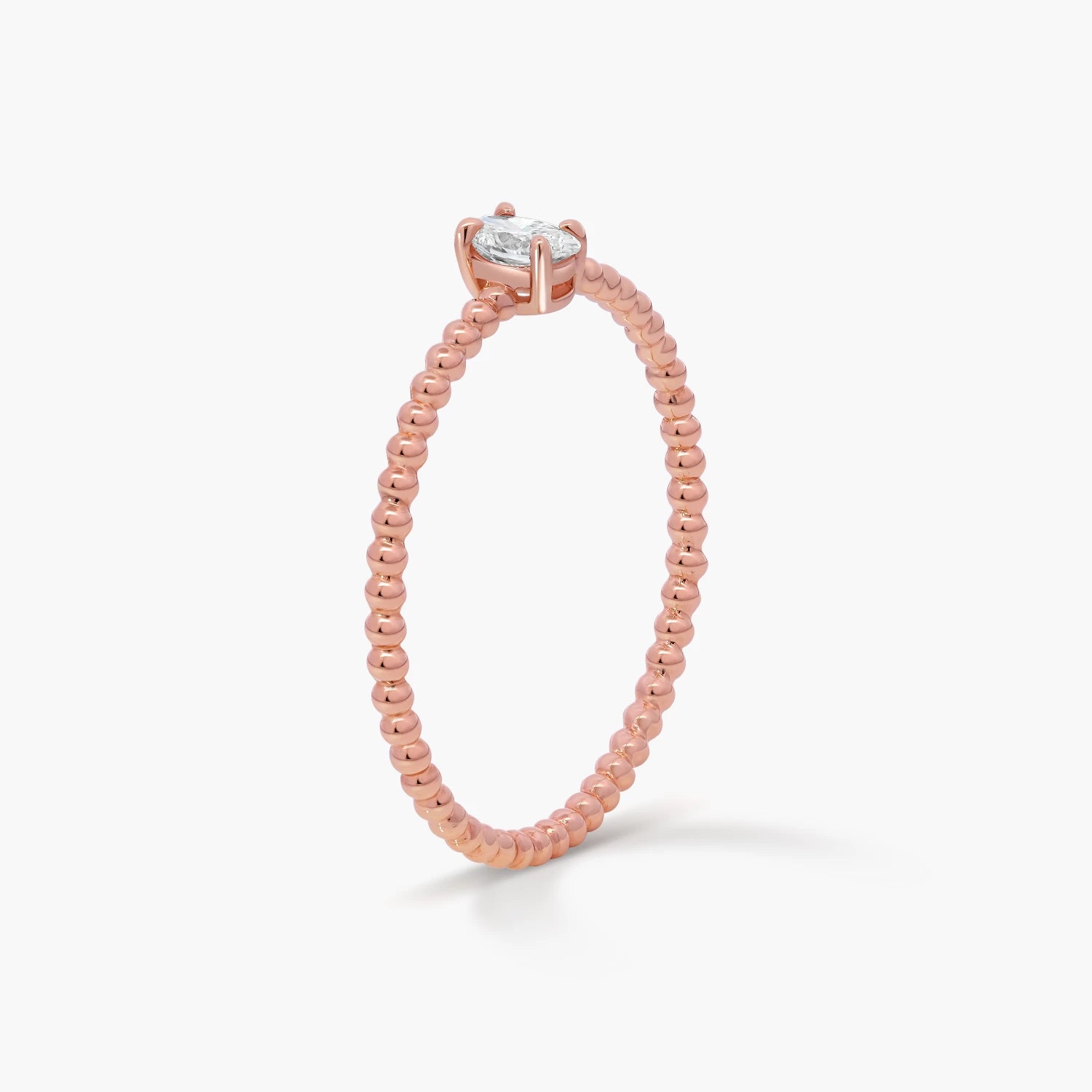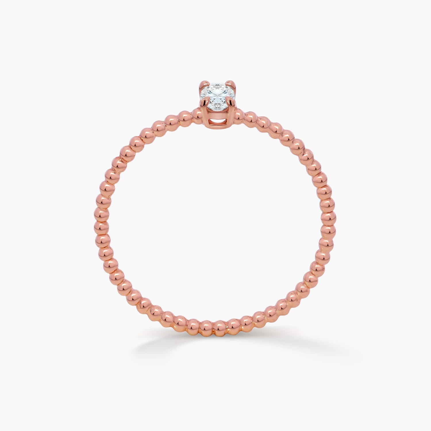 A delicate rose gold ring in sterling, featuring a single oval natural diamond held in a shared prong, surrounded by charming beaded bubble detailing.