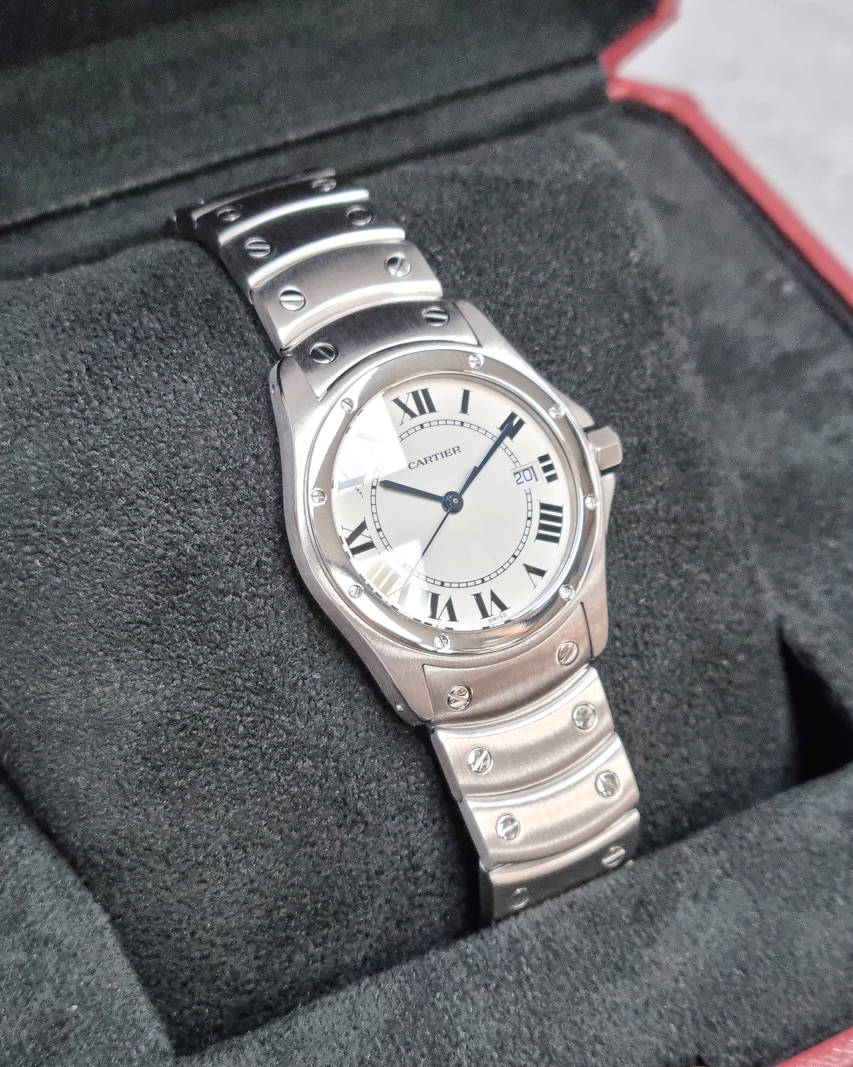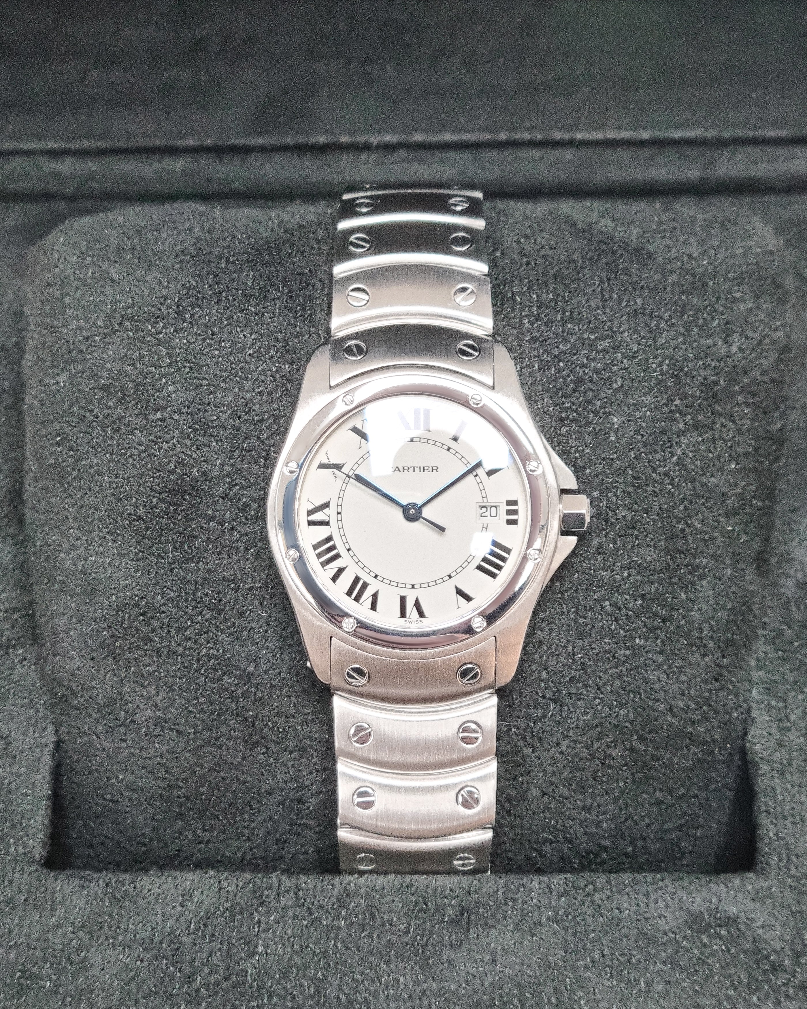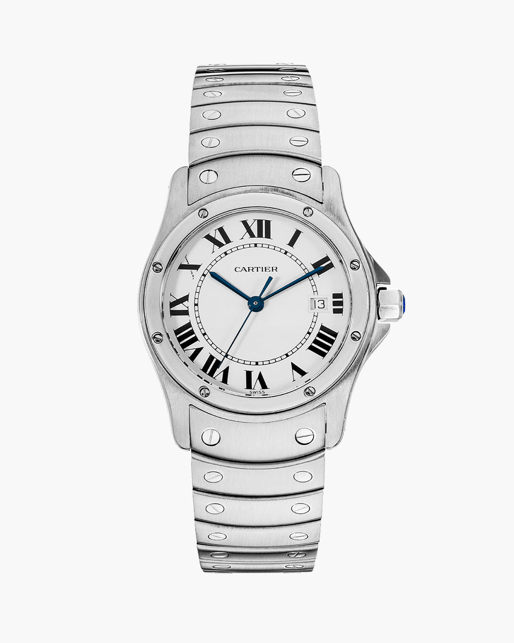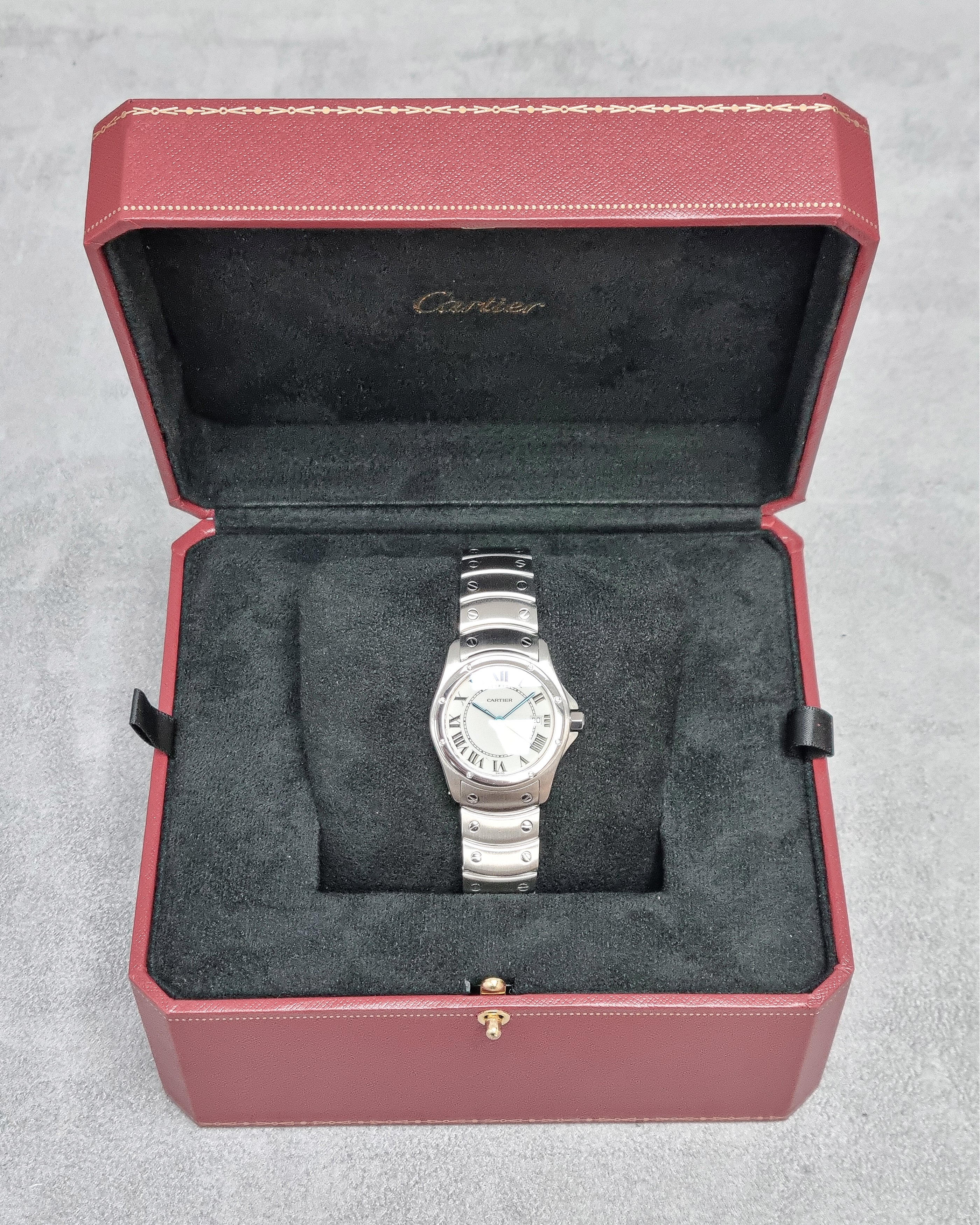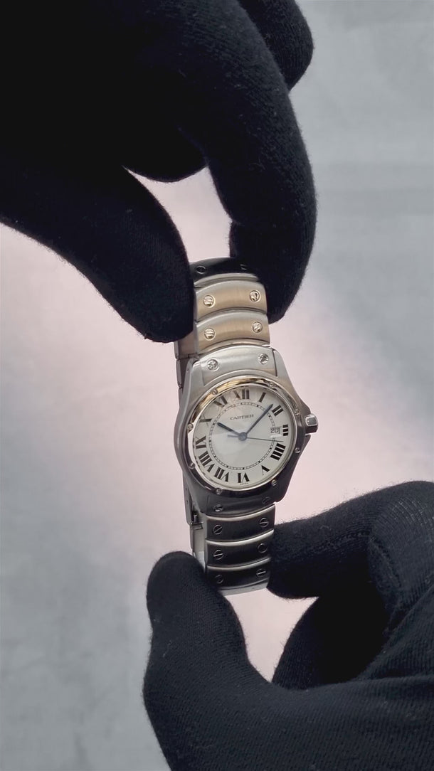 Cartier Ronde W20027K1 (1996) – A timeless 1996 Cartier Ronde featuring a stainless steel case and bezel with a classic white dial and Roman numerals. Powered by a quartz movement, it offers reliable precision with Cartier’s signature elegance.