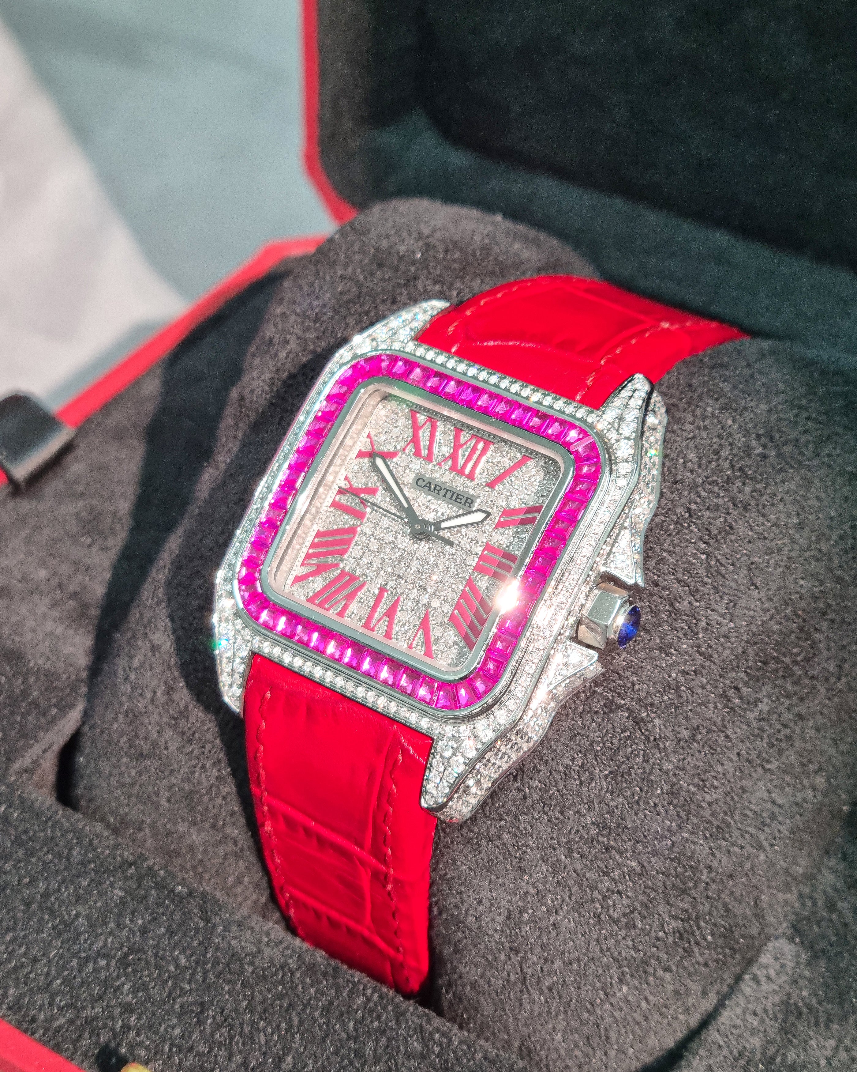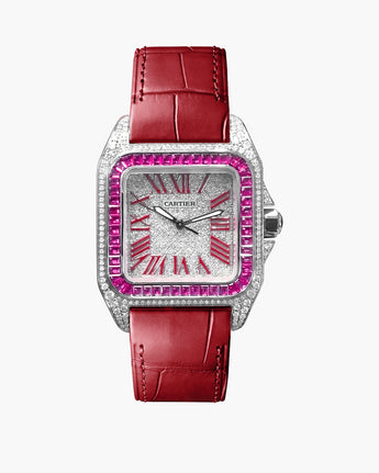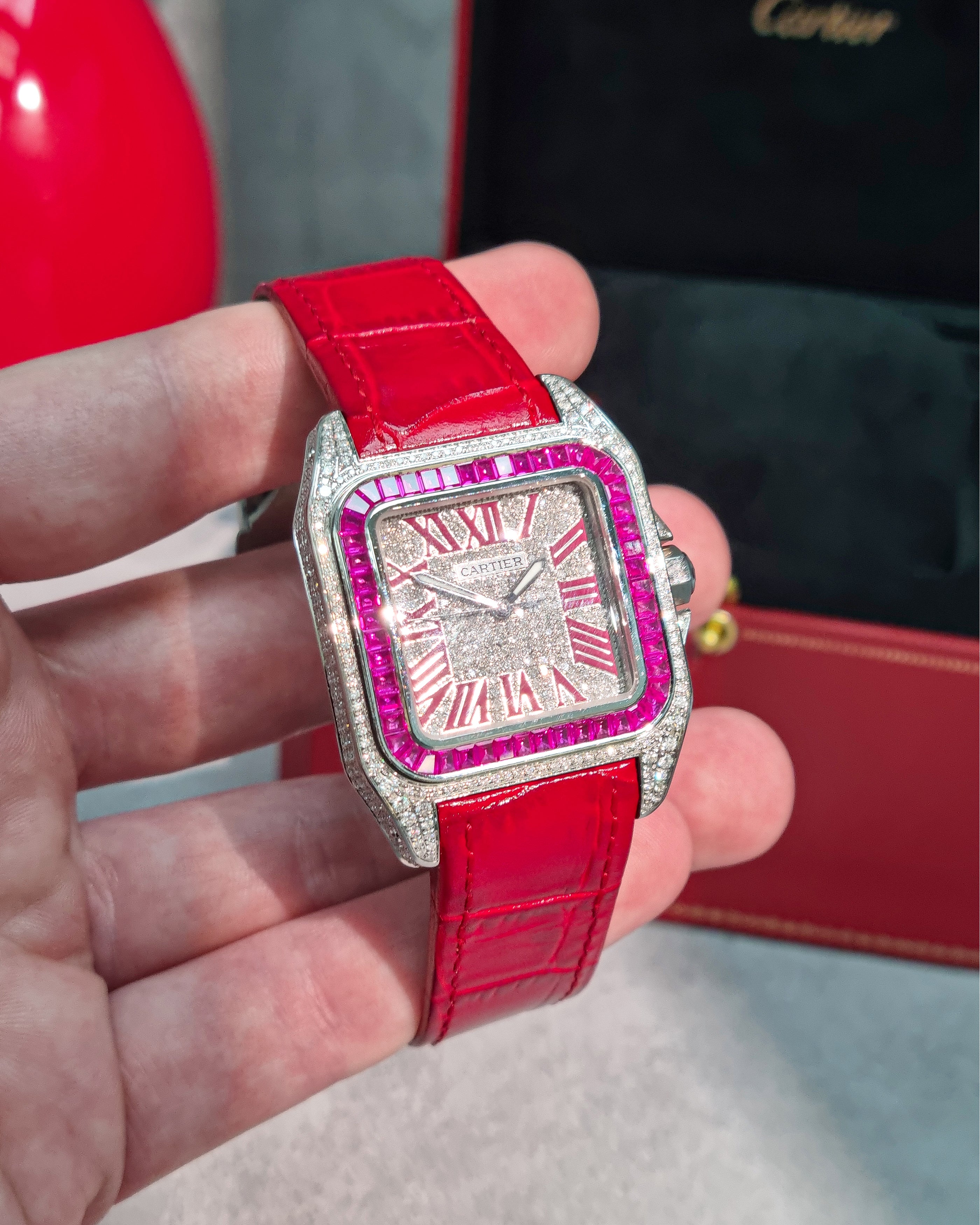 An extraordinary edition of Cartier’s Santos 100, blending bold design with luxurious gemstones. This striking piece is perfect for collectors or anyone seeking a distinctive statement watch with unparalleled elegance.