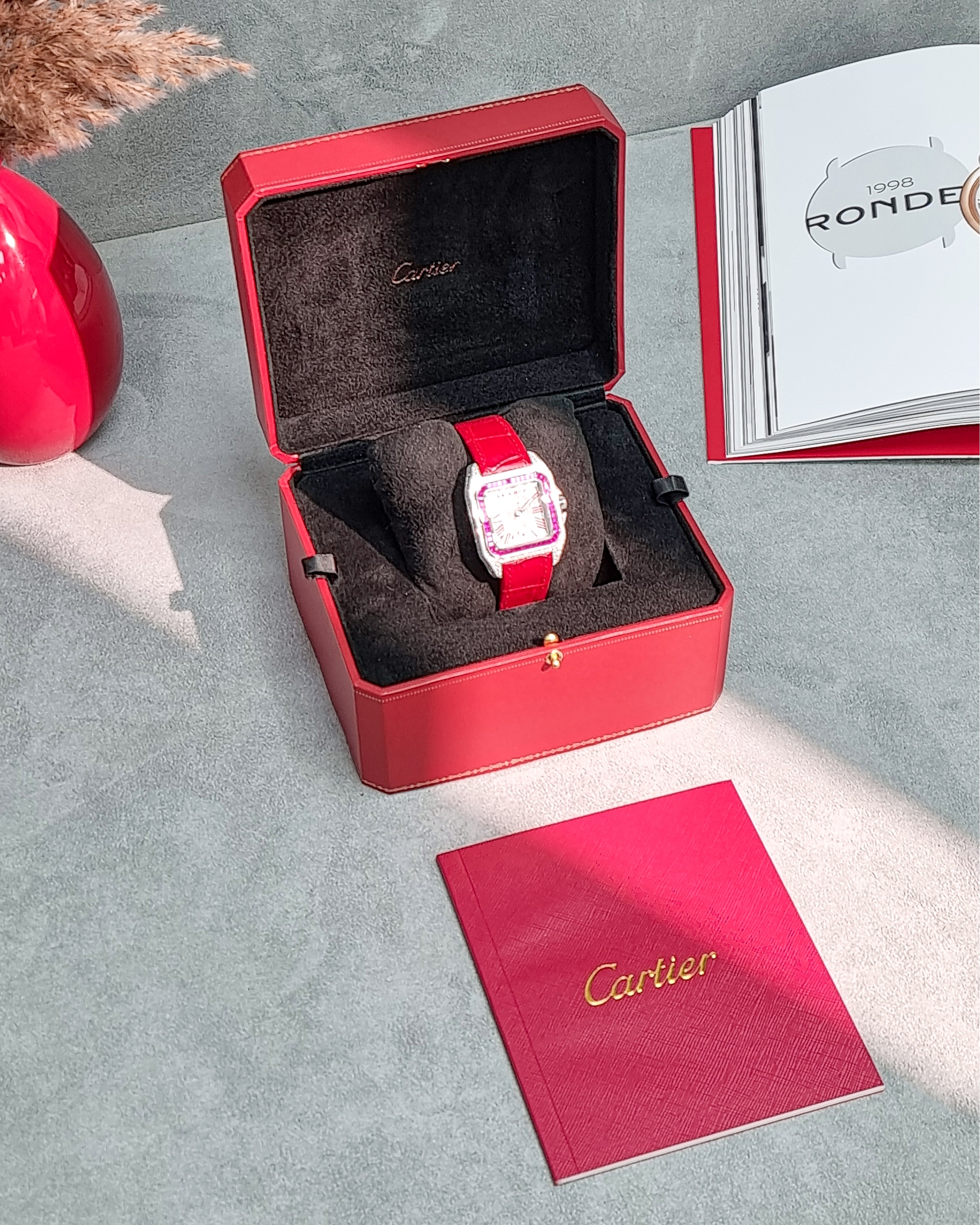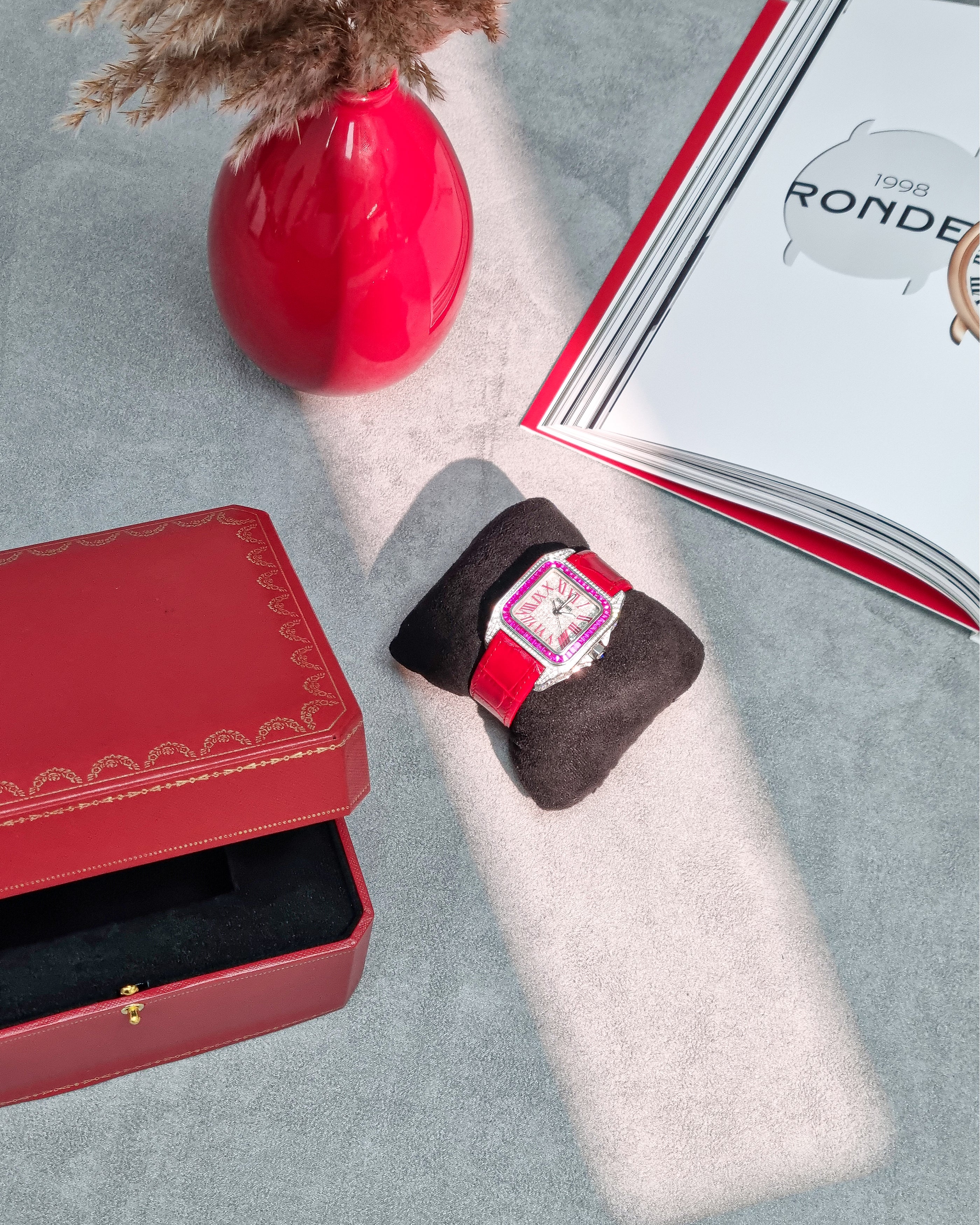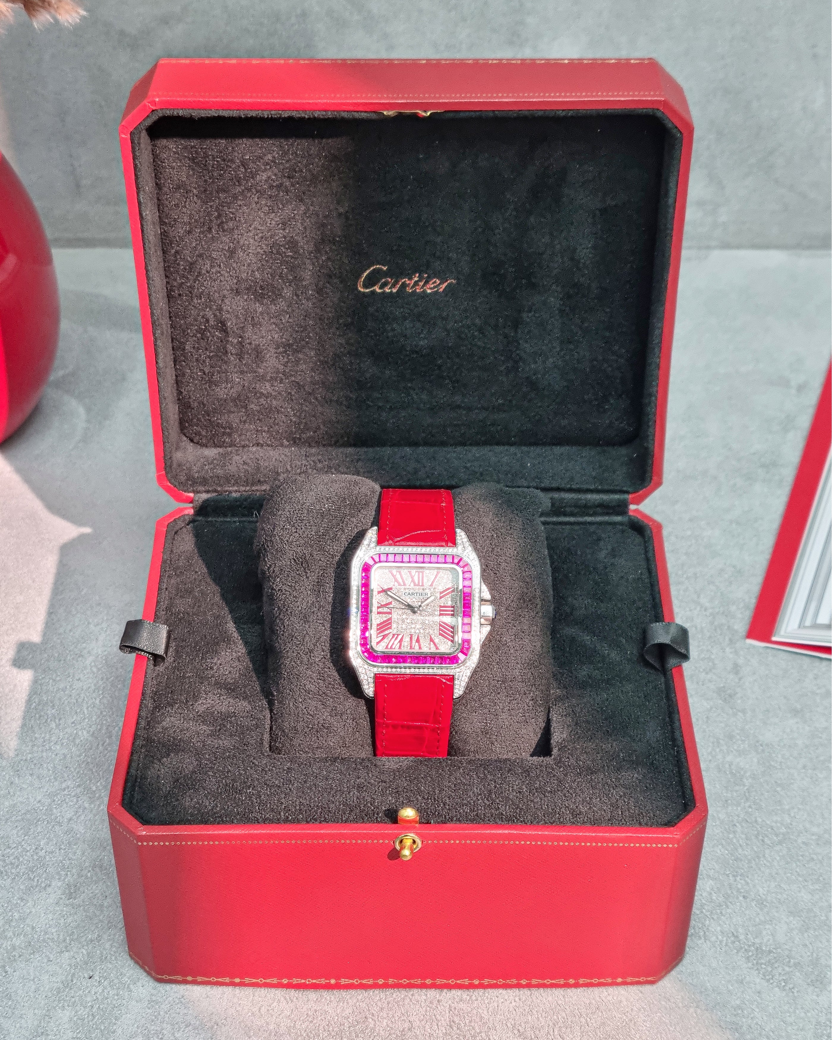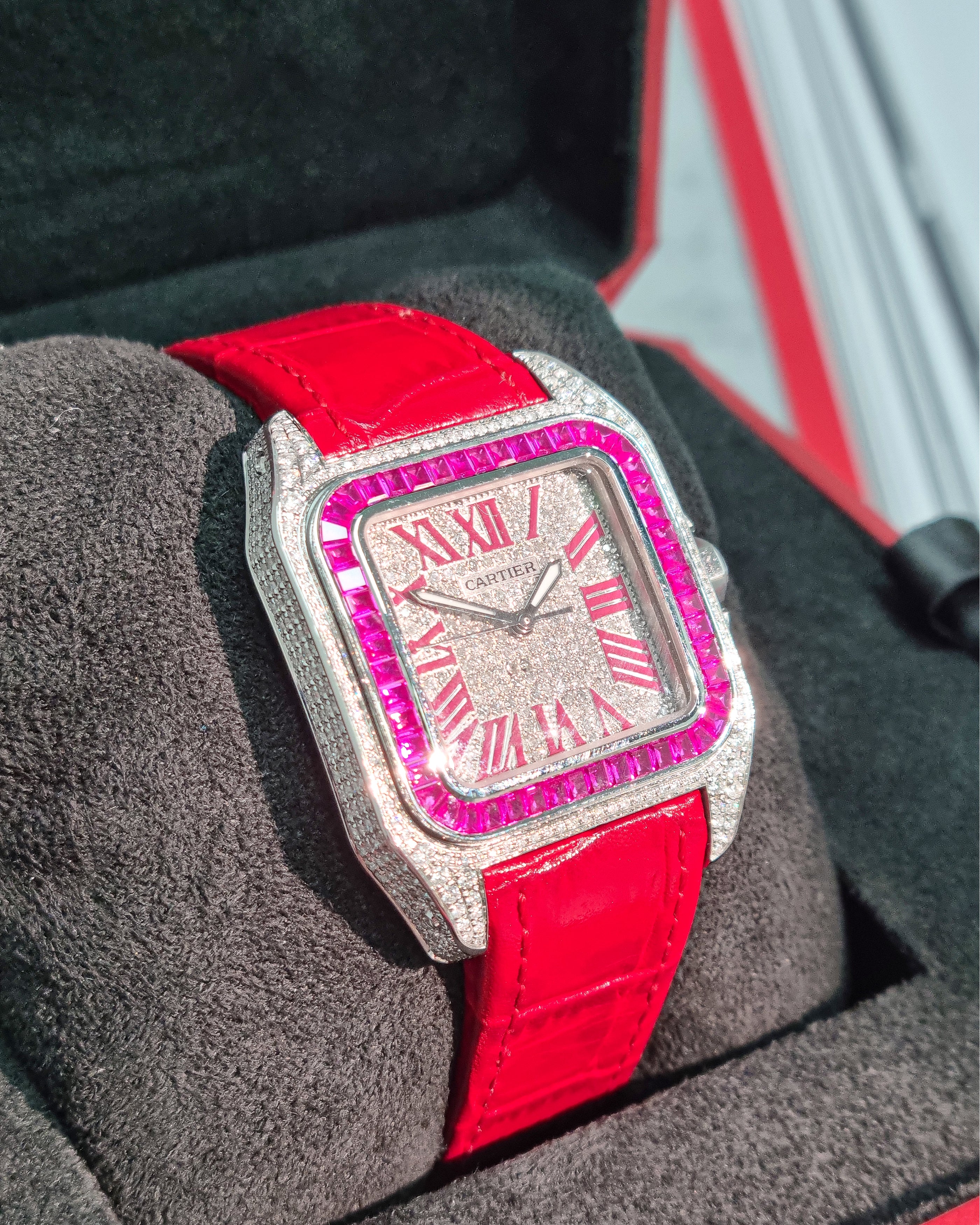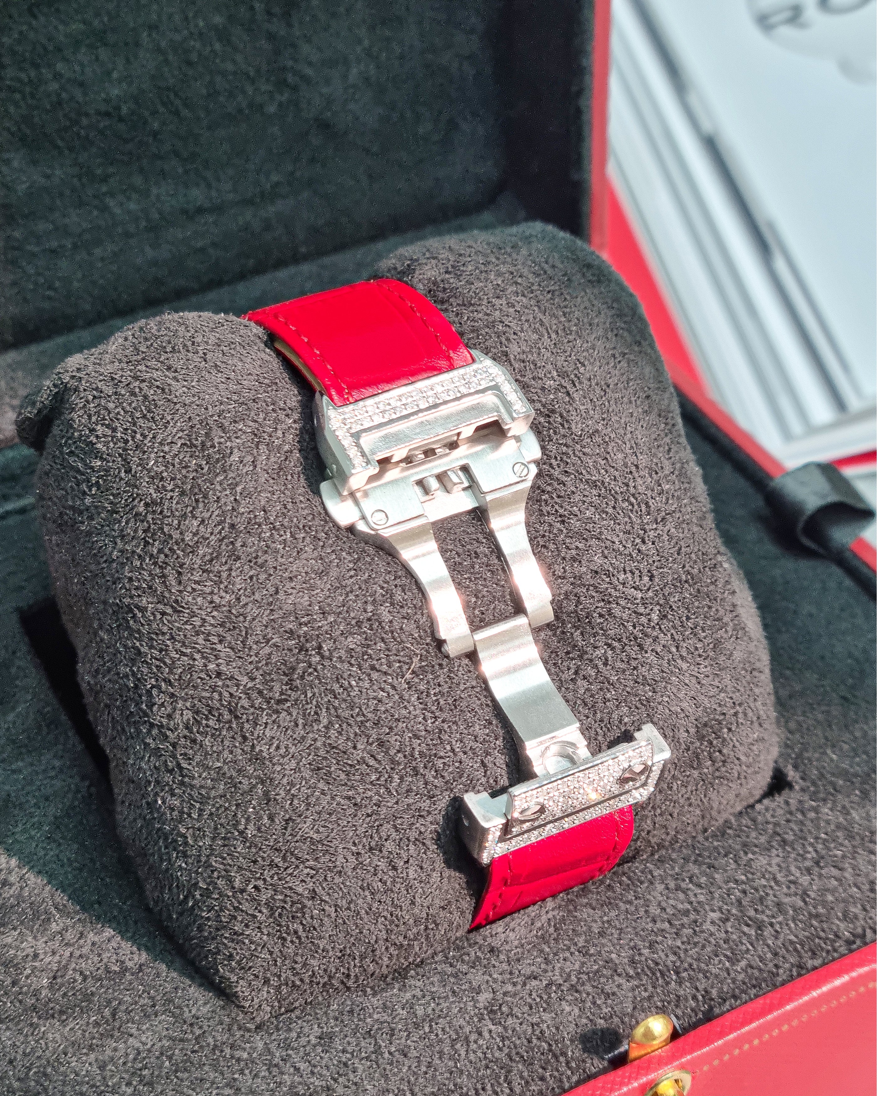Cartier Santos 100 W20106X8 (2016) – A 33mm x 44mm stainless steel timepiece featuring a custom diamond dial with Red Roman numerals, and a custom diamond- and cubic zirconia red-set bezel. Powered by a quartz movement and paired with a red leather strap featuring a stainless steel and custom diamond clasp. Supplied with original box and papers. In very good condition. Cat No. 0937.