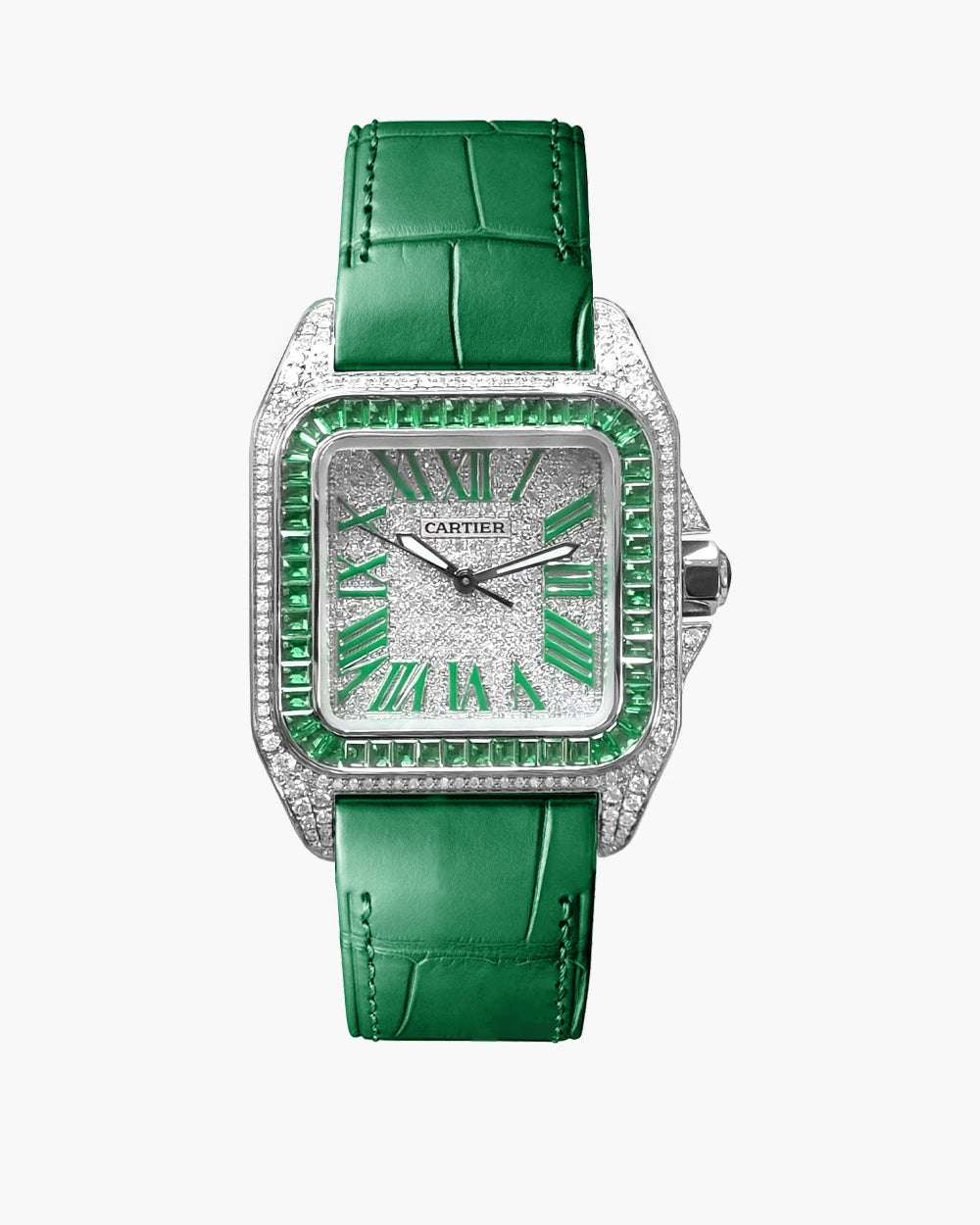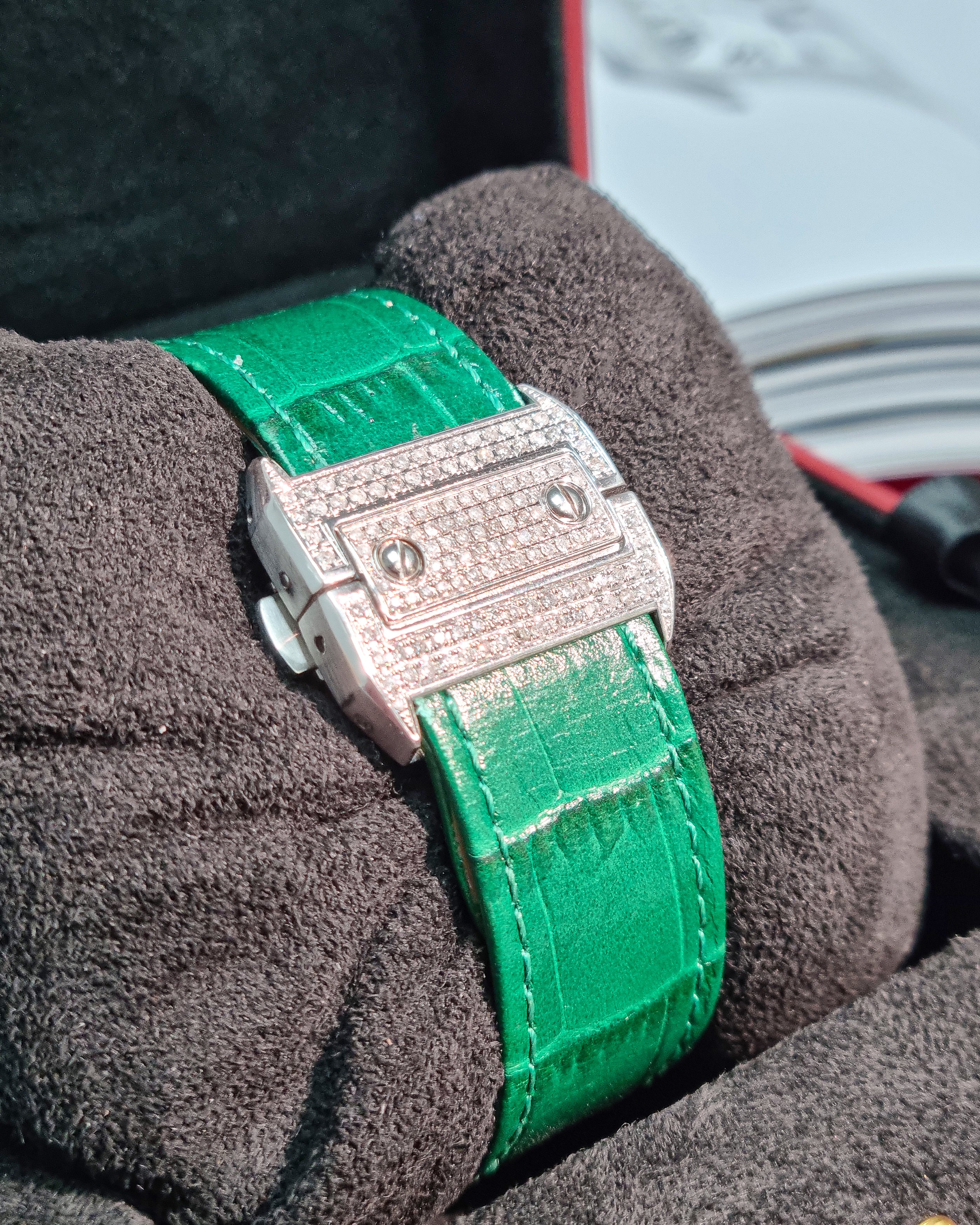 Cartier Santos 100 W20106X8 (2016) – A bold 38mm x 51mm stainless steel timepiece featuring a custom diamond-set dial with green Roman numerals and a matching diamond-set bezel. Fitted with a green leather strap and stainless steel clasp accented with custom diamonds. Powered by a quartz movement. Supplied with box and papers. In very good condition. Cat No. 0936.
