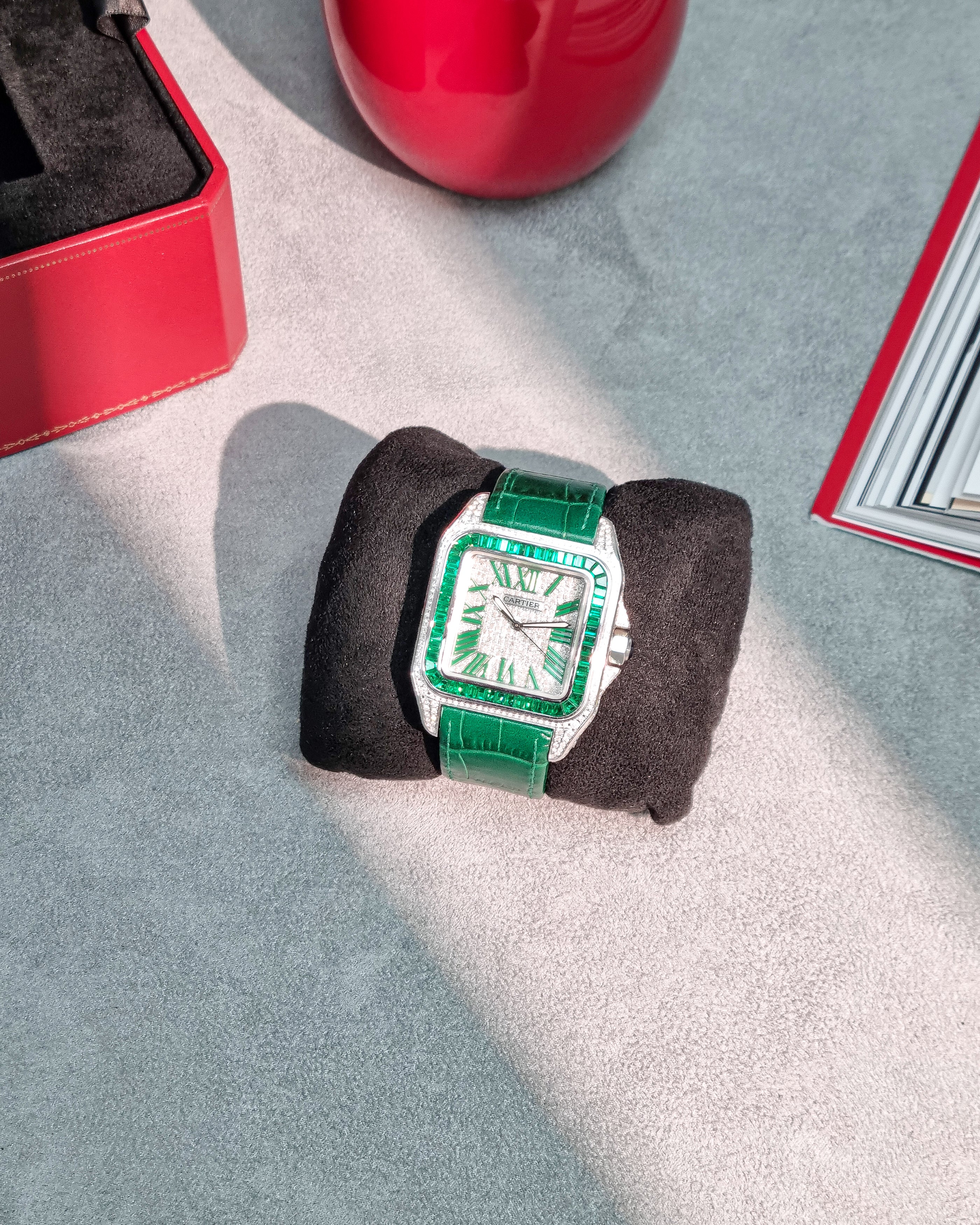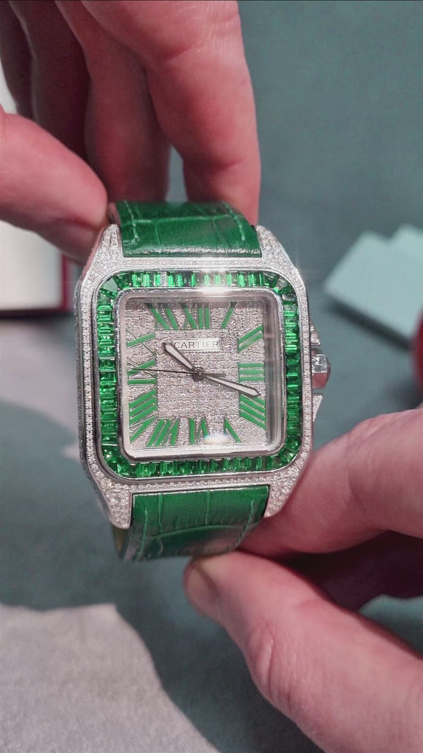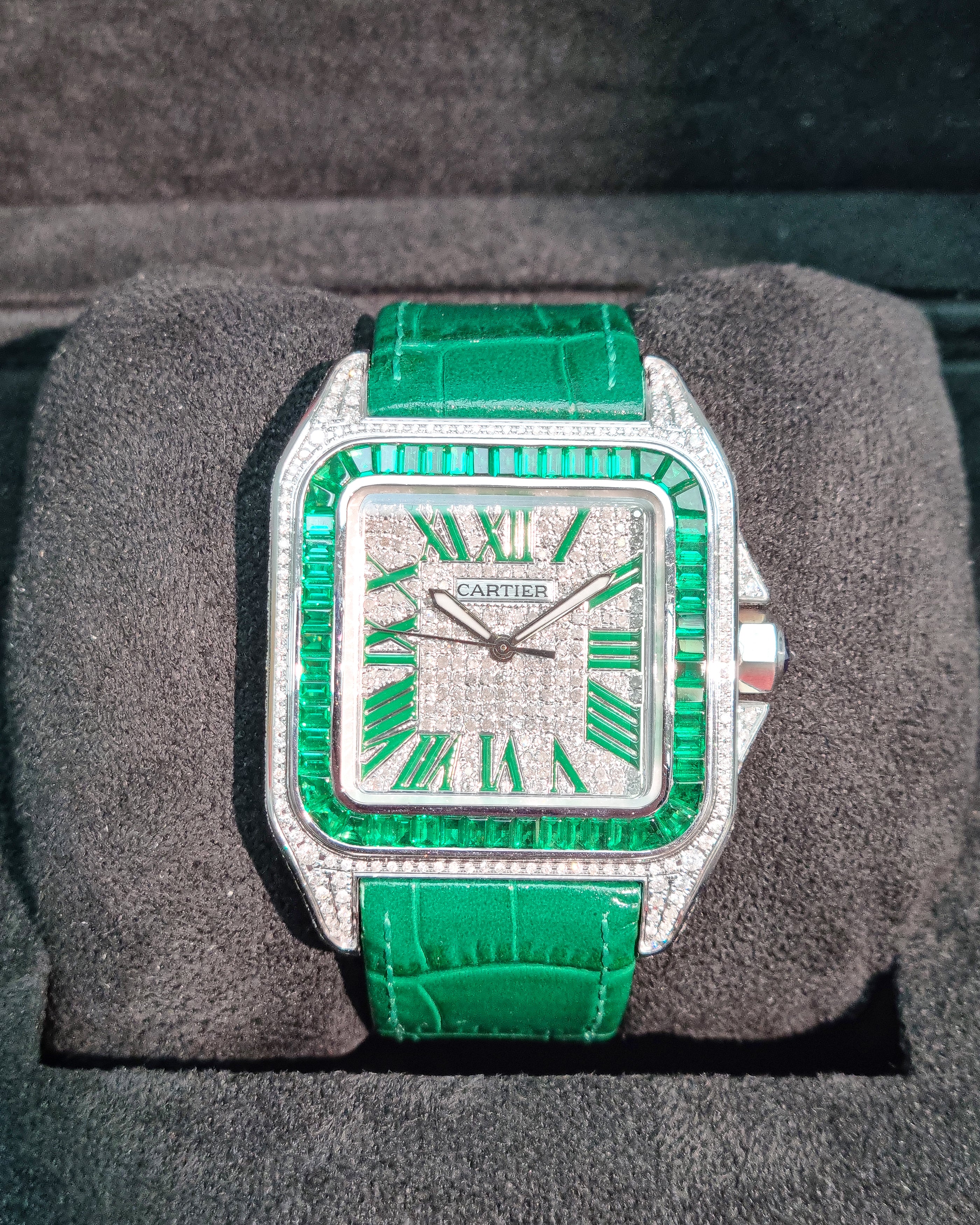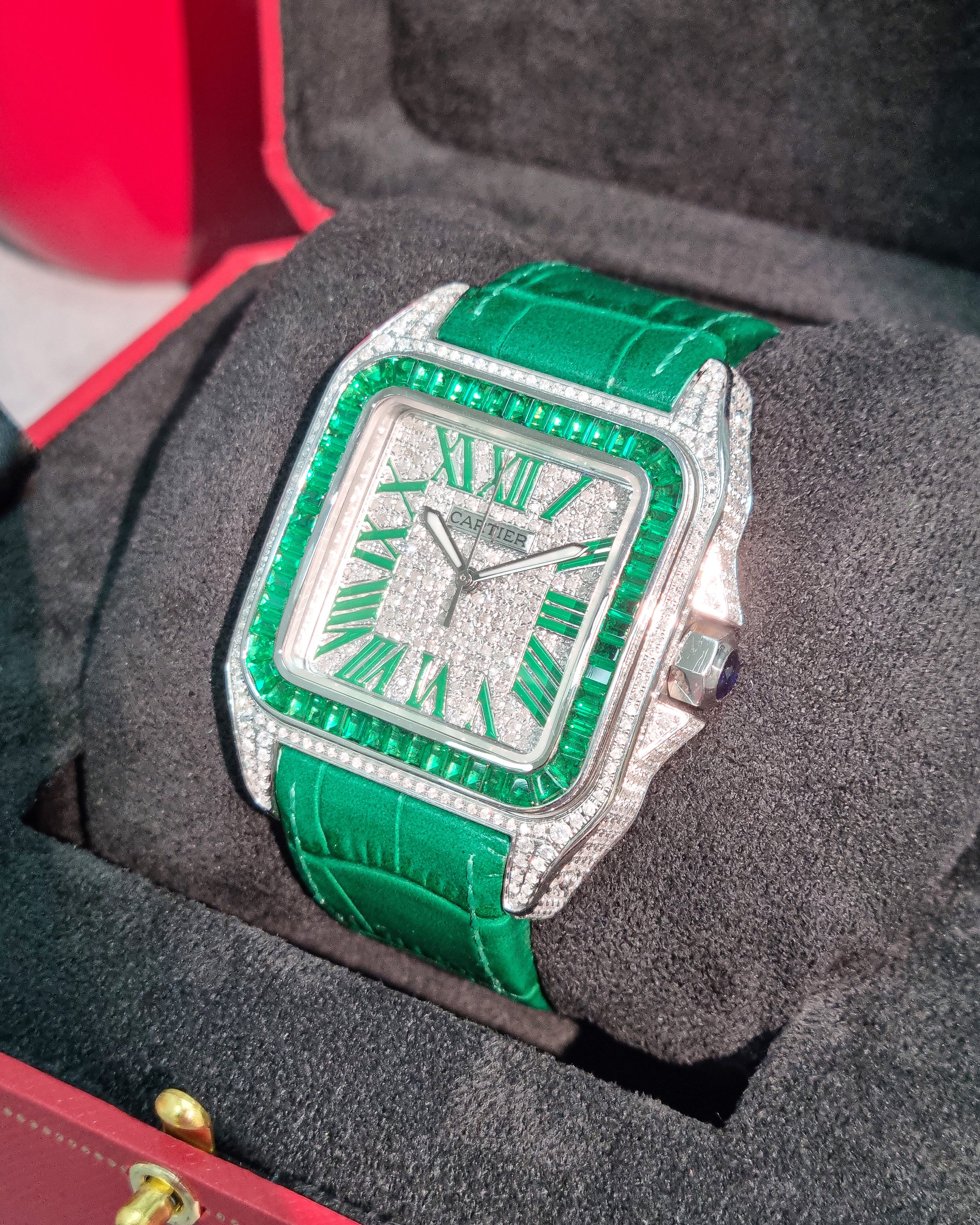 A striking and luxurious Cartier Santos 100, combining iconic design with dazzling custom diamond details for a truly standout look.