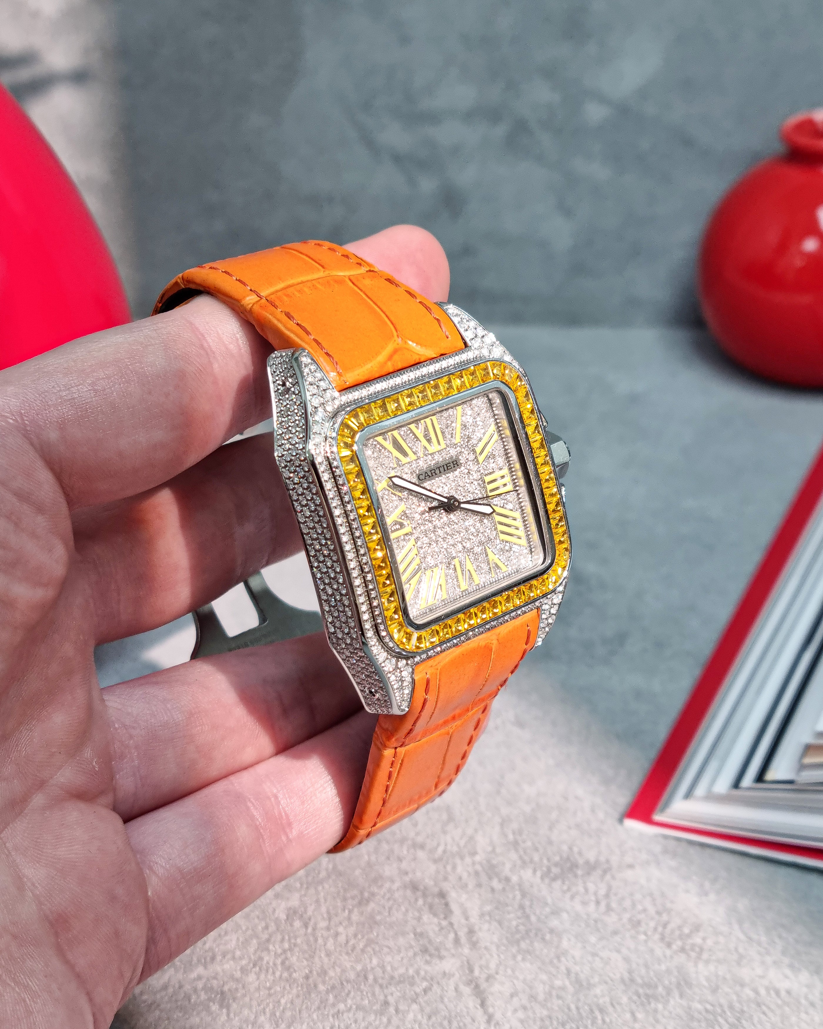 Cartier Santos 100 W20106X8 (2016) – A bold 38mm x 51mm stainless steel timepiece featuring a custom diamond-set dial with Orange Roman numerals and a matching diamond-set bezel. Fitted with an orange leather strap and stainless steel clasp accented with custom diamonds. Powered by a quartz movement. Supplied with box and papers. In very good condition. Cat No. 0938.