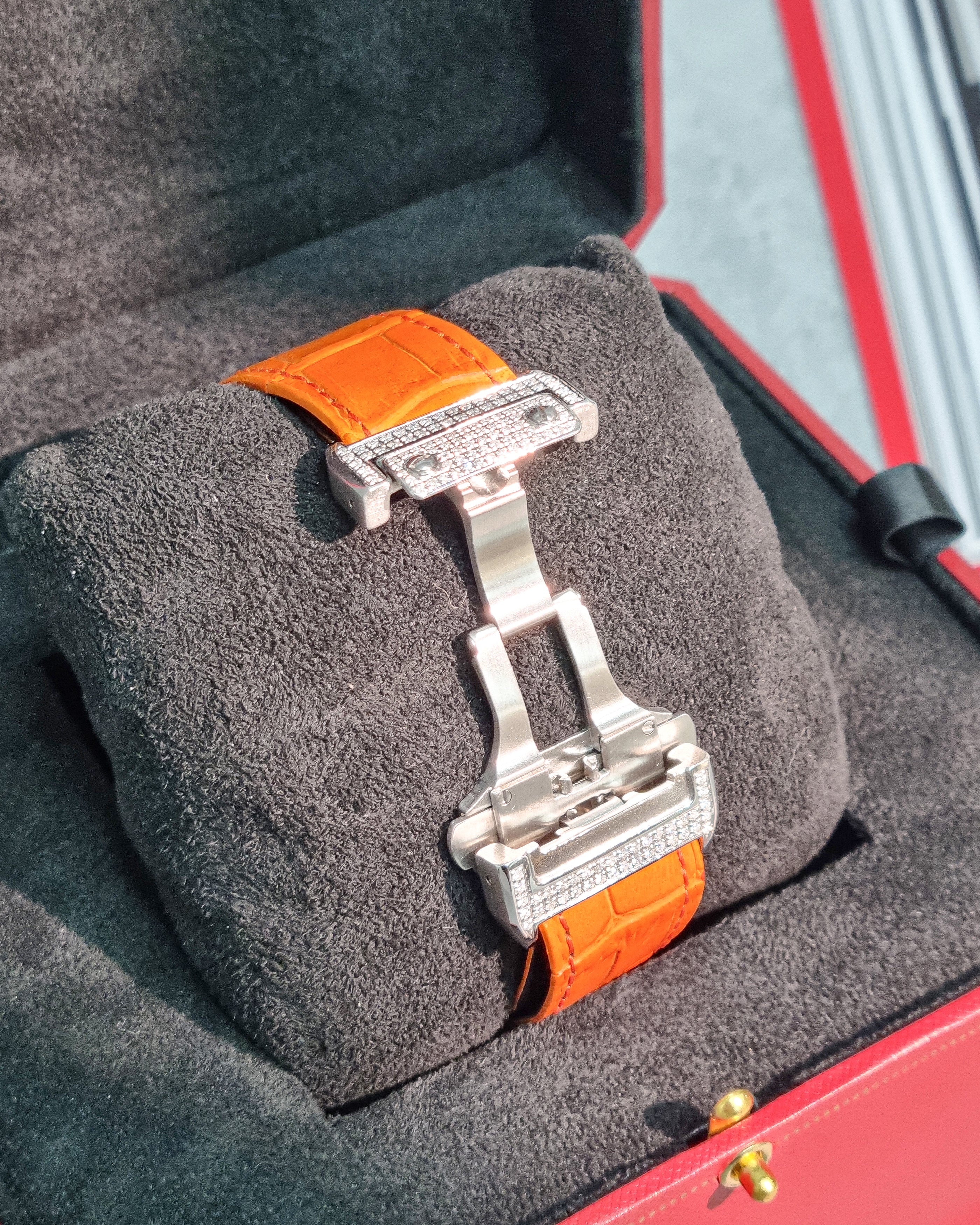 Bracelet/Strap: Orange Leather strap with stainless steel and custom diamond clasp