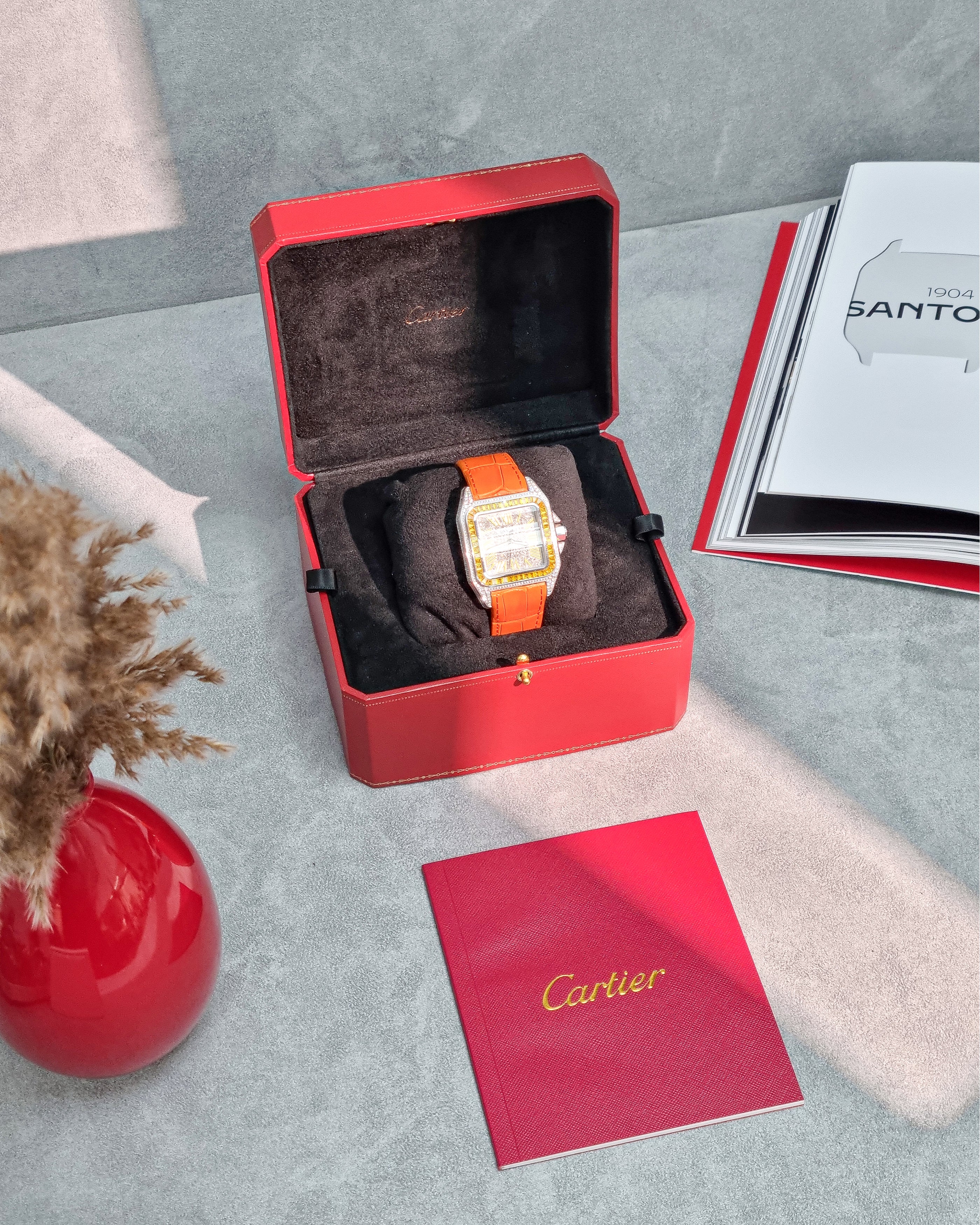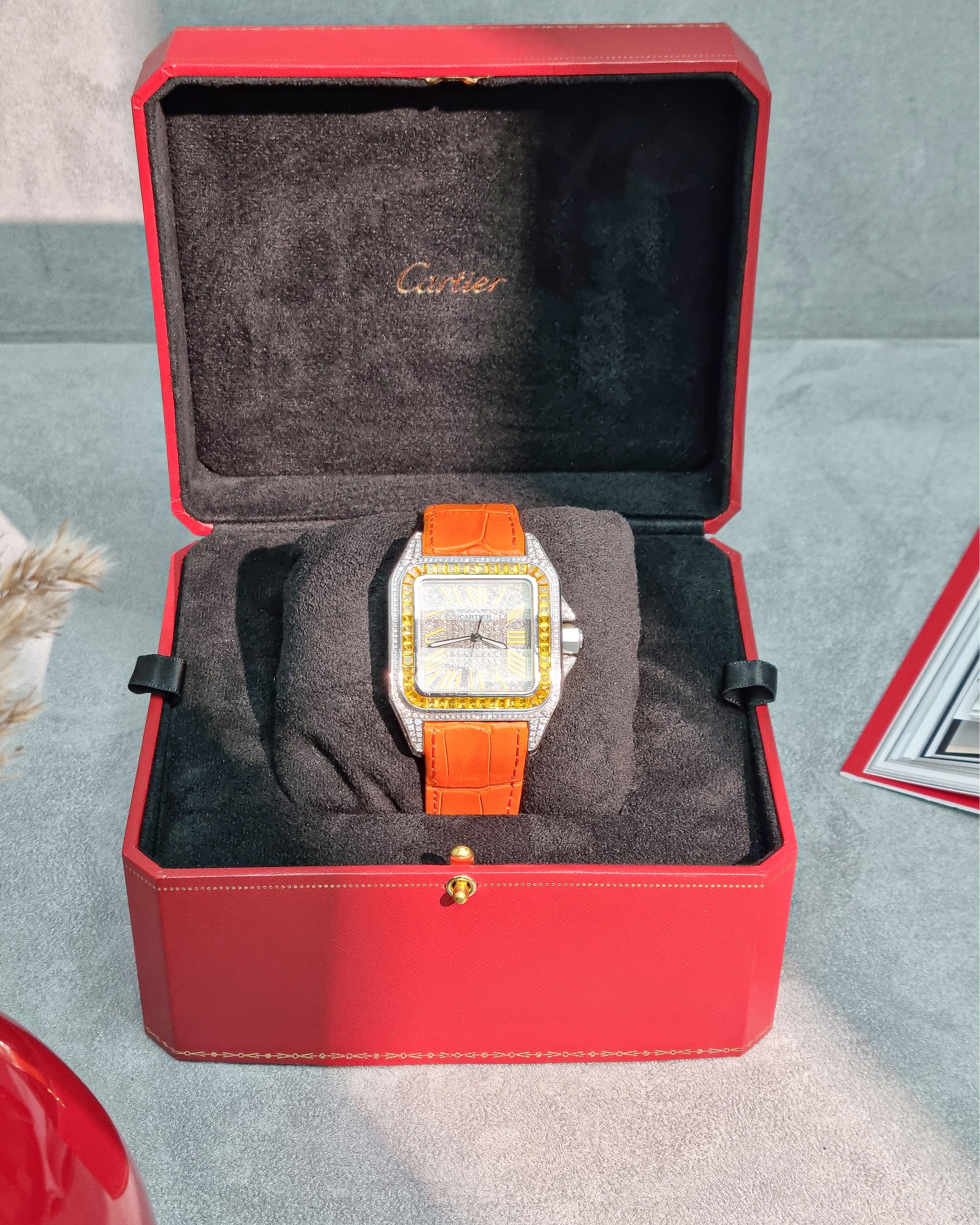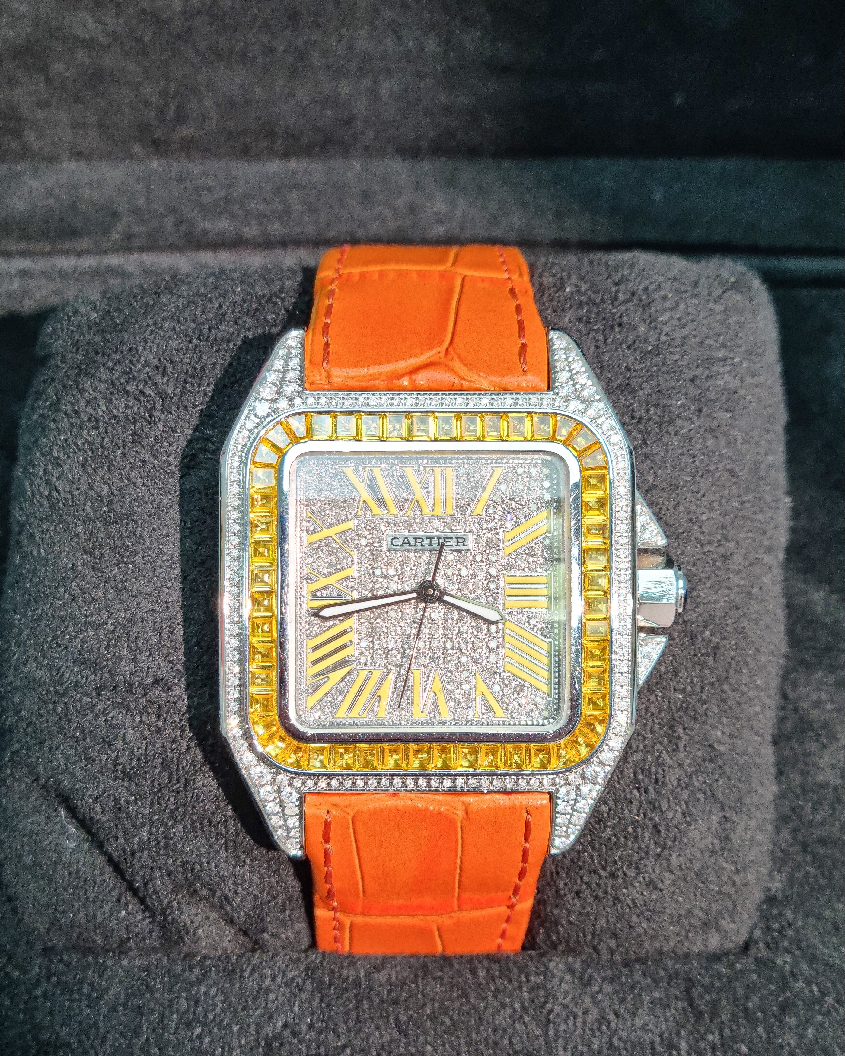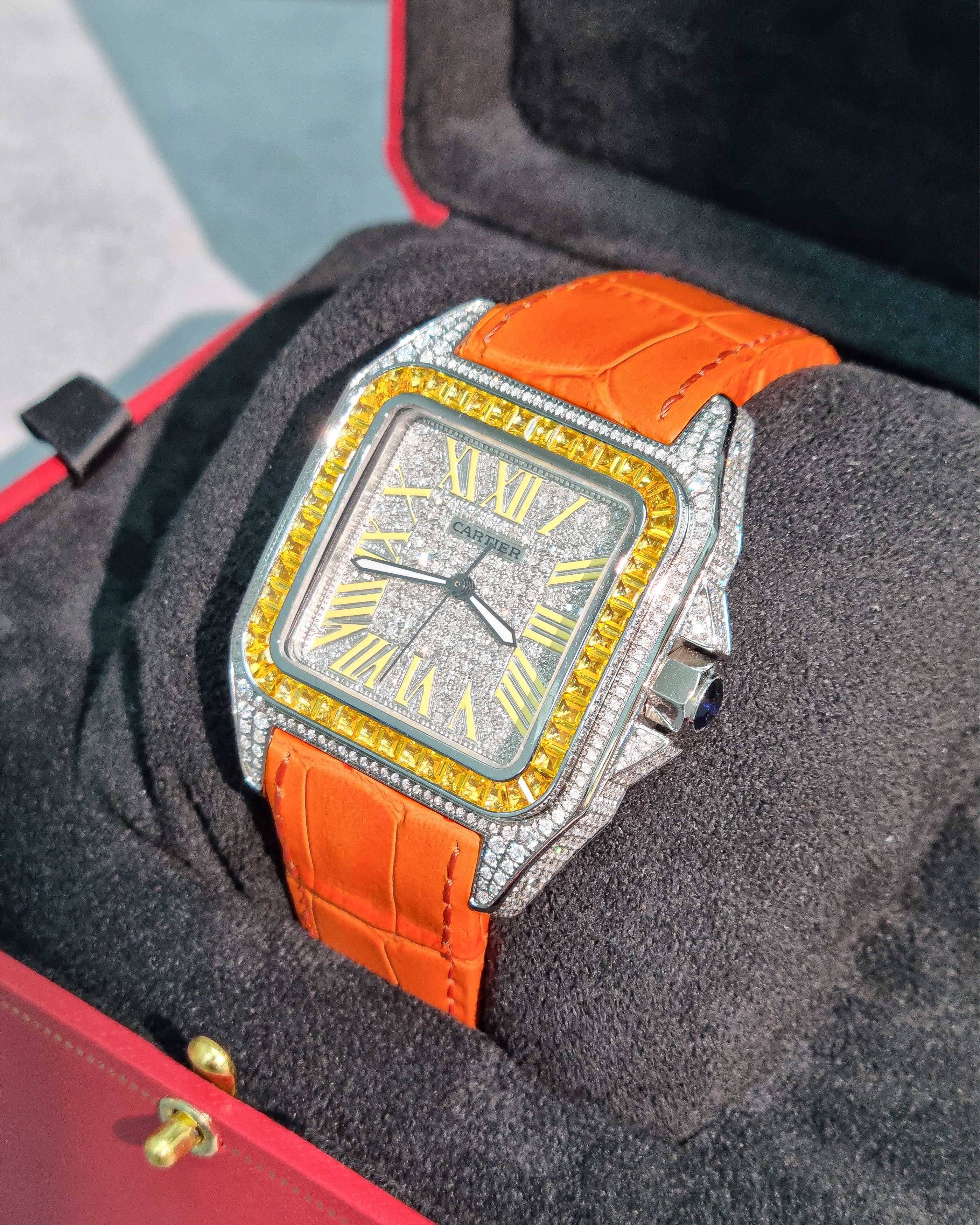 A striking and luxurious Cartier Santos 100, combining iconic design with dazzling custom diamond details for a truly standout look.