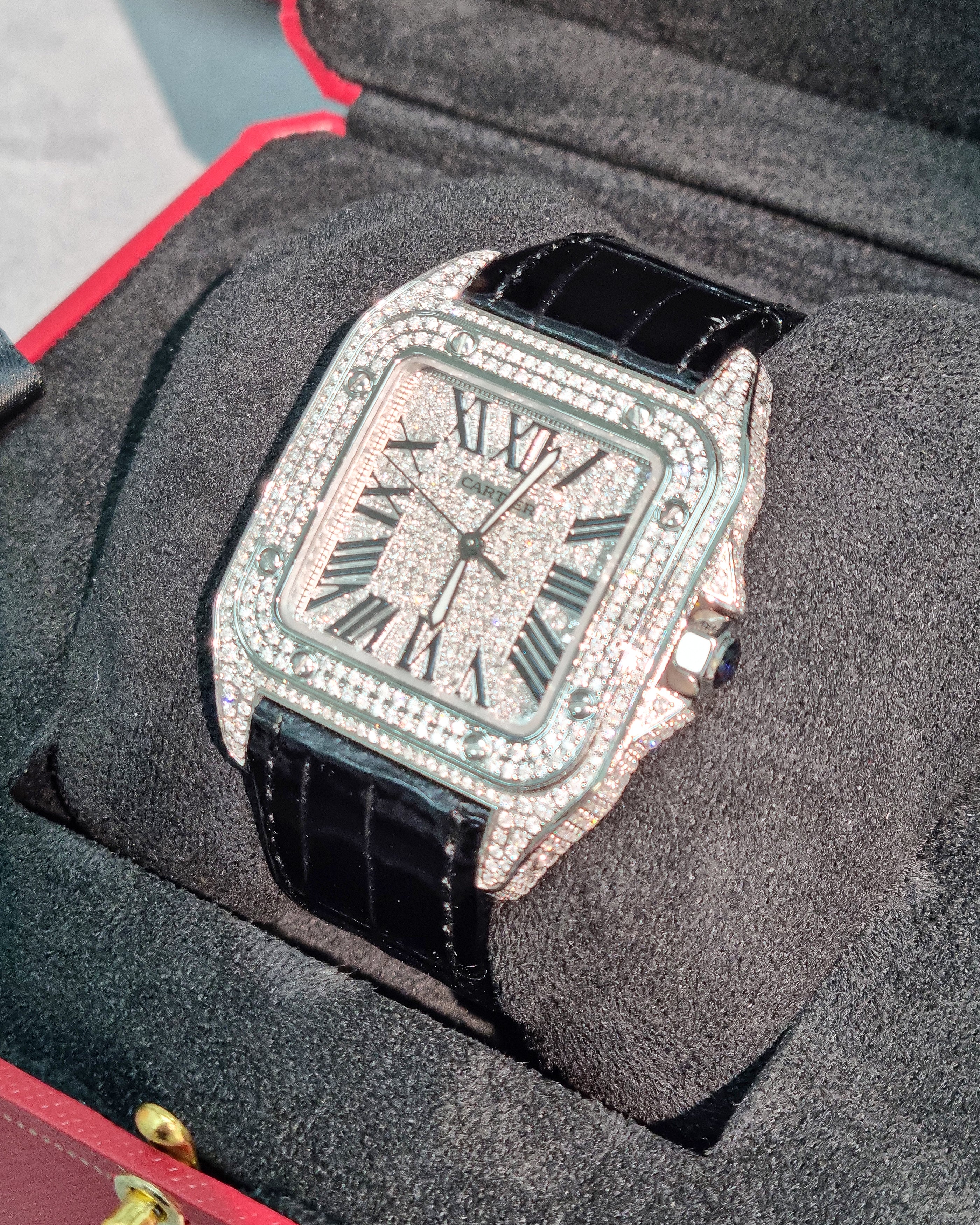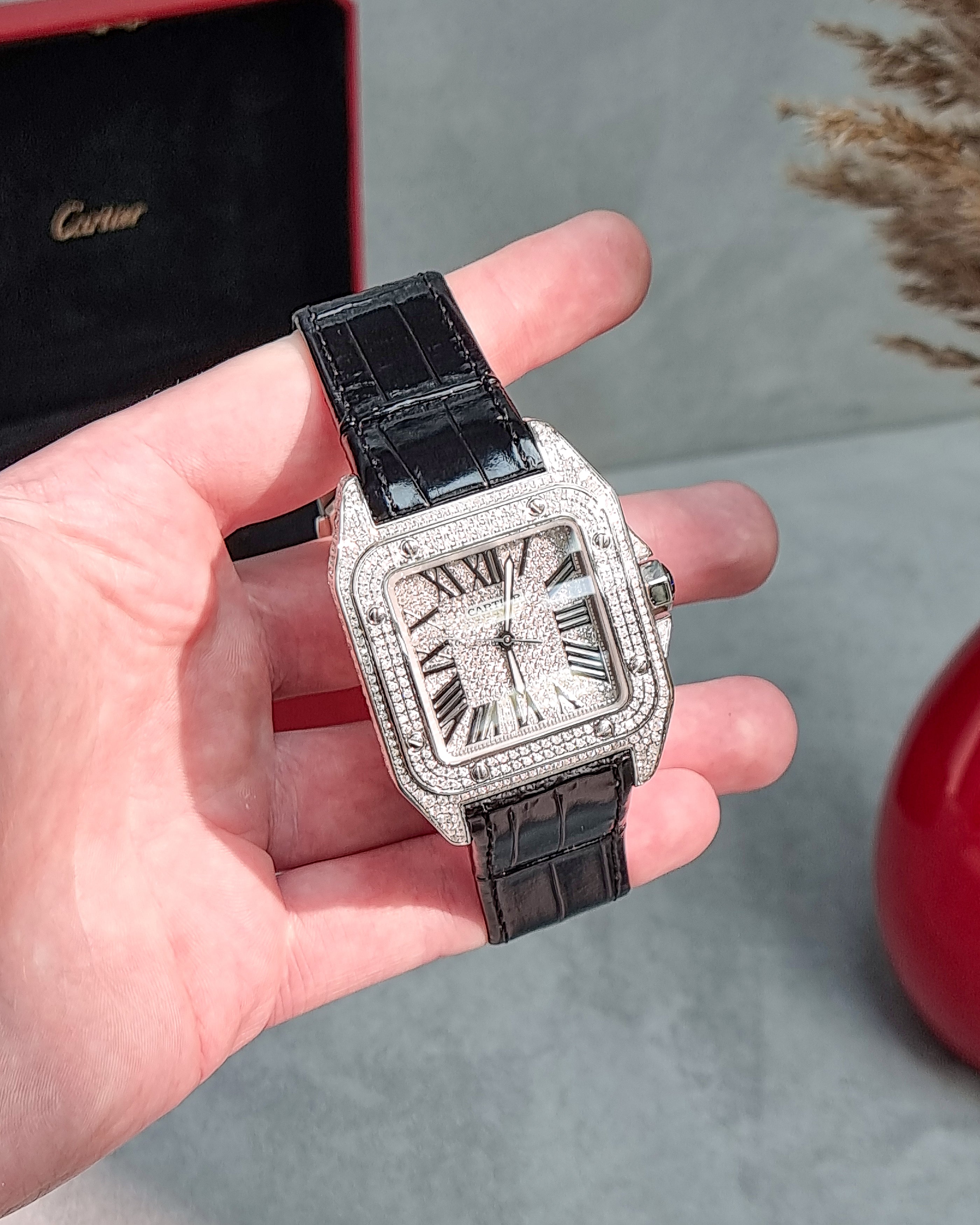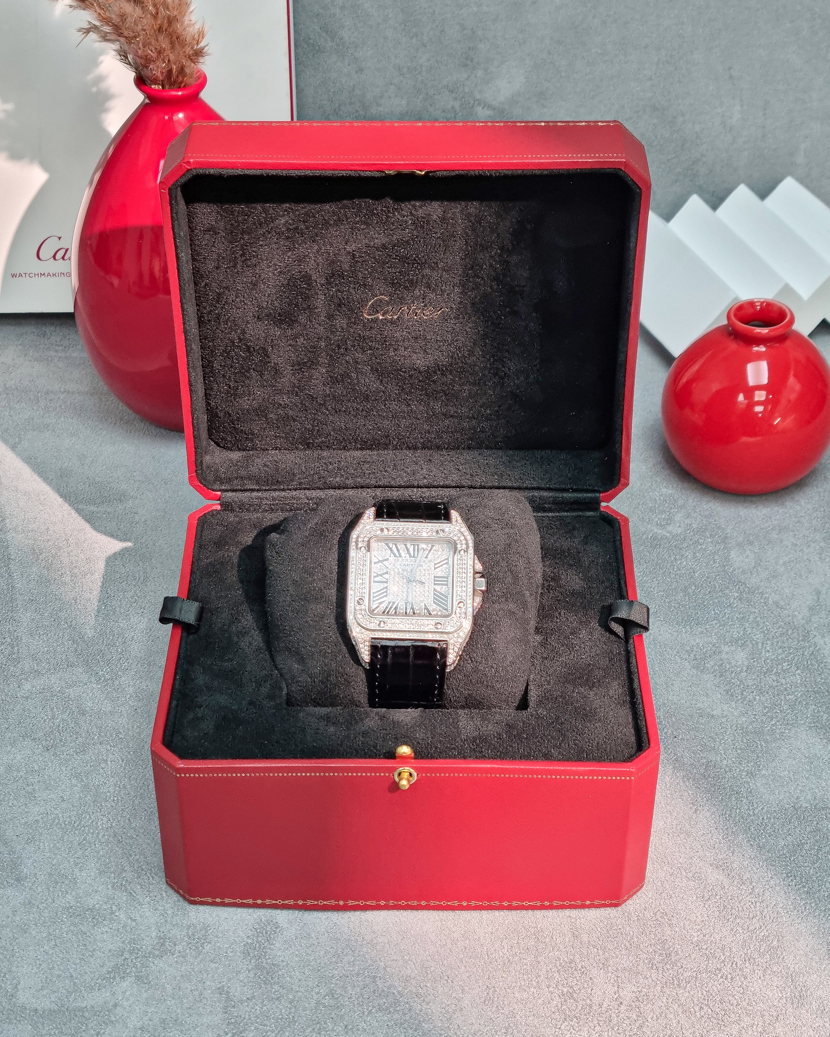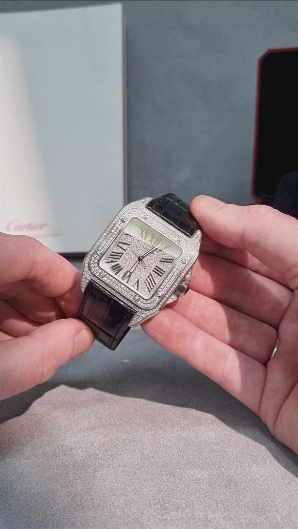A striking and luxurious Cartier Santos 100, combining iconic design with dazzling custom diamond details for a truly standout look.