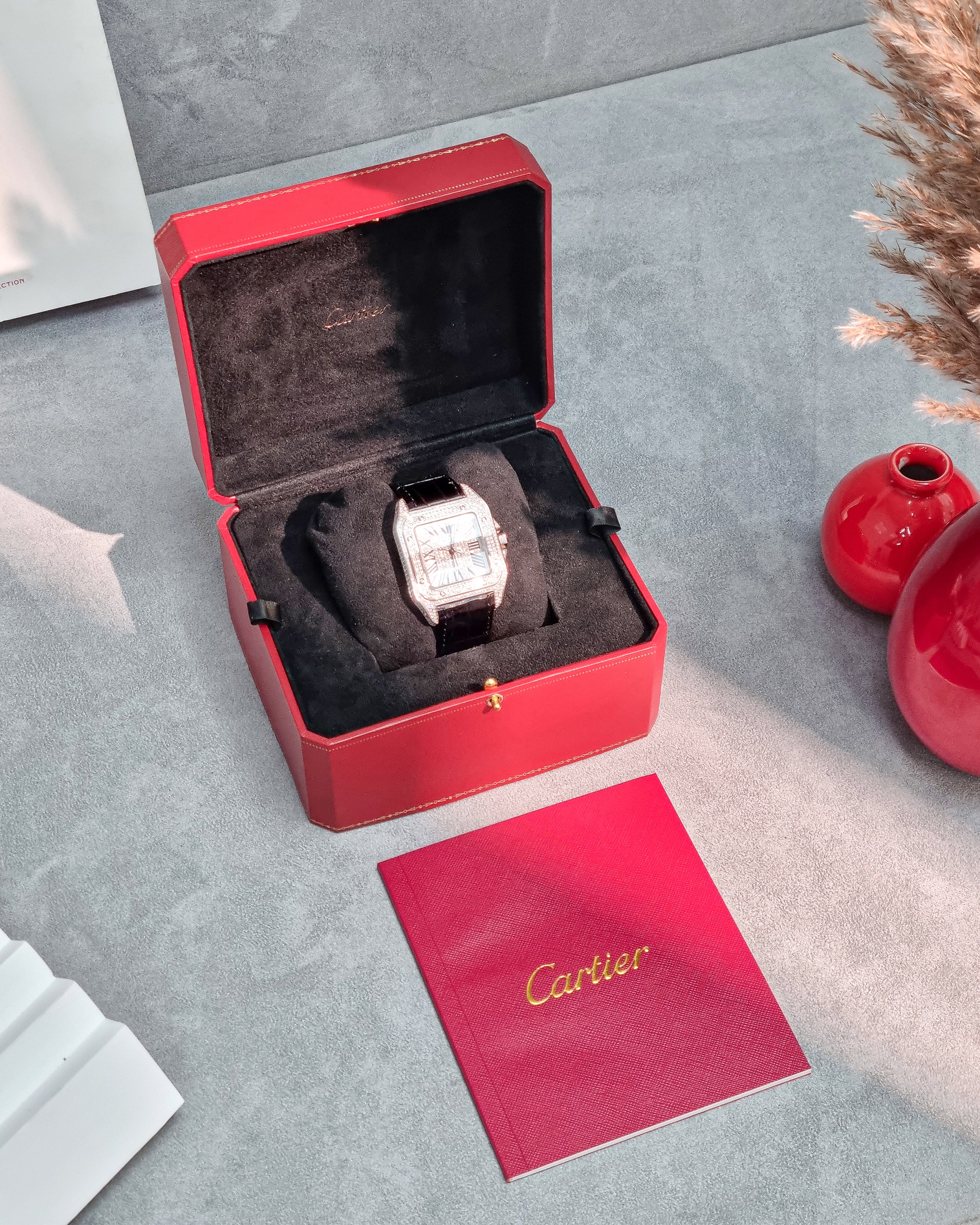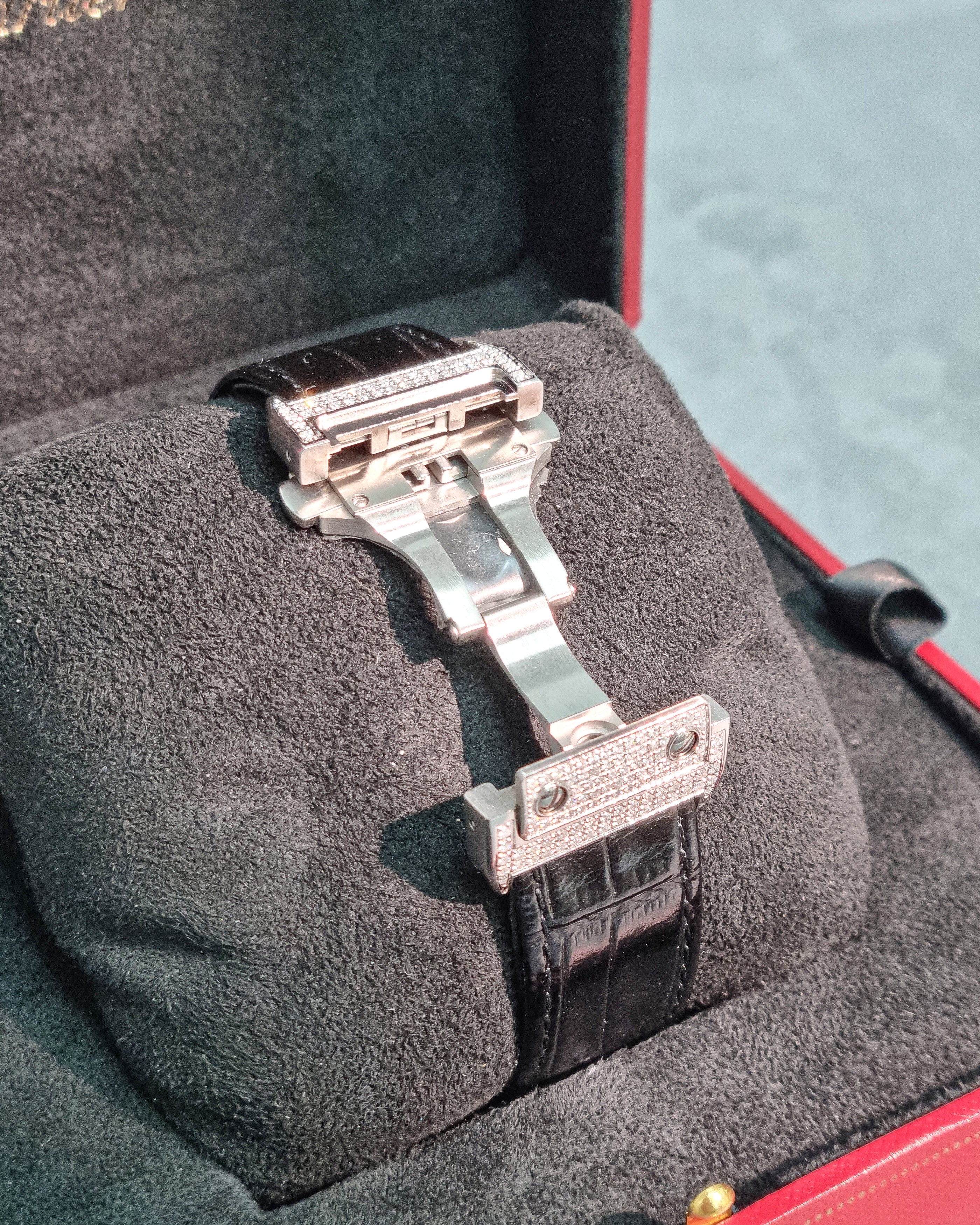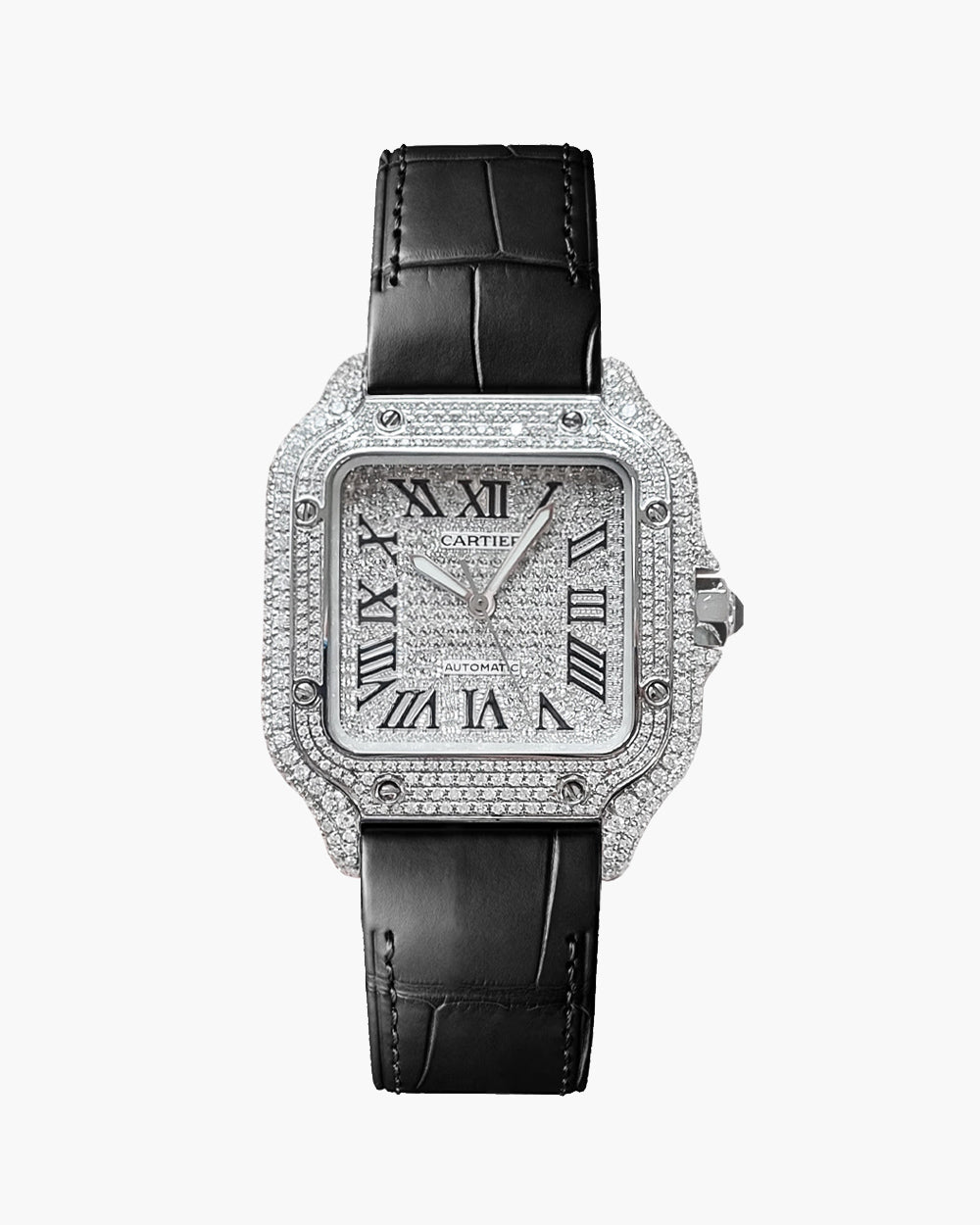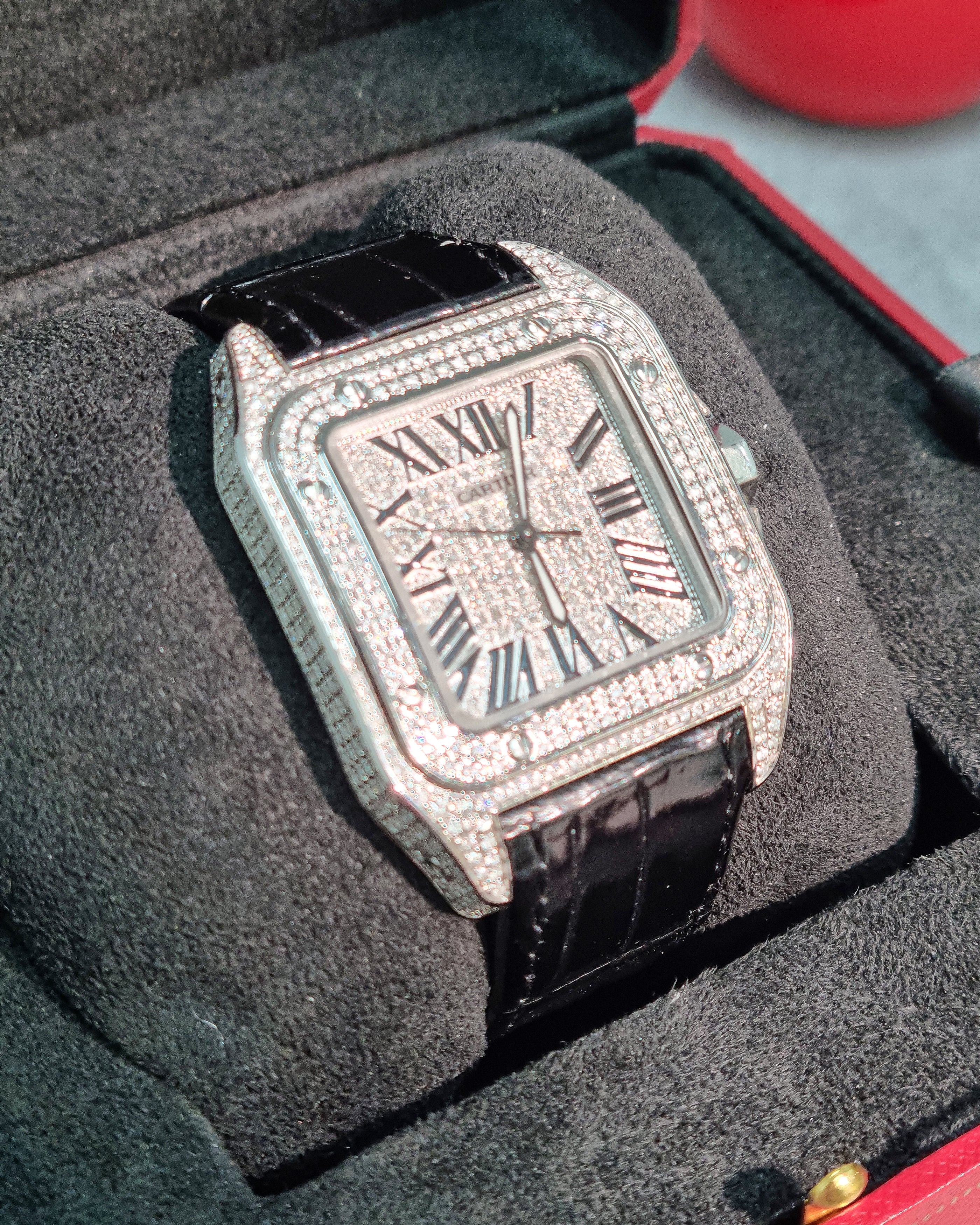 A striking and luxurious Cartier Santos 100, combining iconic design with dazzling custom diamond details for a truly standout look.