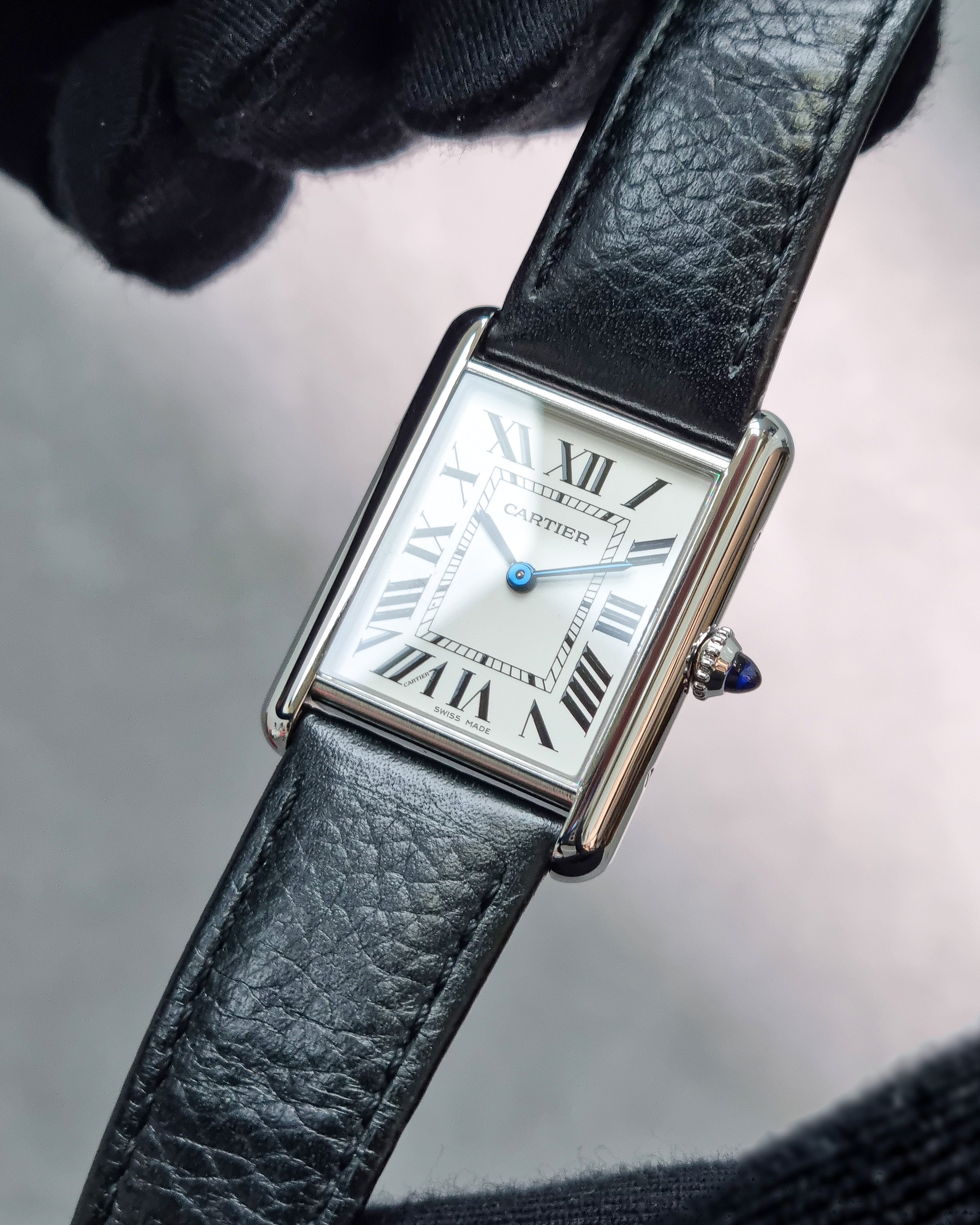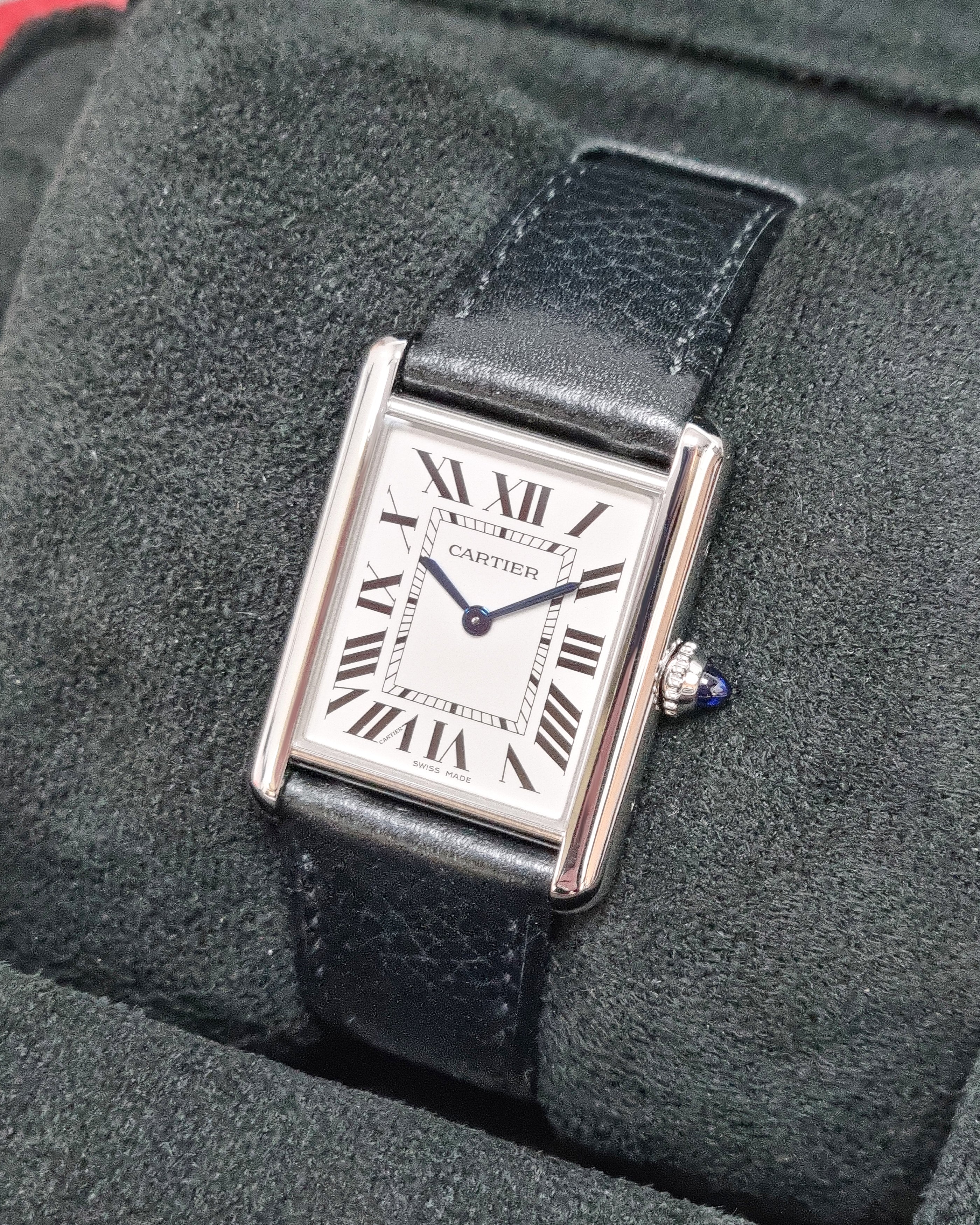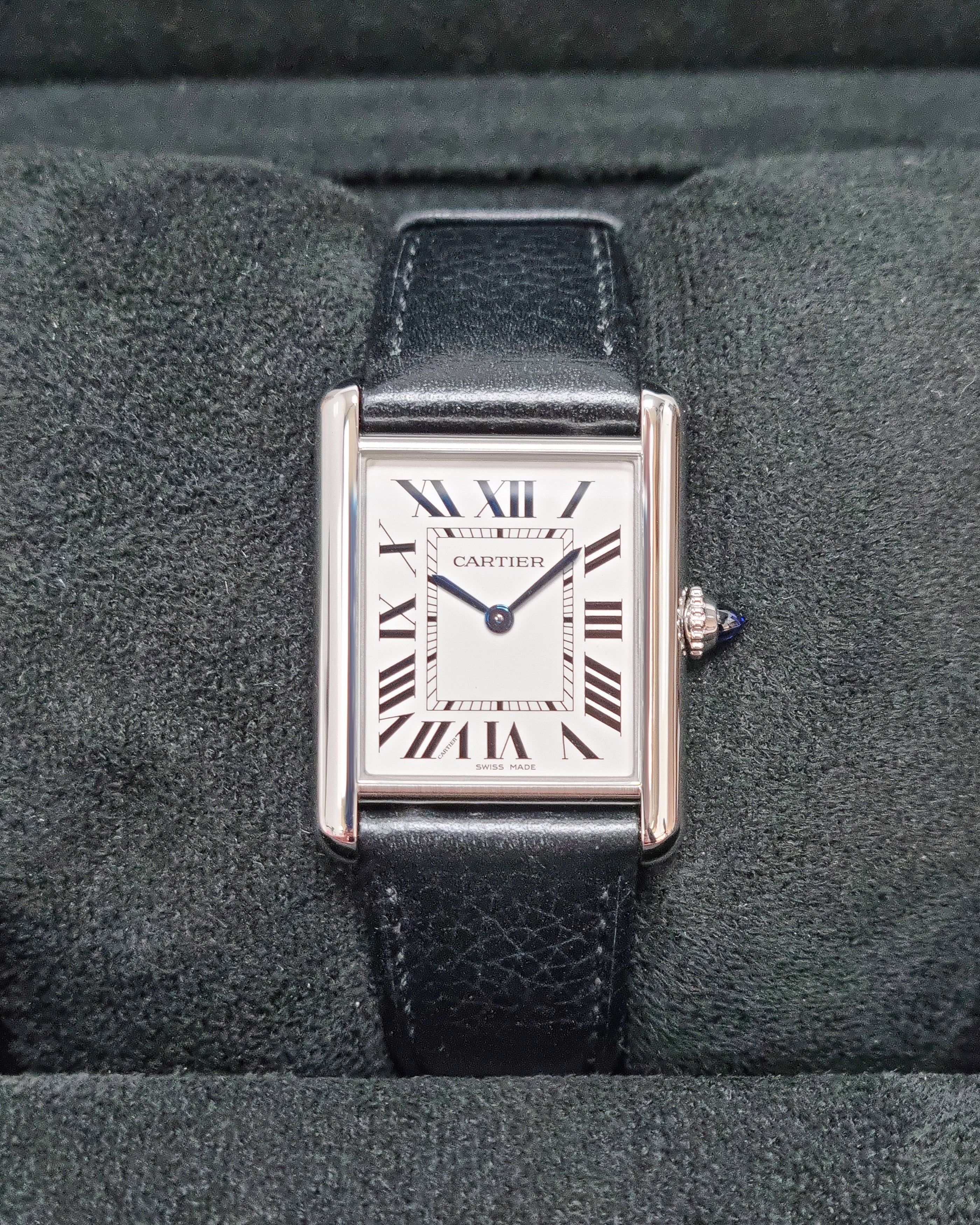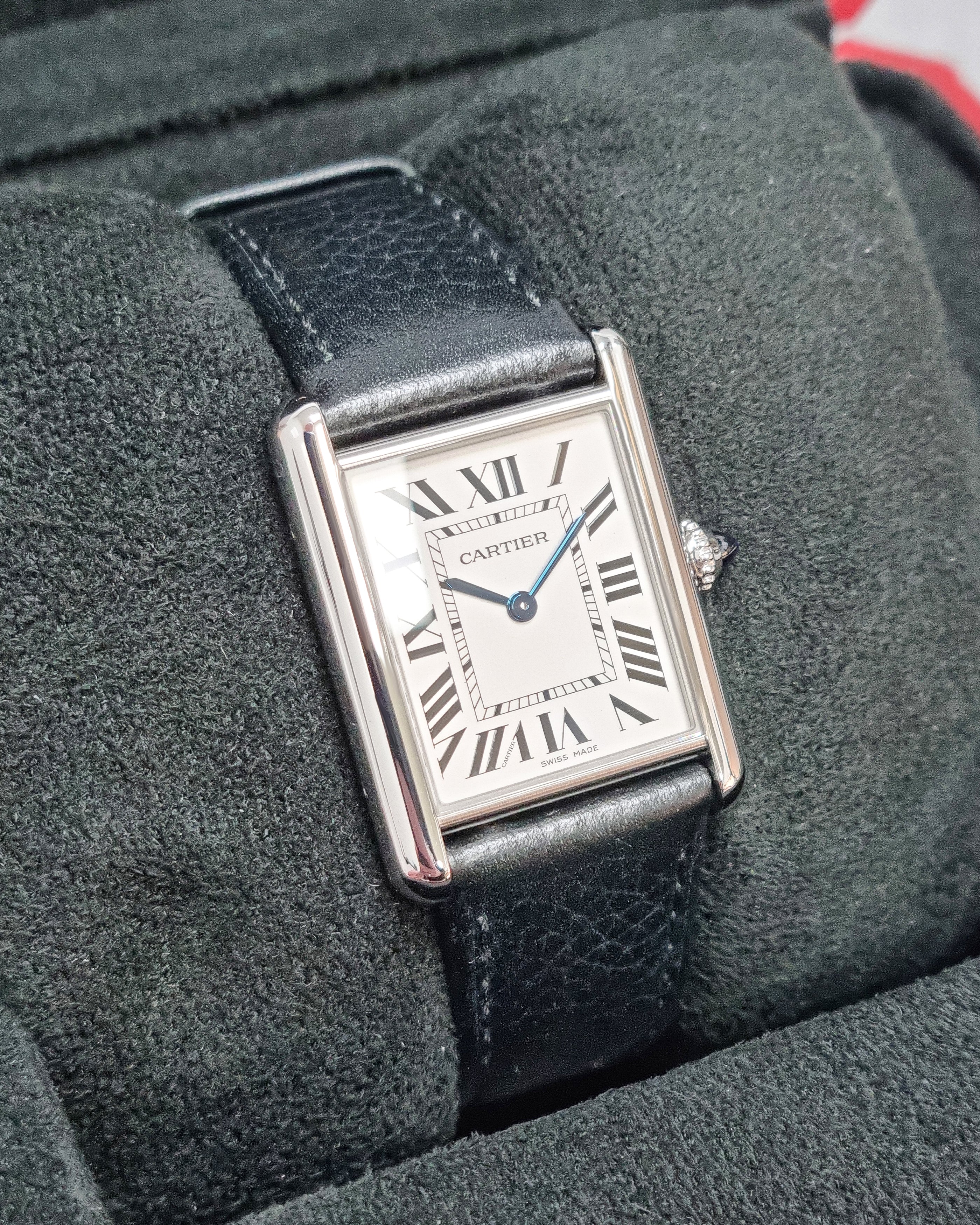 Cartier Tank Must WSTA0041 (2021) – A modern interpretation of the iconic Tank, this 33.7mm timepiece features a stainless steel case paired with a white dial with Roman numerals. Powered by a reliable quartz movement, it offers precision with classic Cartier elegance.