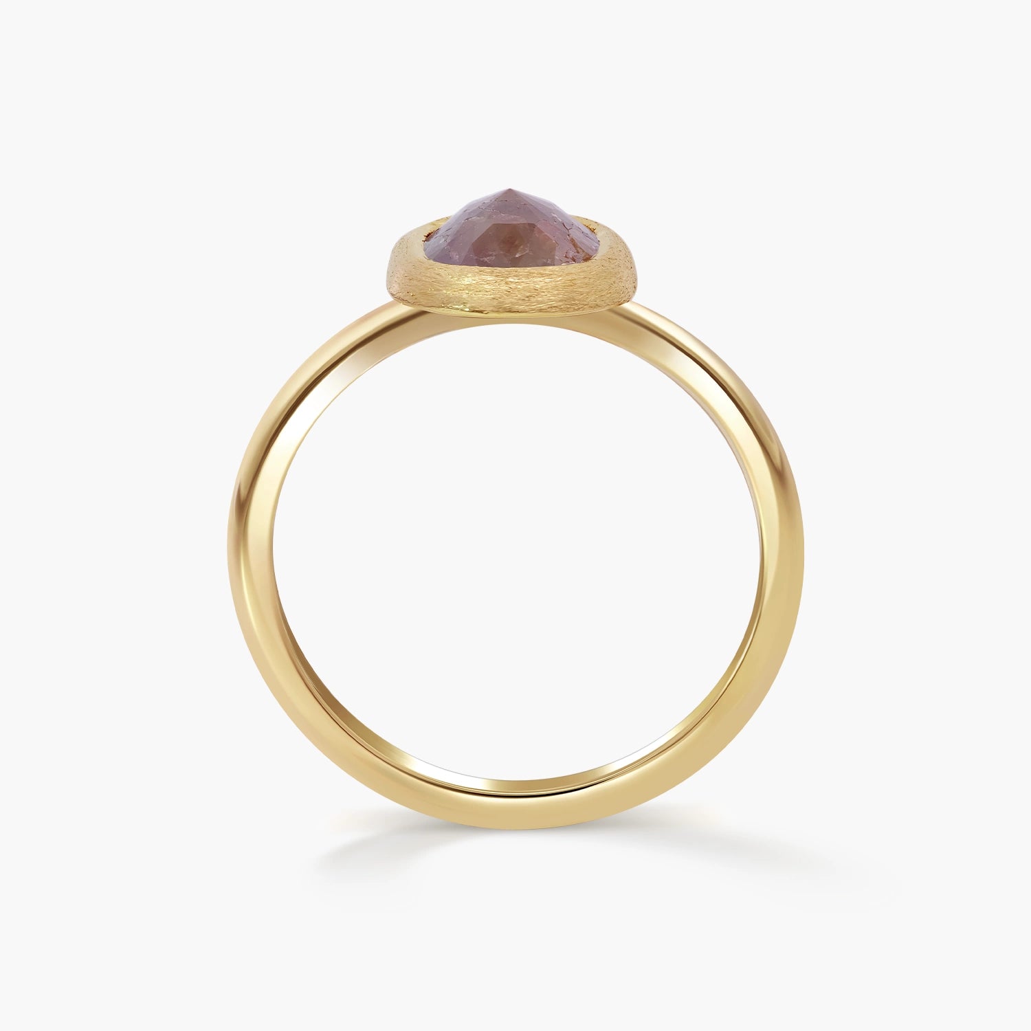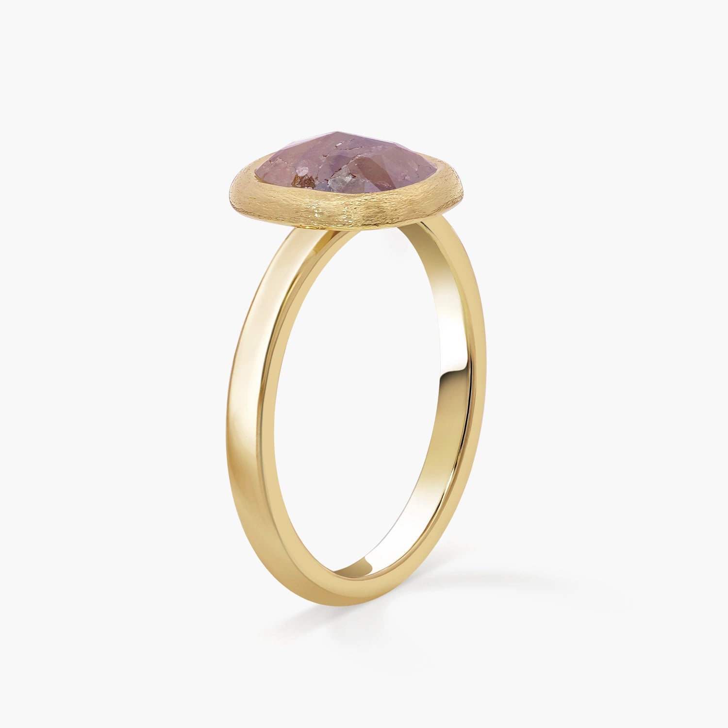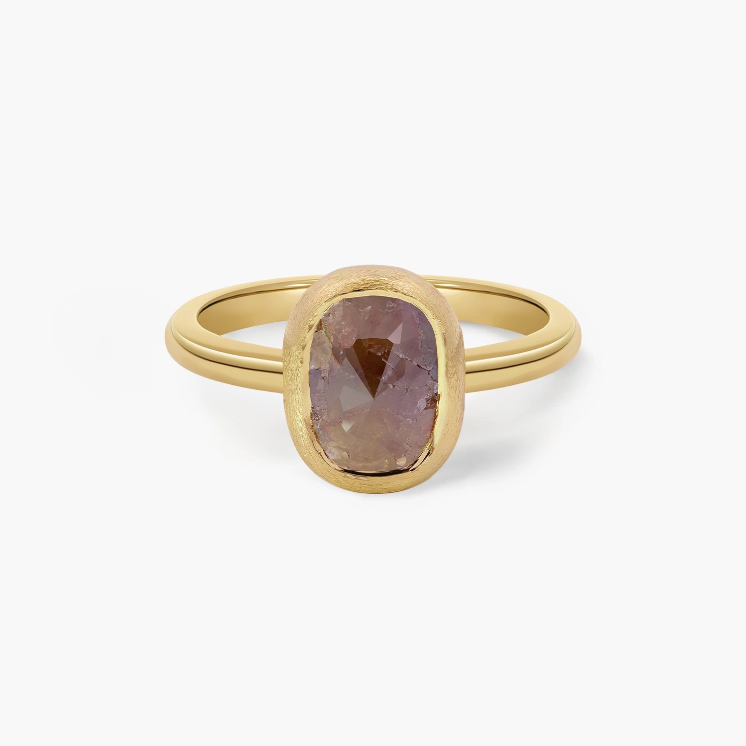 An 18kt yellow gold ring featuring a natural brown rose-cut cushion diamond stone in a brushed gold bezel, contrasted by a polished band for a contemporary, textured finish. Its warm tones and unique cut create a modern yet organic statement.