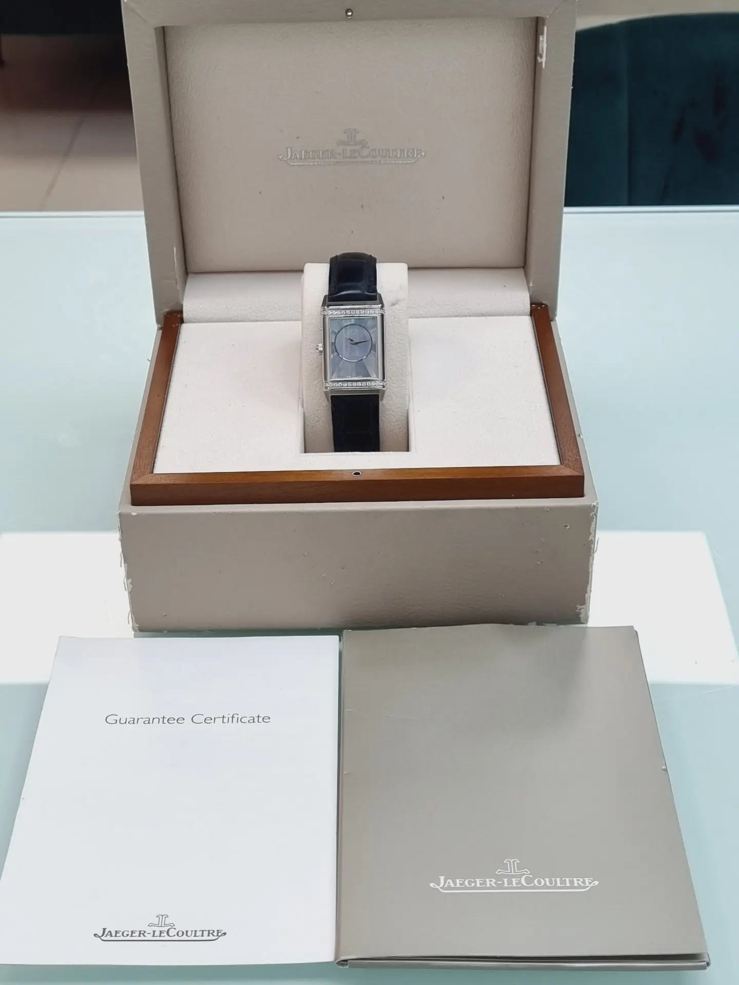Jaeger-LeCoultre Reverso Q3308421 (2015) – A distinguished 40mm x 24mm rectangular timepiece featuring a silver and white dial, stainless steel case and bezel, and a classic black leather strap. Powered by a manual-winding movement. Supplied with original box and papers. In very good condition. Cat No. 0751.