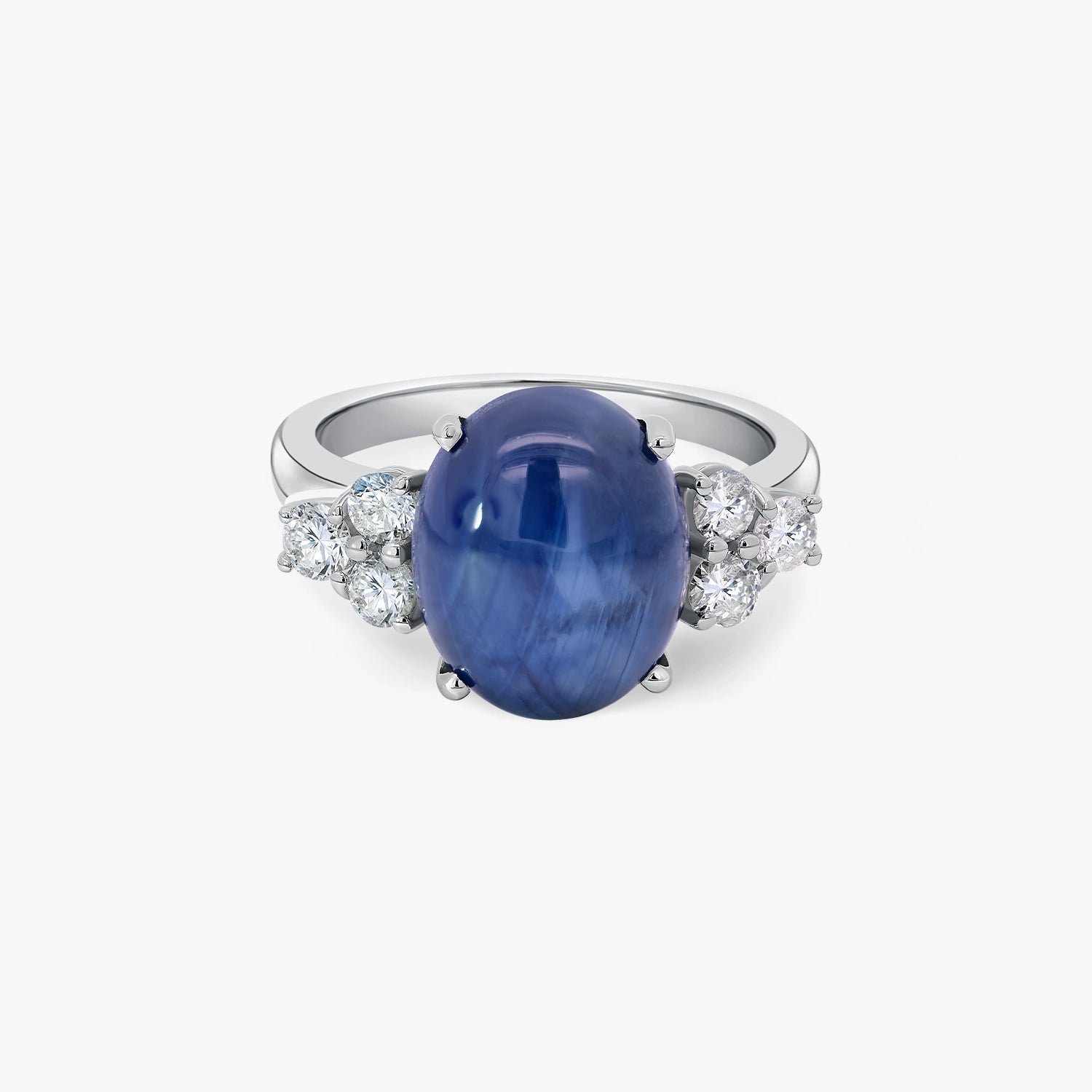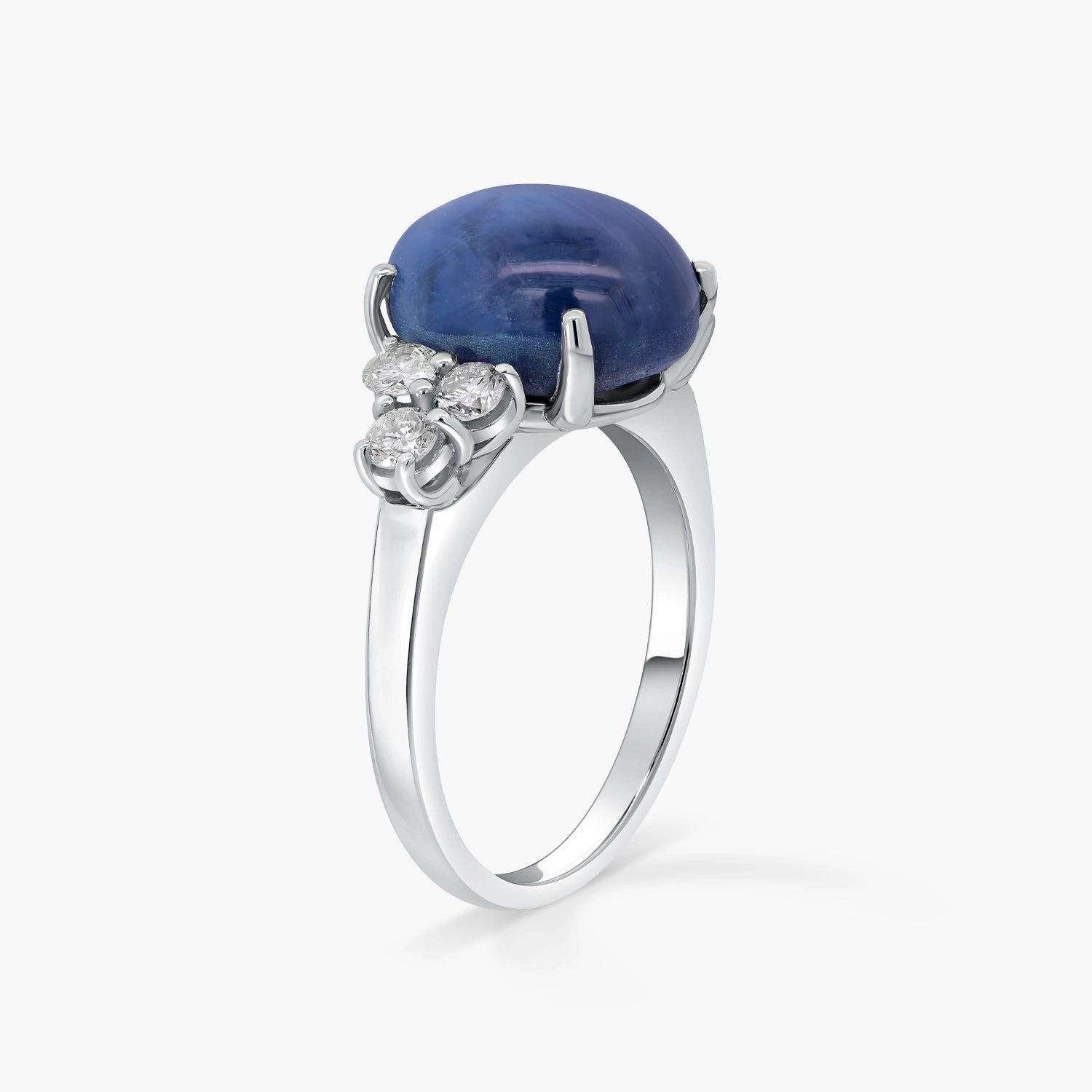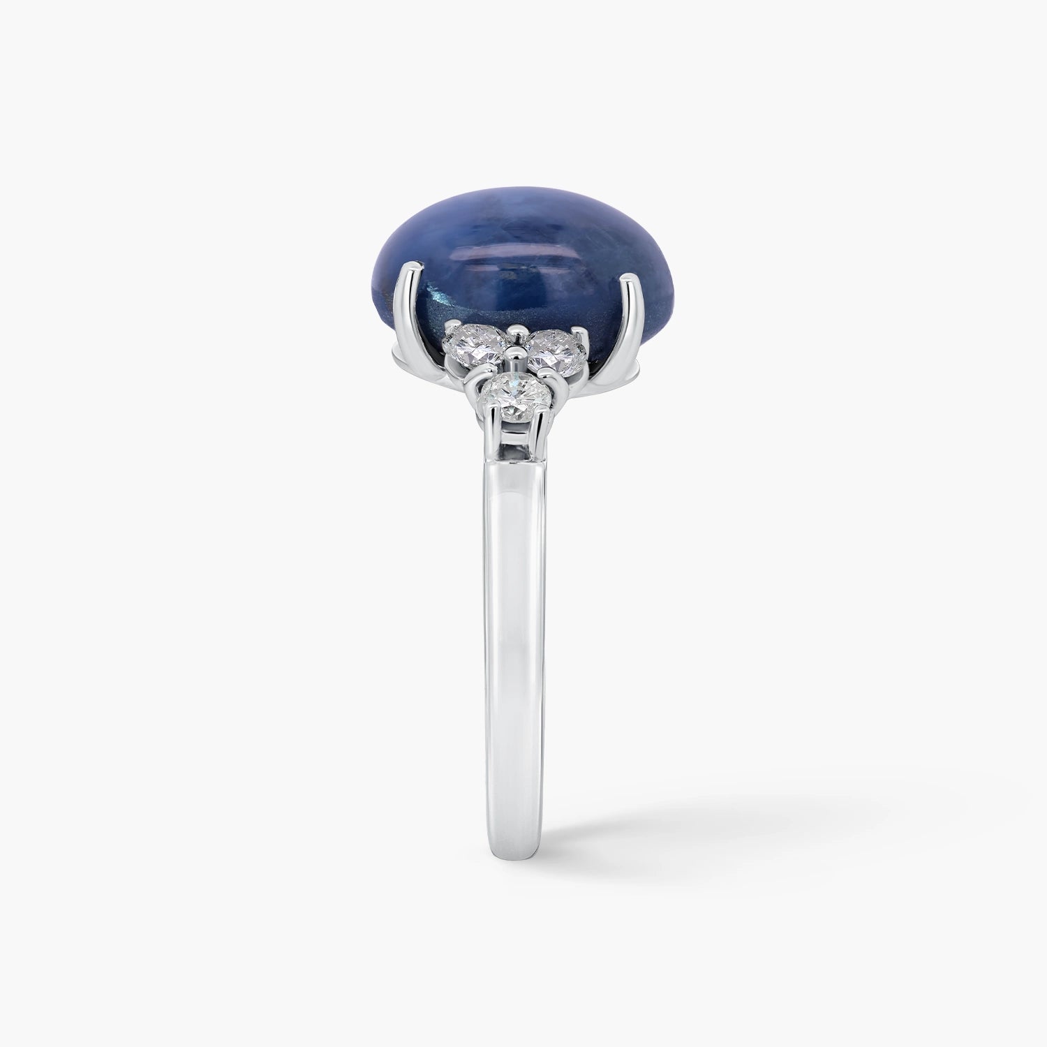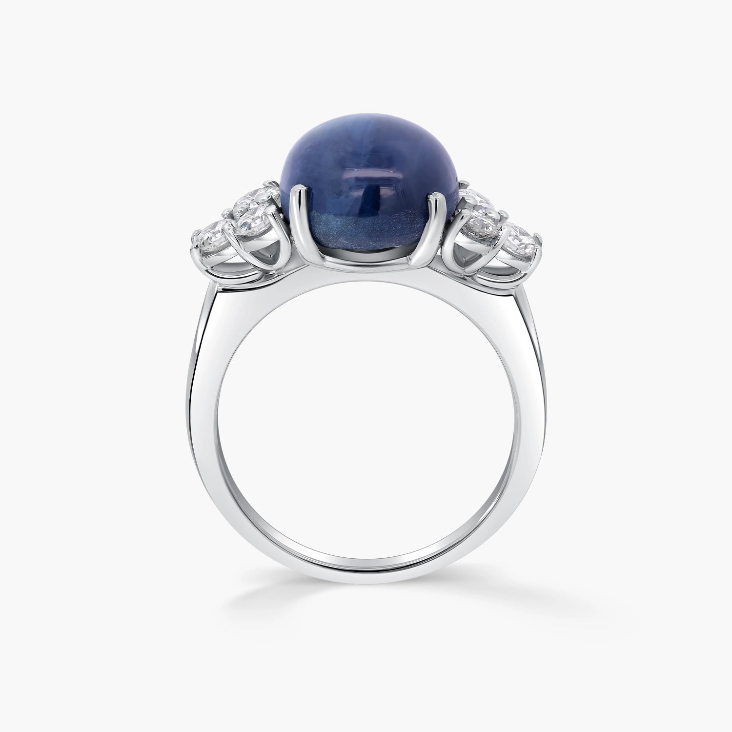 A striking 18kt white gold ring, featuring a commanding 4.00ct cabochon sapphire flanked by 1.20ct of sparkling natural diamonds for a bold, regal statement.