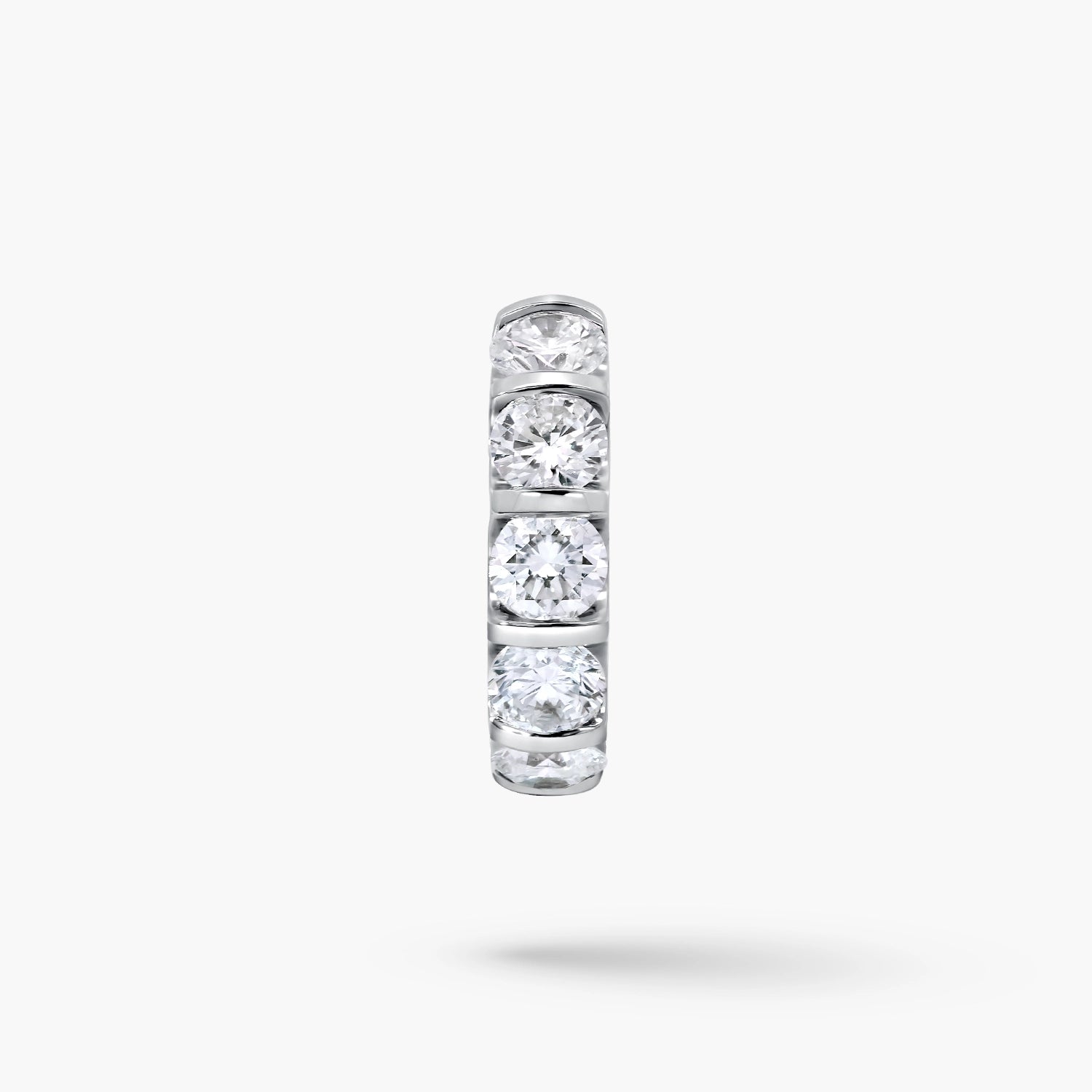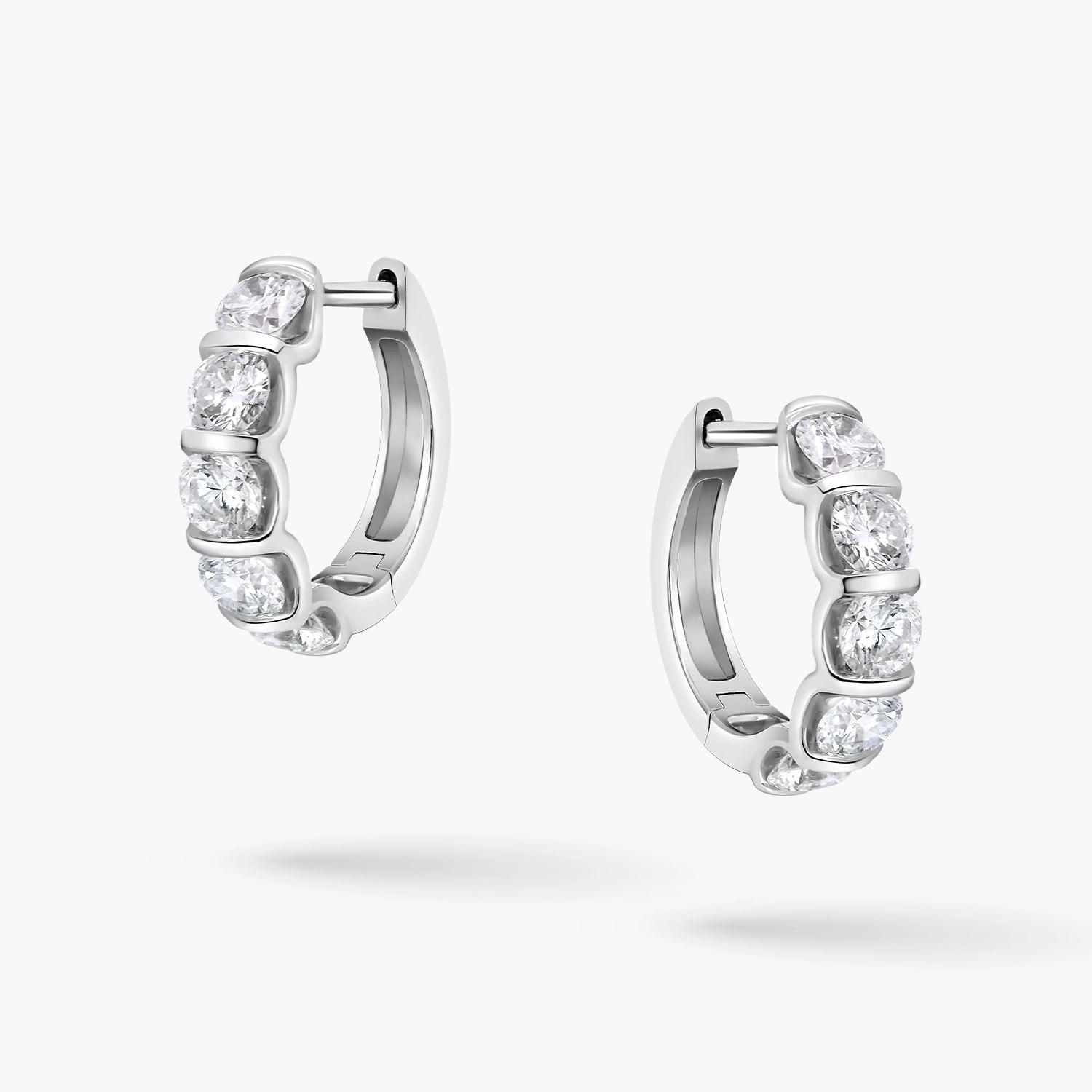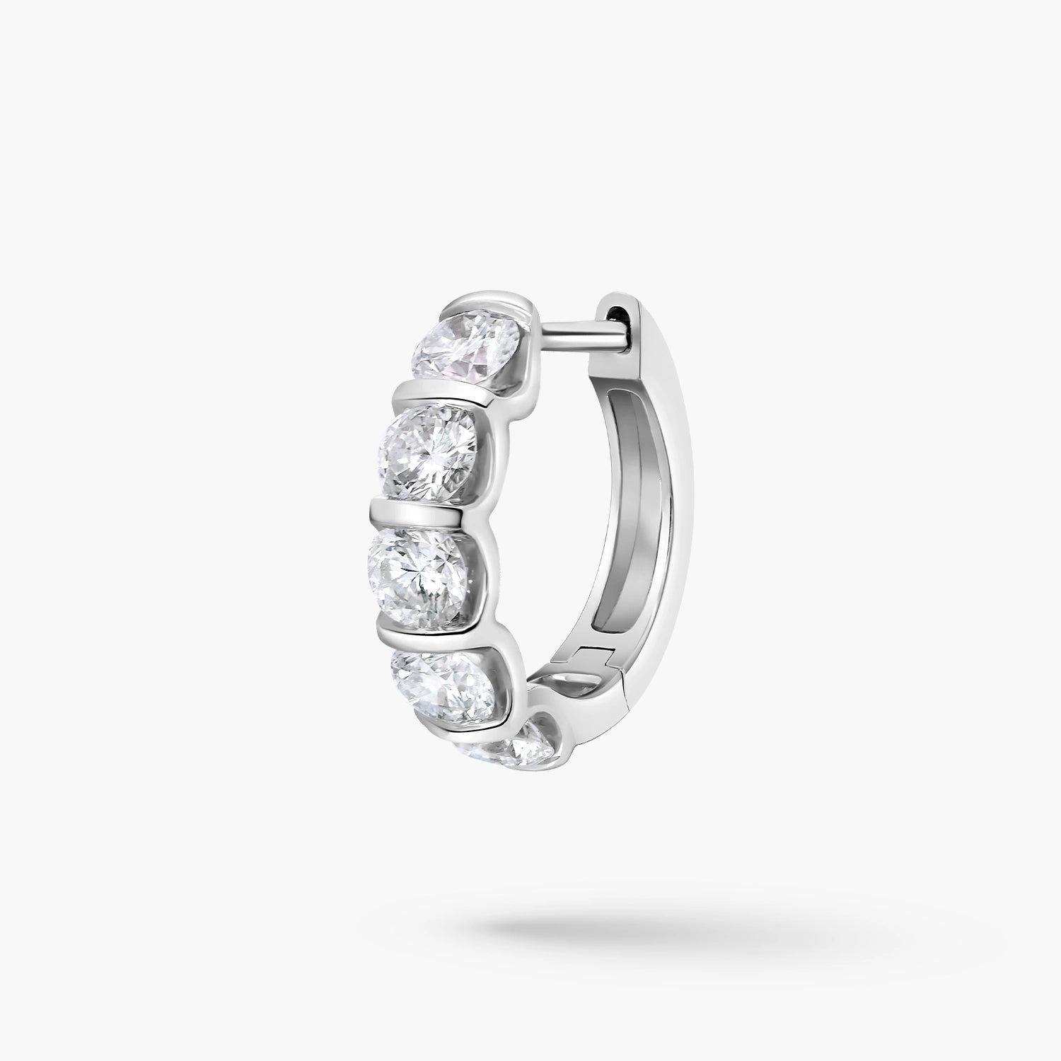 Elegant 14kt white gold small hoop earrings, each set with 5 round-cut lab-grown diamonds totaling 1.25ct. Their refined brilliance and delicate design make them a perfect touch of timeless sophistication.