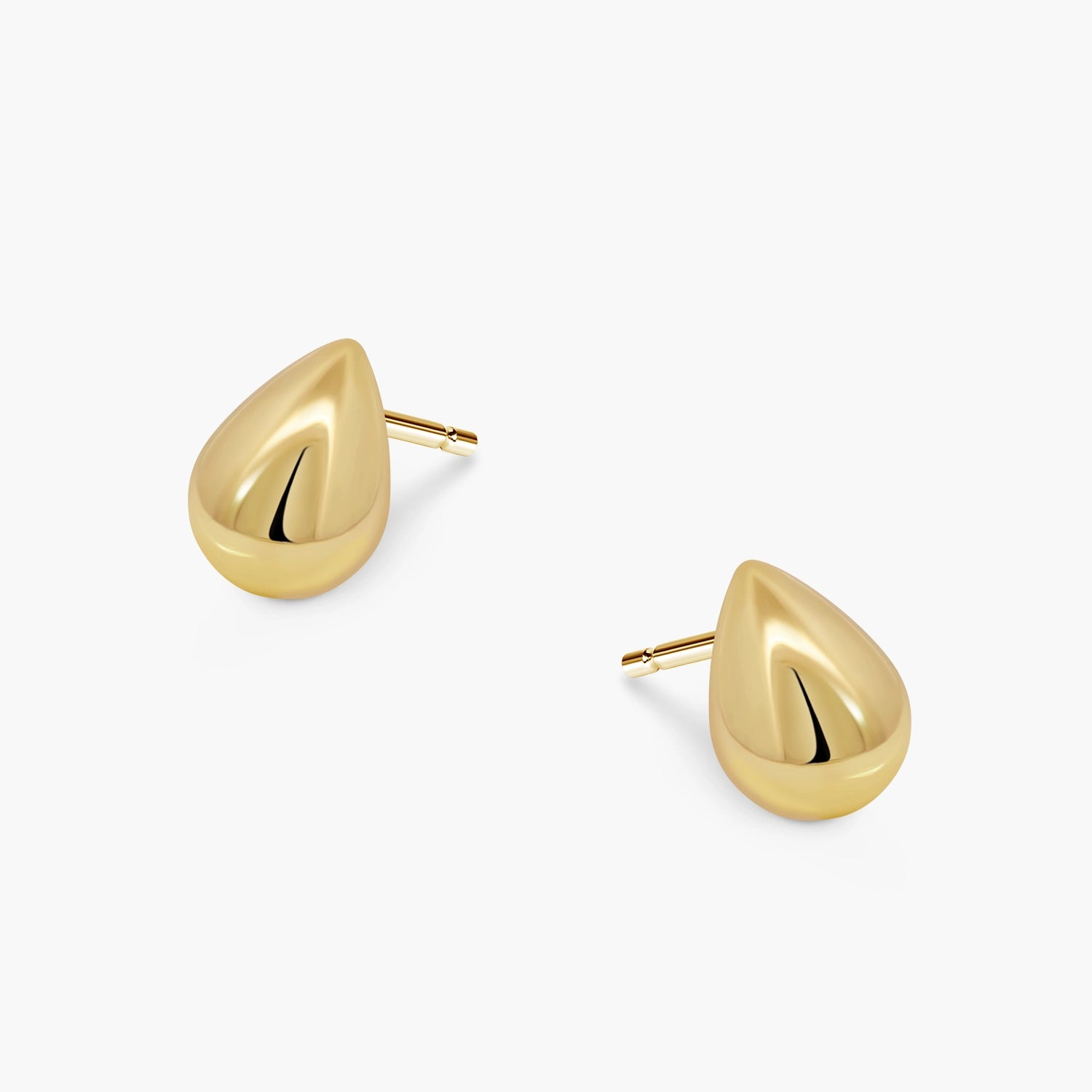 Minimalist 18kt yellow gold stud earrings in a refined drop shape, beautifully polished to a mirror-like finish. Their simple elegance and soft reflections make them a timeless everyday luxury.