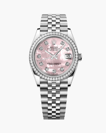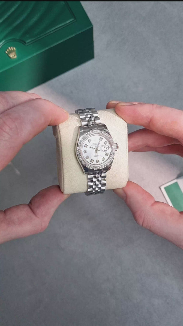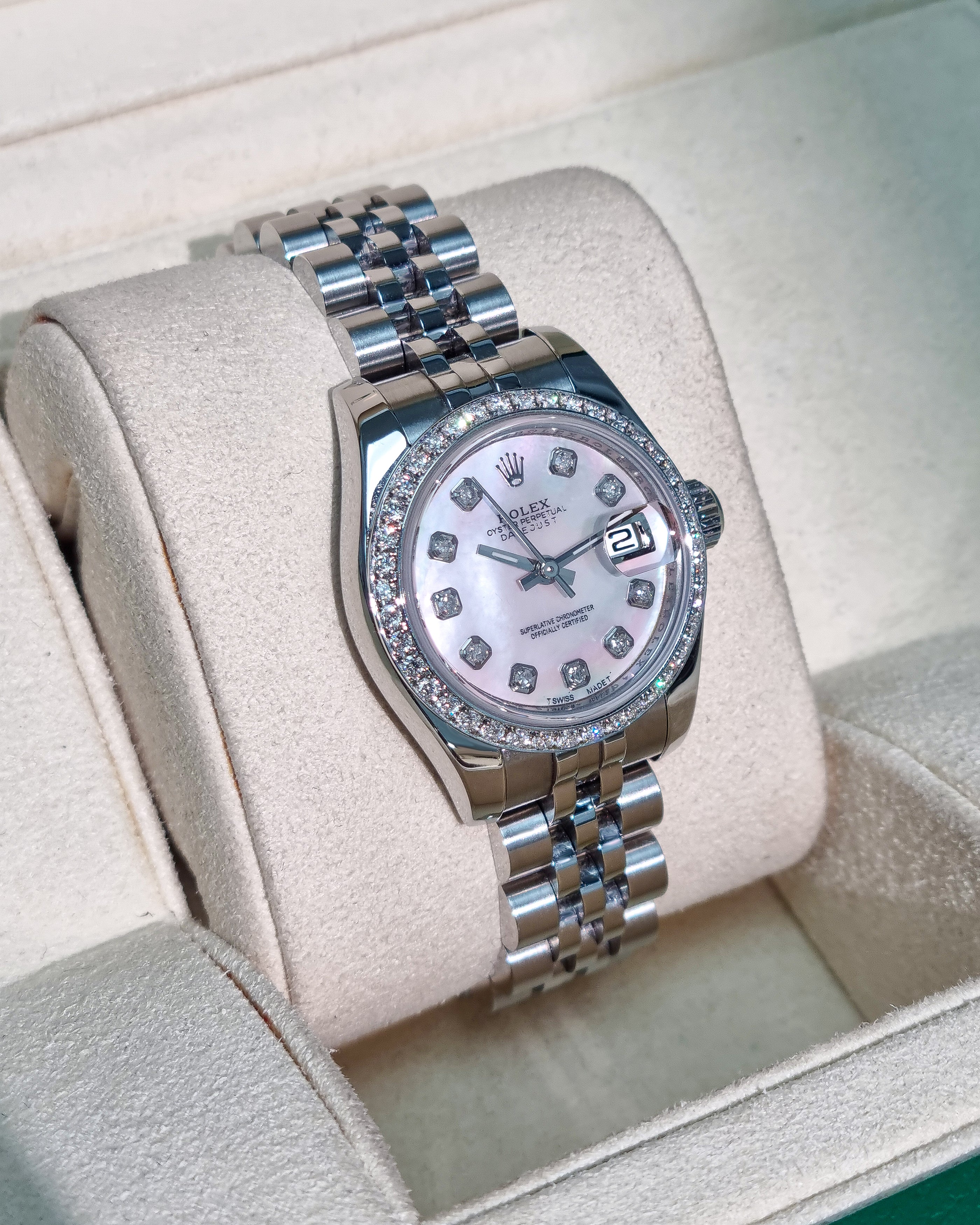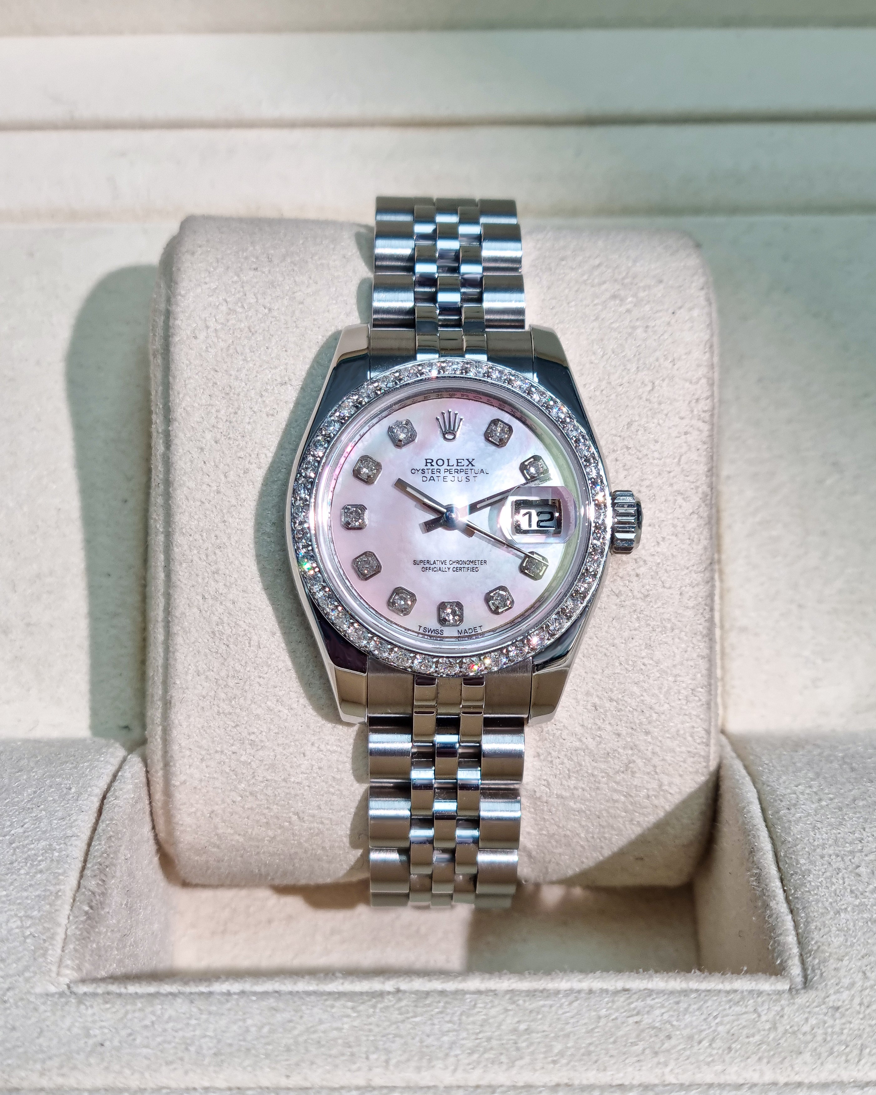 Rolex Datejust 179174 (2017) – A timeless 26mm masterpiece that embodies elegance and sophistication. This exquisite model features a stunning mother of pearl dial adorned with diamond hour markers, complemented by a luxurious custom diamond bezel. The watch is fitted with the classic stainless steel ‘Jubilee’ bracelet, offering both comfort and refined style. Powered by an automatic movement and complete with its original box and papers. In very good condition. Cat No. 0654.