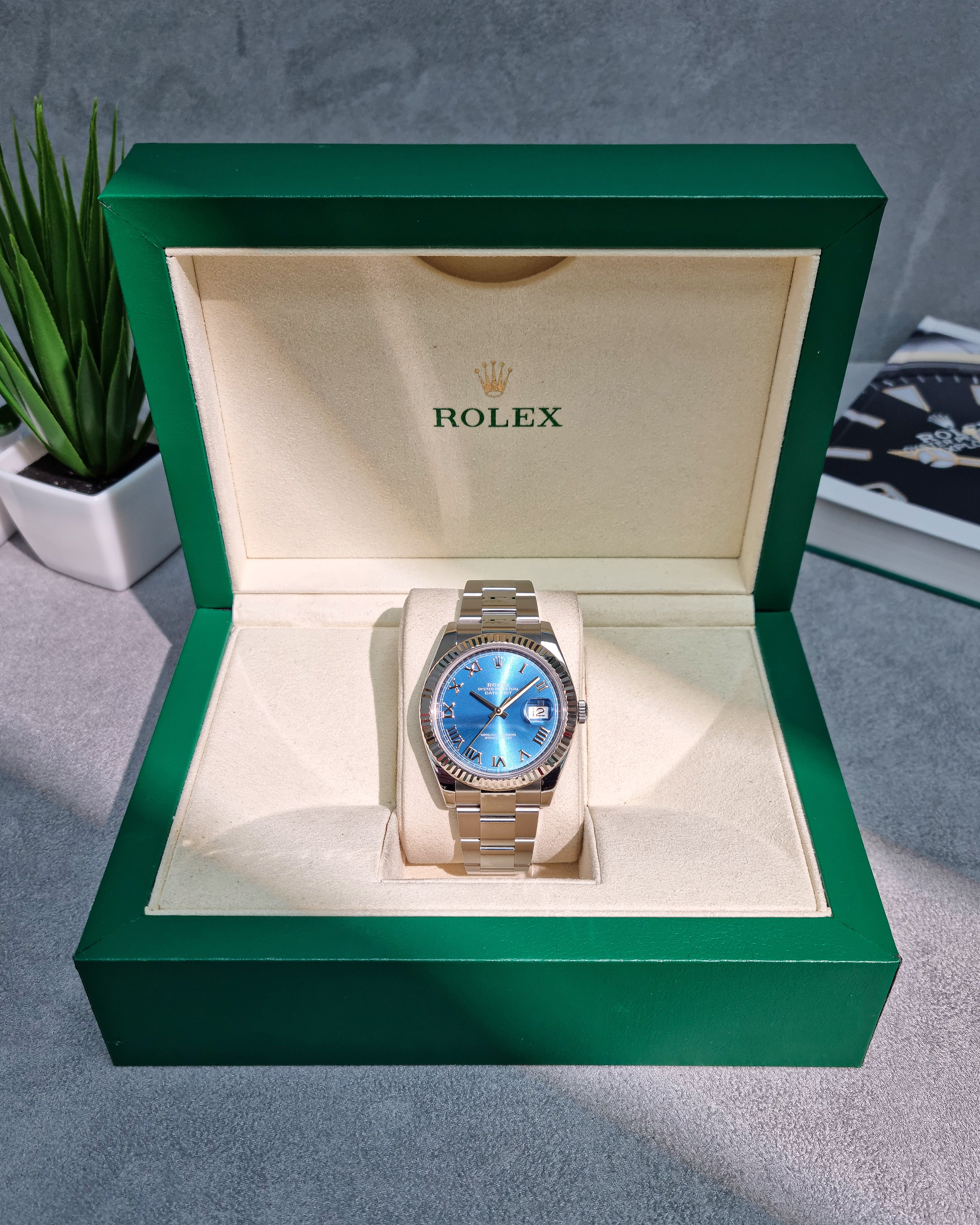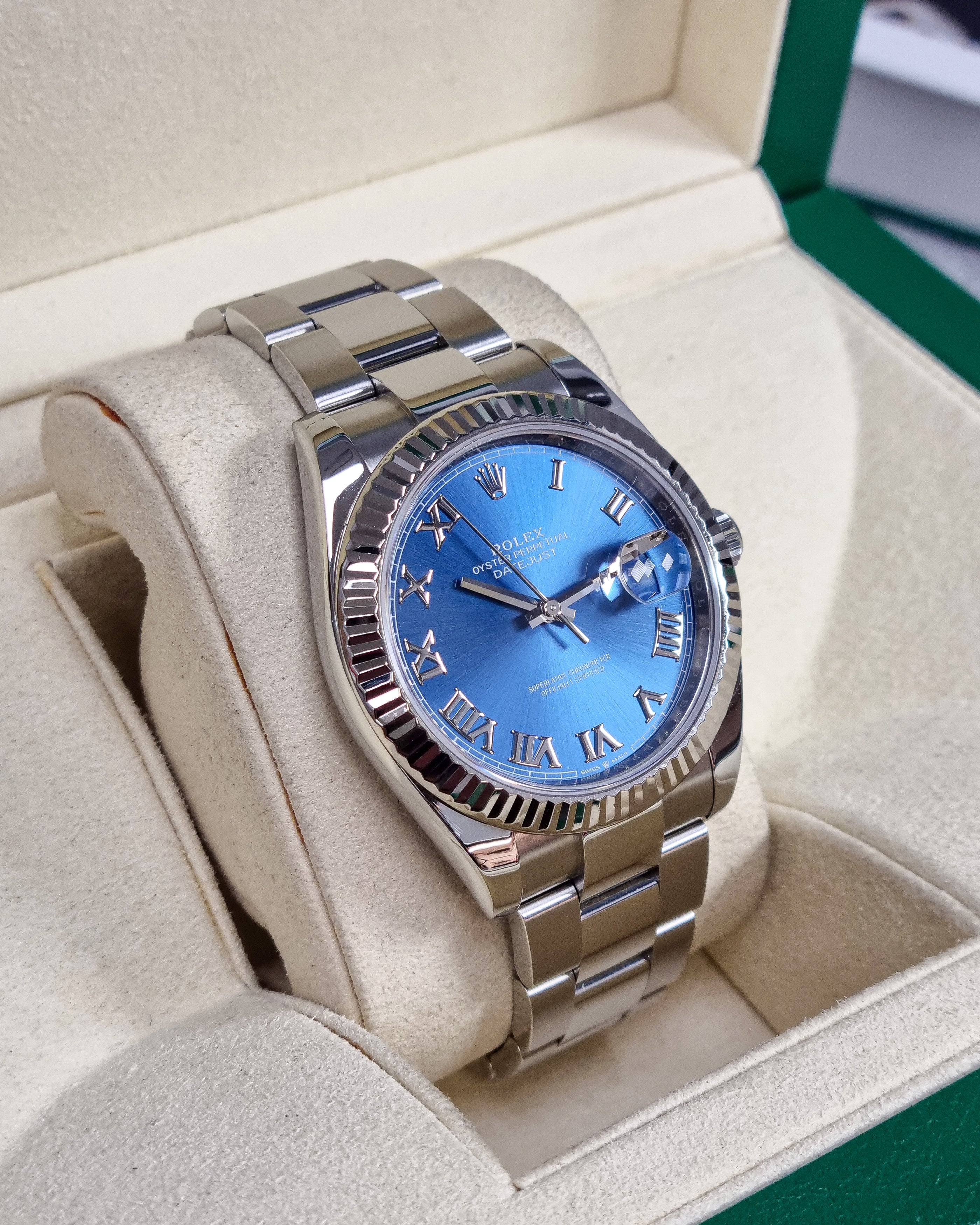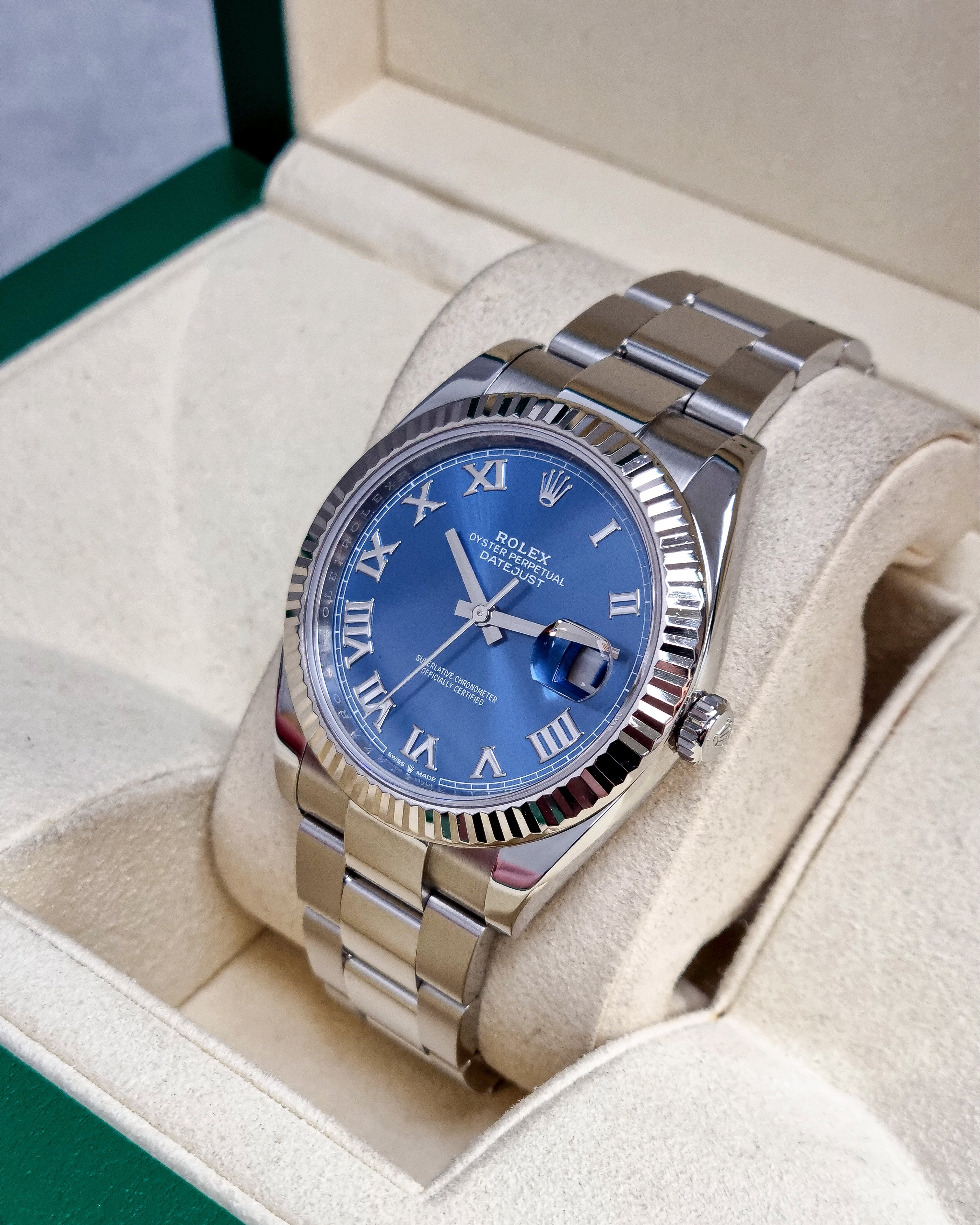 Rolex Datejust 126334 (2010+) – A 41mm stainless steel timepiece featuring a striking blue dial with Roman numeral hour markers, framed by a classic fluted bezel. Powered by an automatic movement and paired with a robust stainless steel Oyster bracelet, it balances elegance with everyday functionality. Supplied with box, no papers. In very good condition. Cat No. 0843.