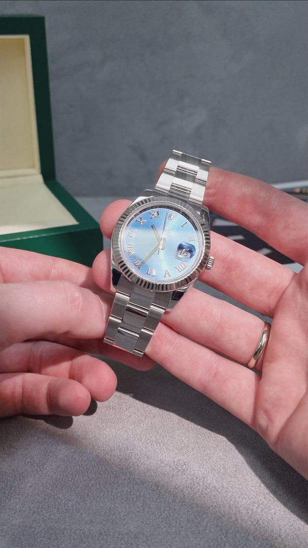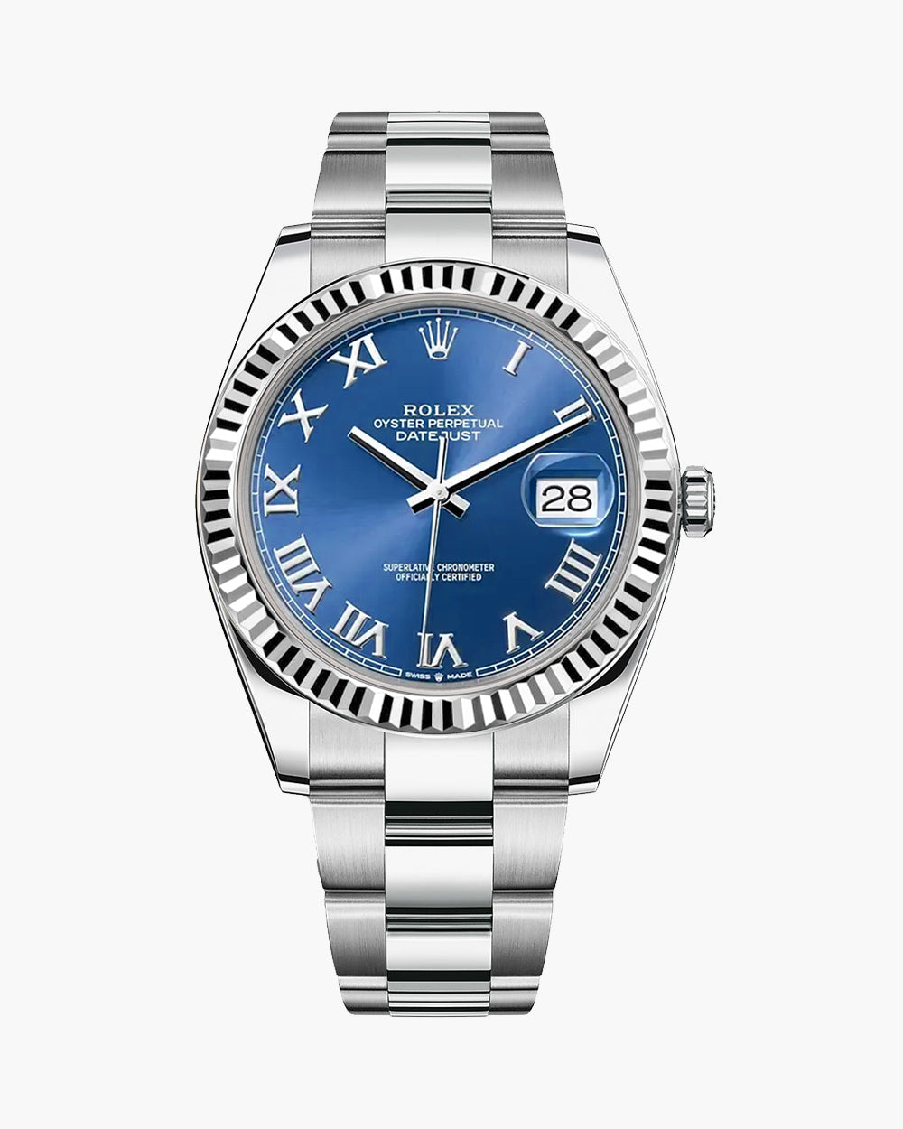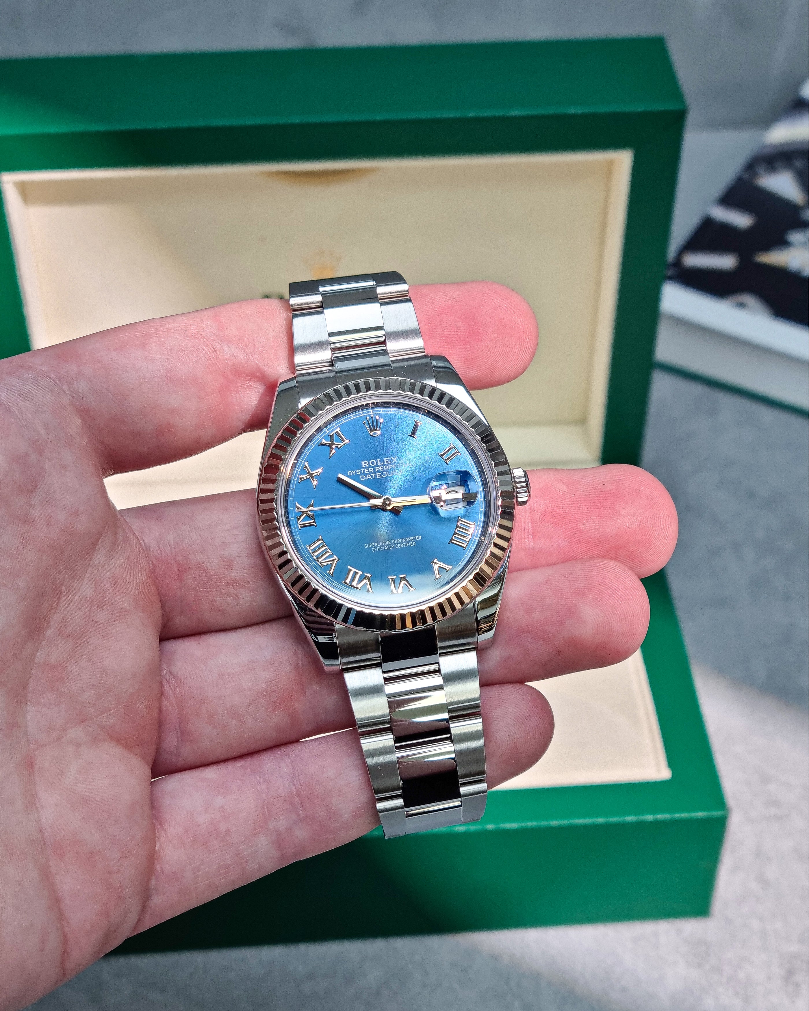 Rolex Datejust 126334 (2010+) – A 41mm stainless steel timepiece featuring a striking blue dial with Roman numeral hour markers, framed by a classic fluted bezel. Powered by an automatic movement and paired with a robust stainless steel Oyster bracelet, it balances elegance with everyday functionality. Supplied with box, no papers. In very good condition. Cat No. 0843.