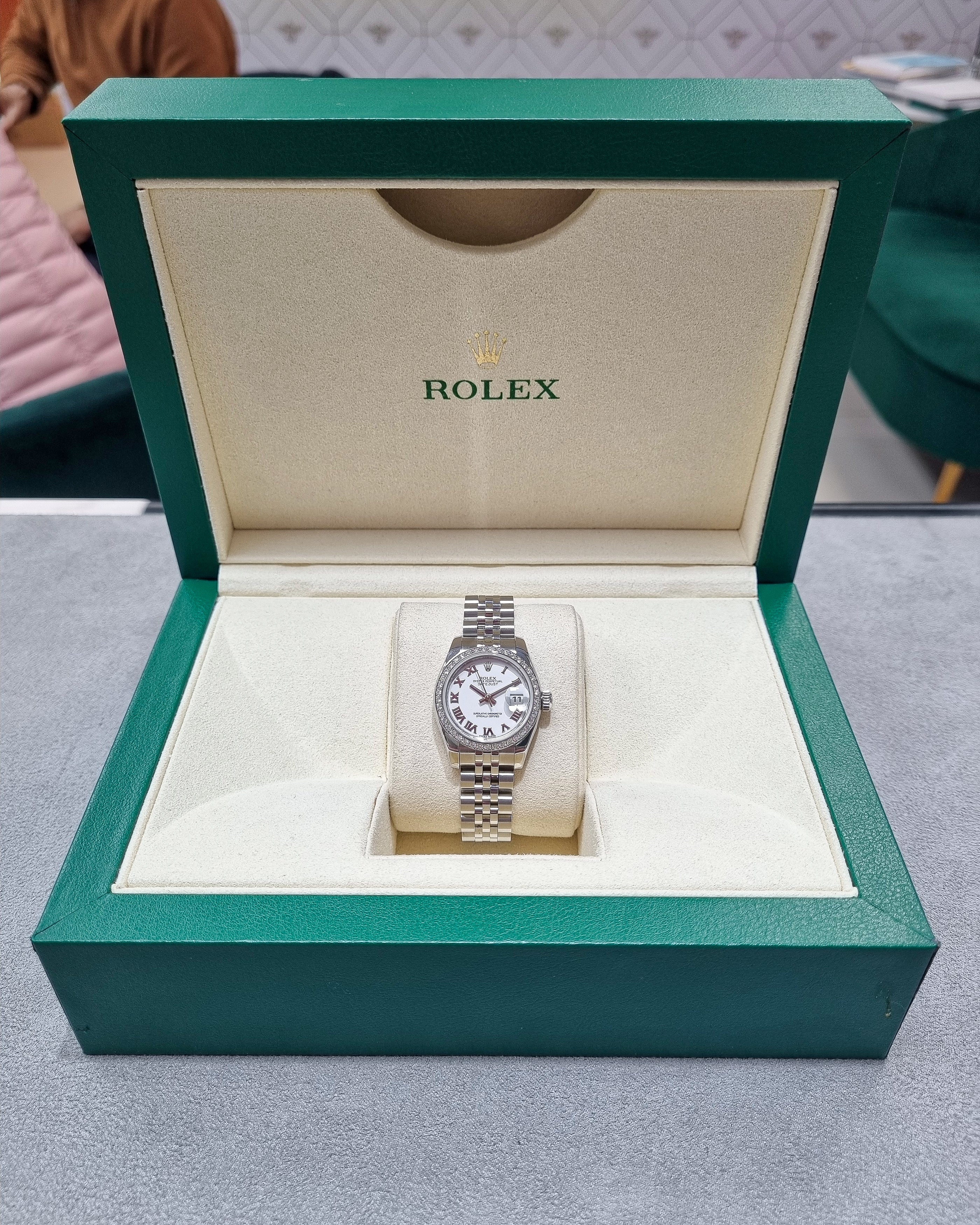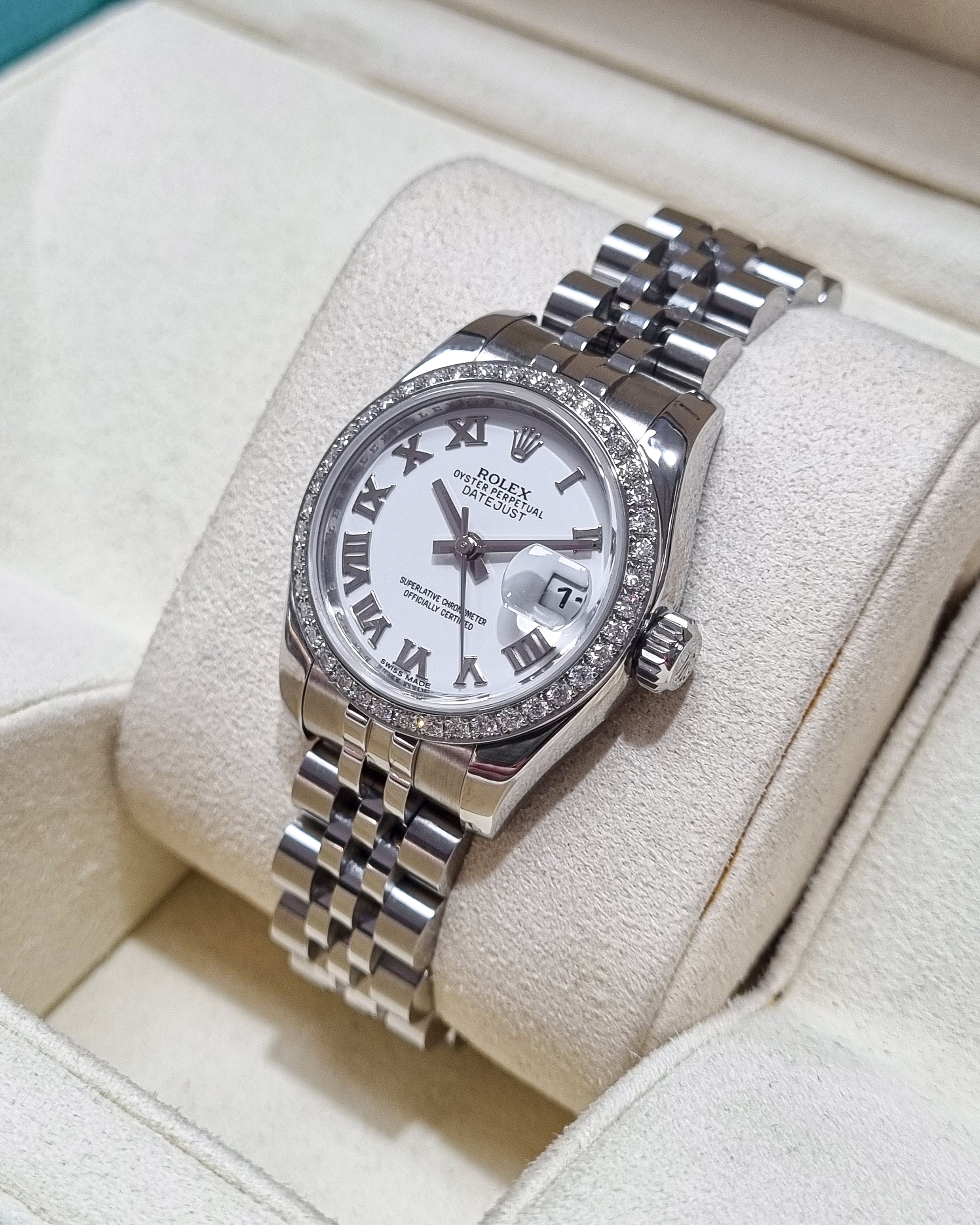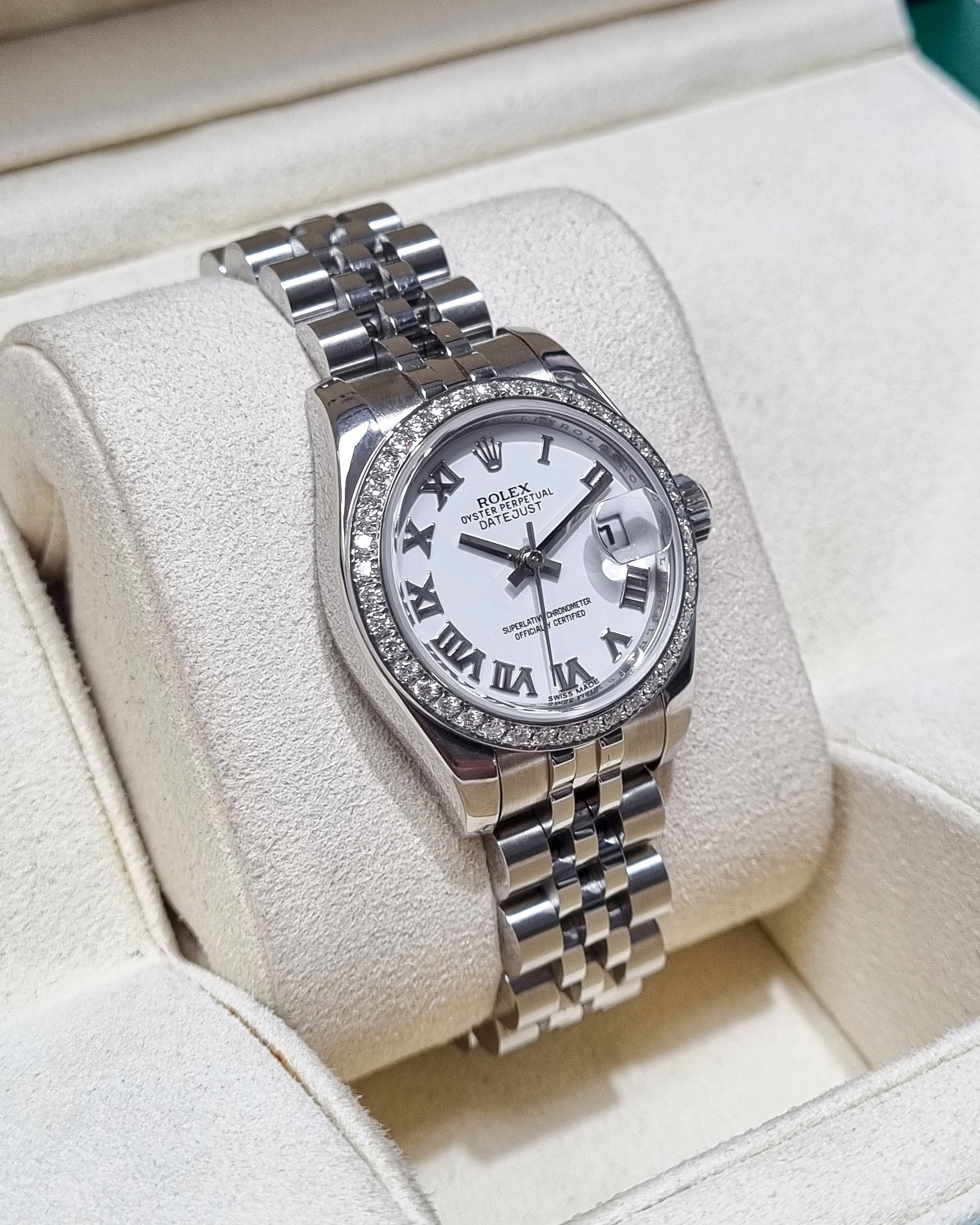 Rolex Datejust 179174 – A 26mm stainless steel ladies’ timepiece featuring a white dial with Roman numerals and a custom diamond-set bezel. Fitted with a stainless steel bracelet for classic Rolex style. Supplied with box (no papers). In very good condition. Cat No. 0903.