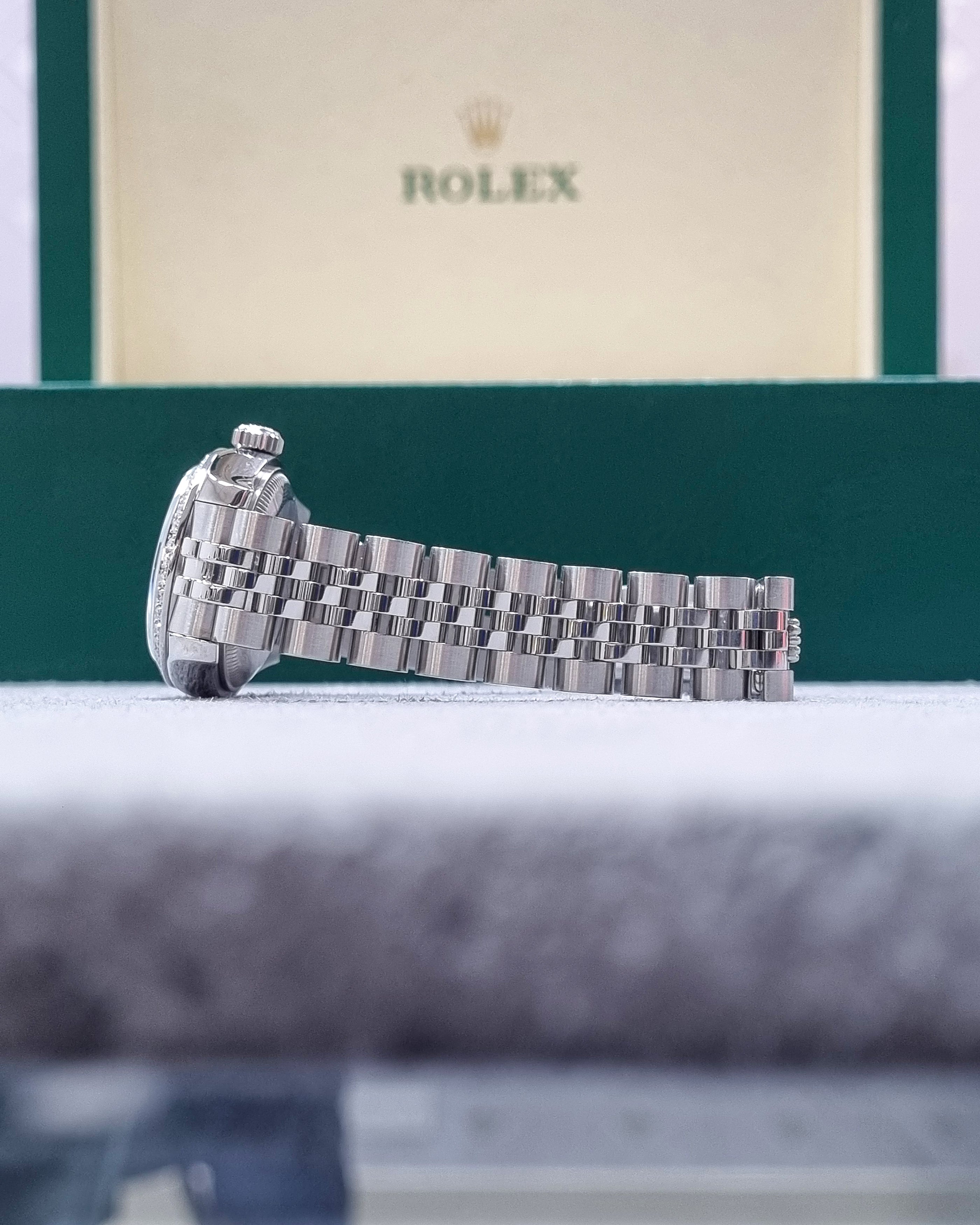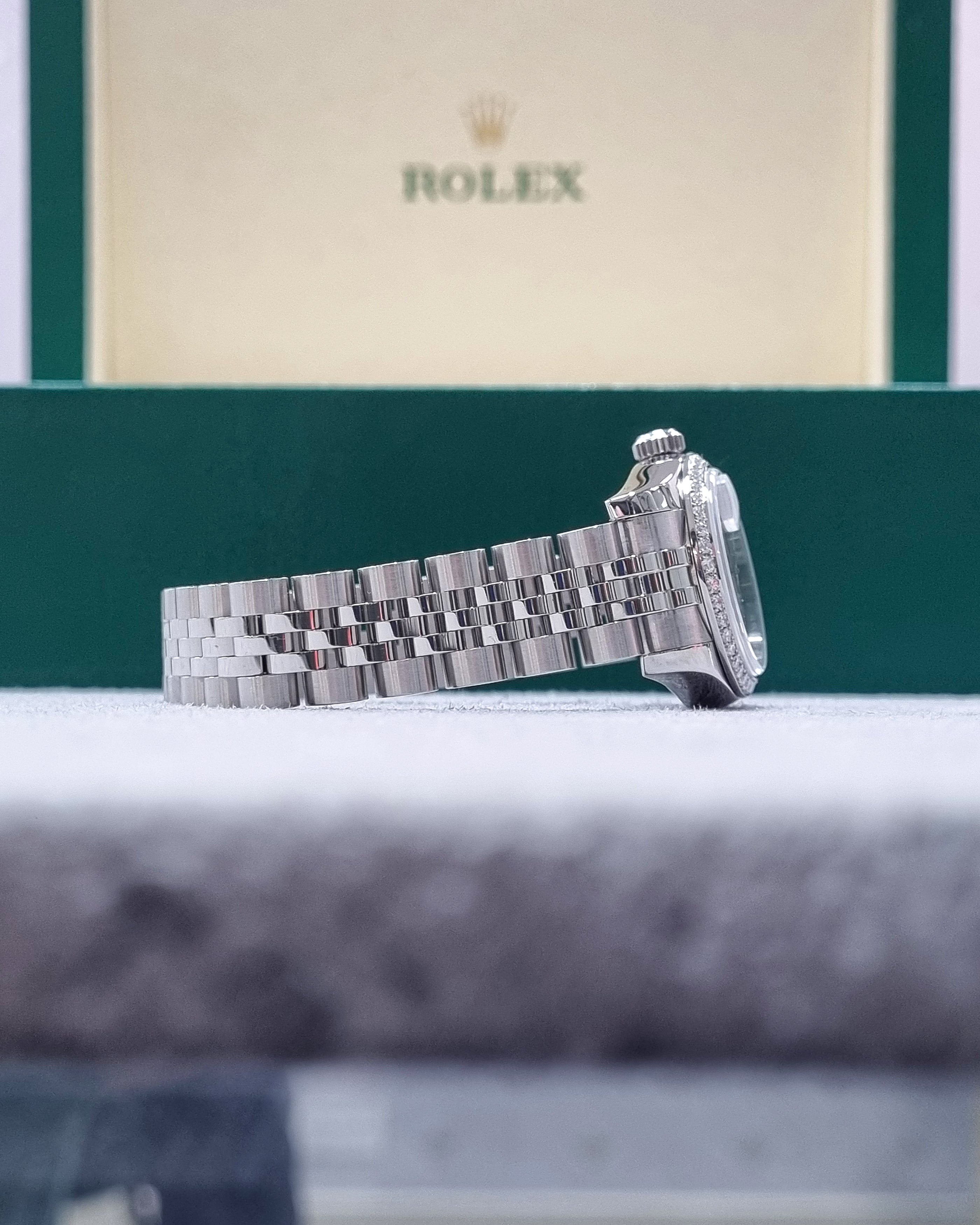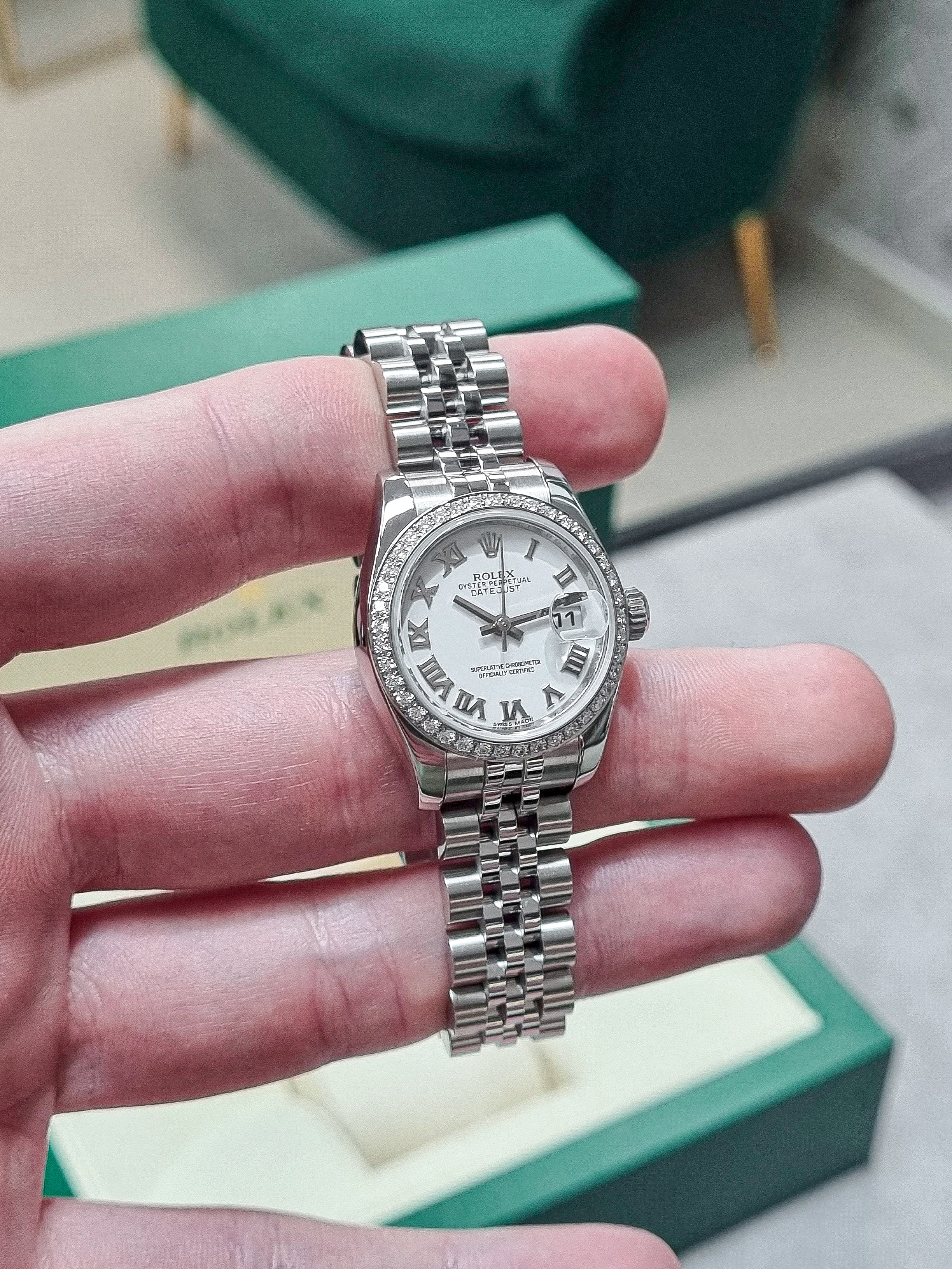 Rolex Datejust 179174 – A 26mm stainless steel ladies’ timepiece featuring a white dial with Roman numerals and a custom diamond-set bezel. Fitted with a stainless steel bracelet for classic Rolex style. Supplied with box (no papers). In very good condition. Cat No. 0903.