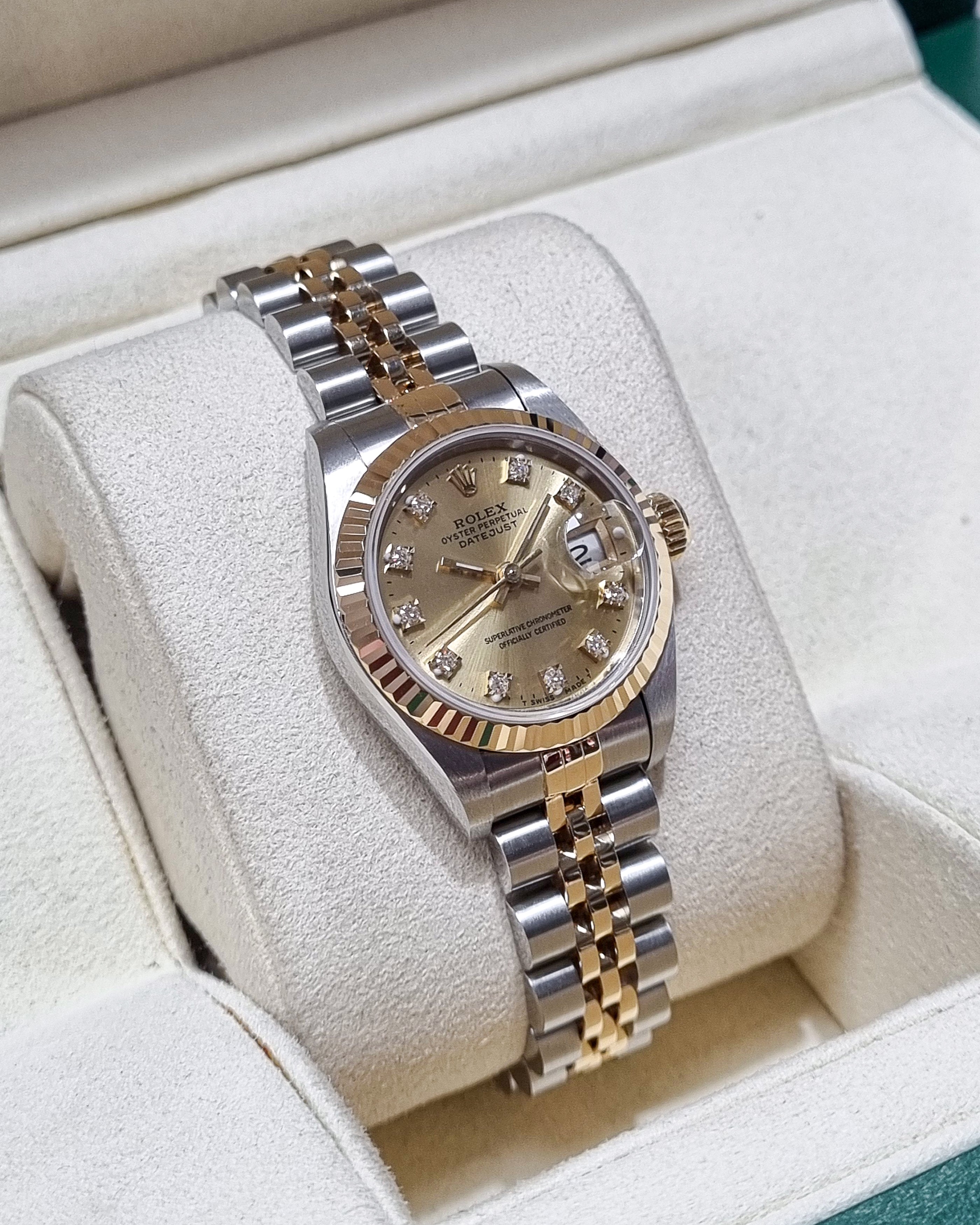 Rolex Datejust 69173 (1996) – A 26mm two-tone ladies’ watch featuring a factory gold dial with diamond hour markers and an 18kt yellow gold fluted bezel. Fitted with a stainless steel and 18kt yellow gold Jubilee bracelet. Powered by an automatic movement. Supplied with original box and papers. In very good condition. Cat No. 0905.