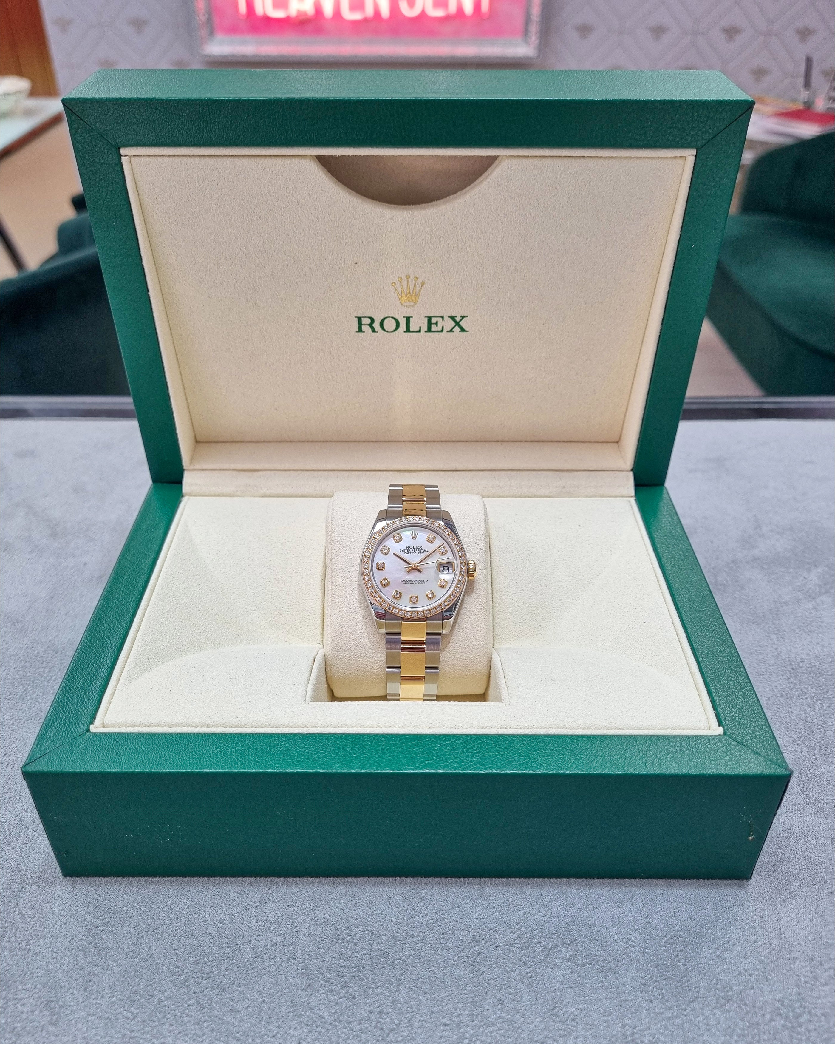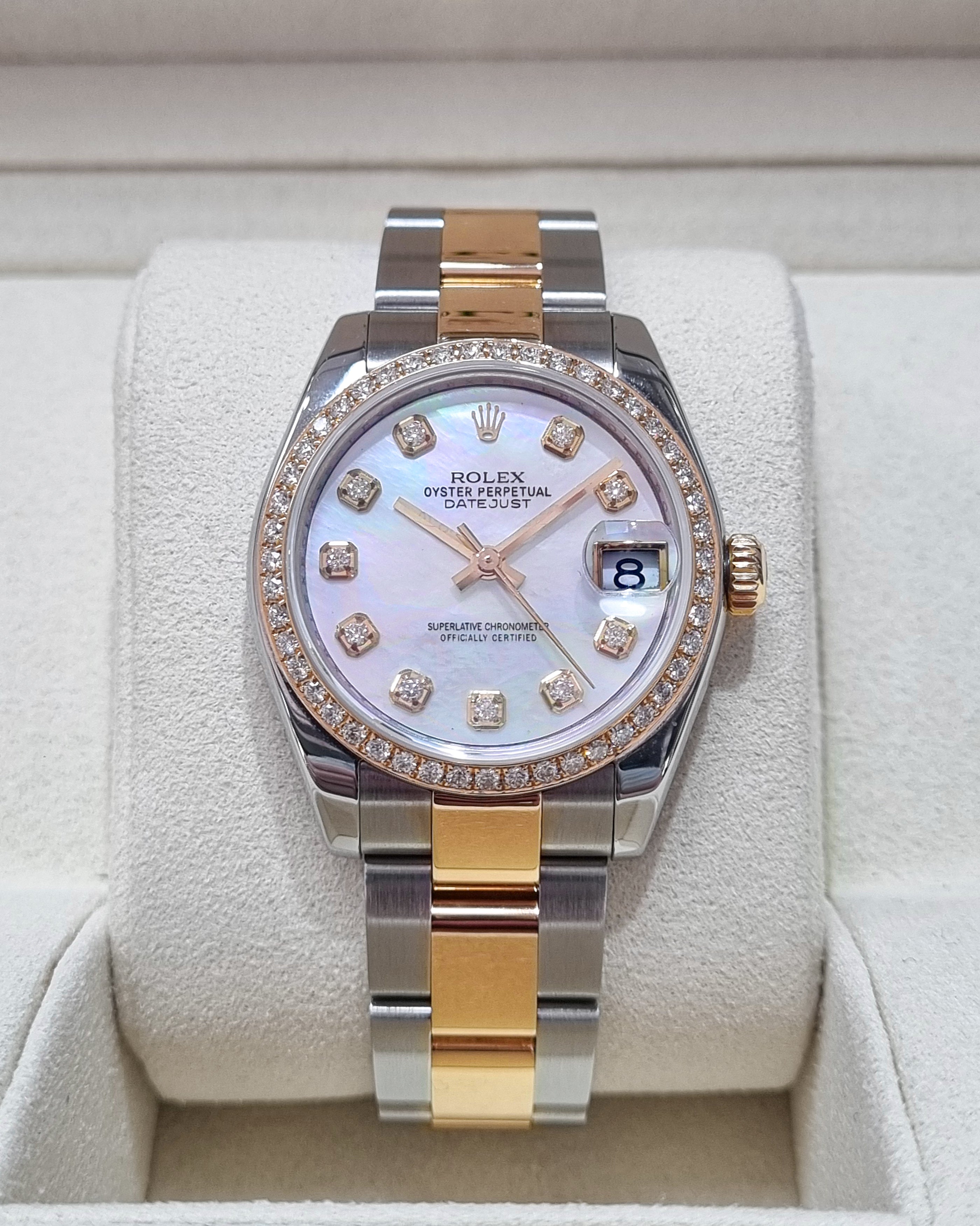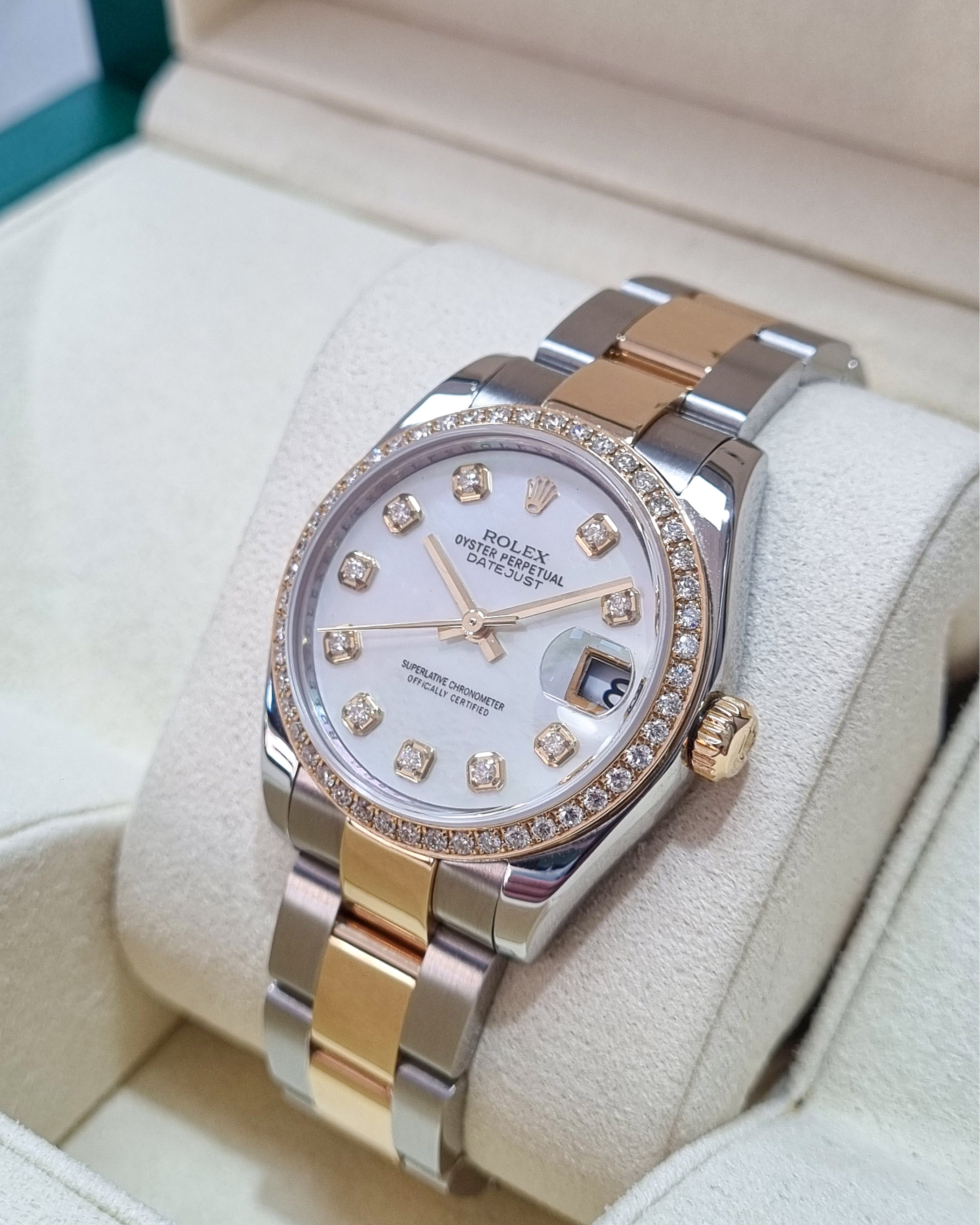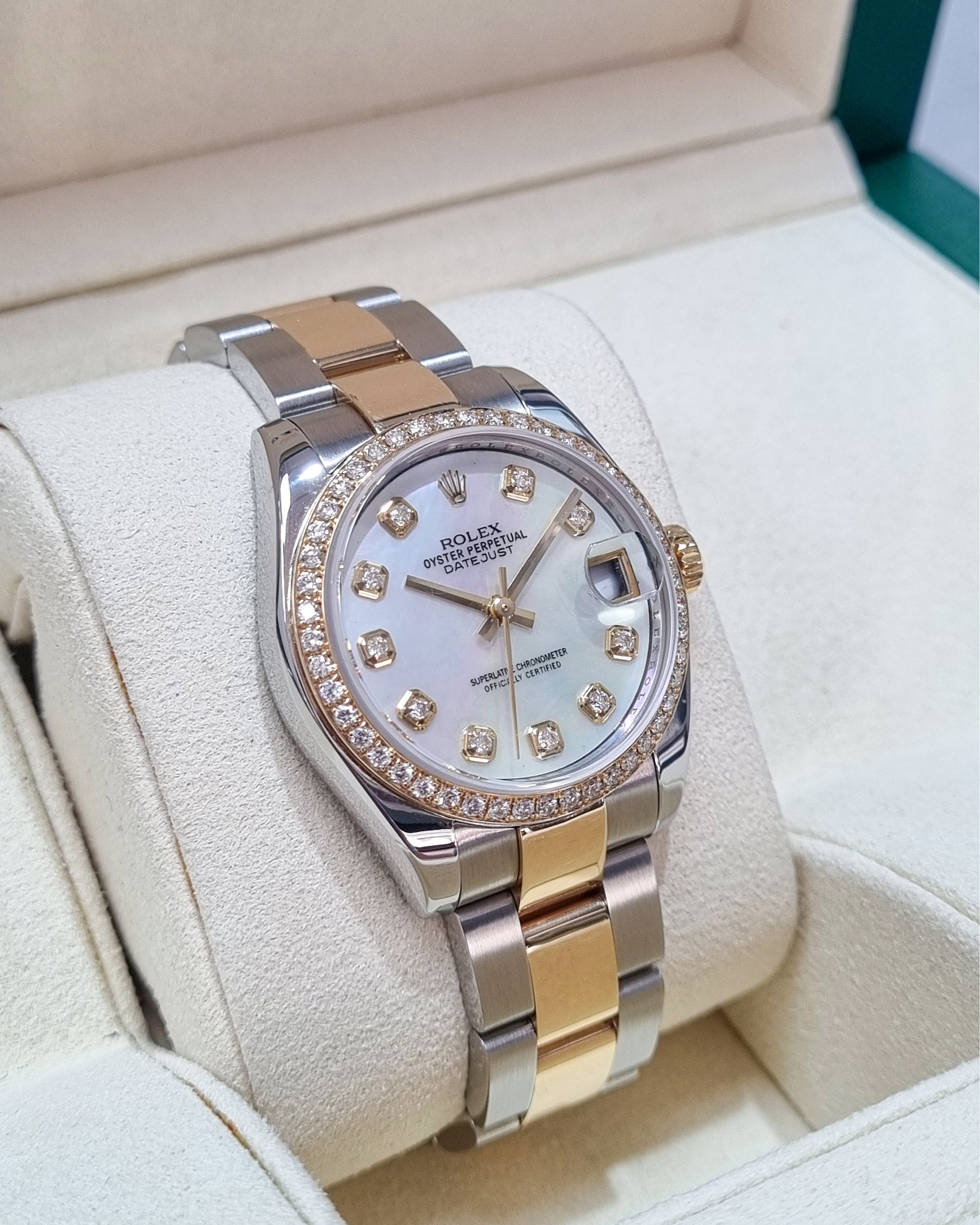 Rolex Datejust 178273 (2008) – A 31mm two-tone timepiece featuring a custom mother-of-pearl dial with diamond markers and a custom diamond-set bezel. Paired with a stainless steel and 18kt yellow gold Oyster bracelet. Supplied with box (papers not included). In very good condition. Cat No. 0684.