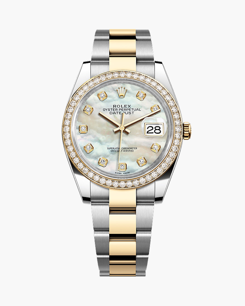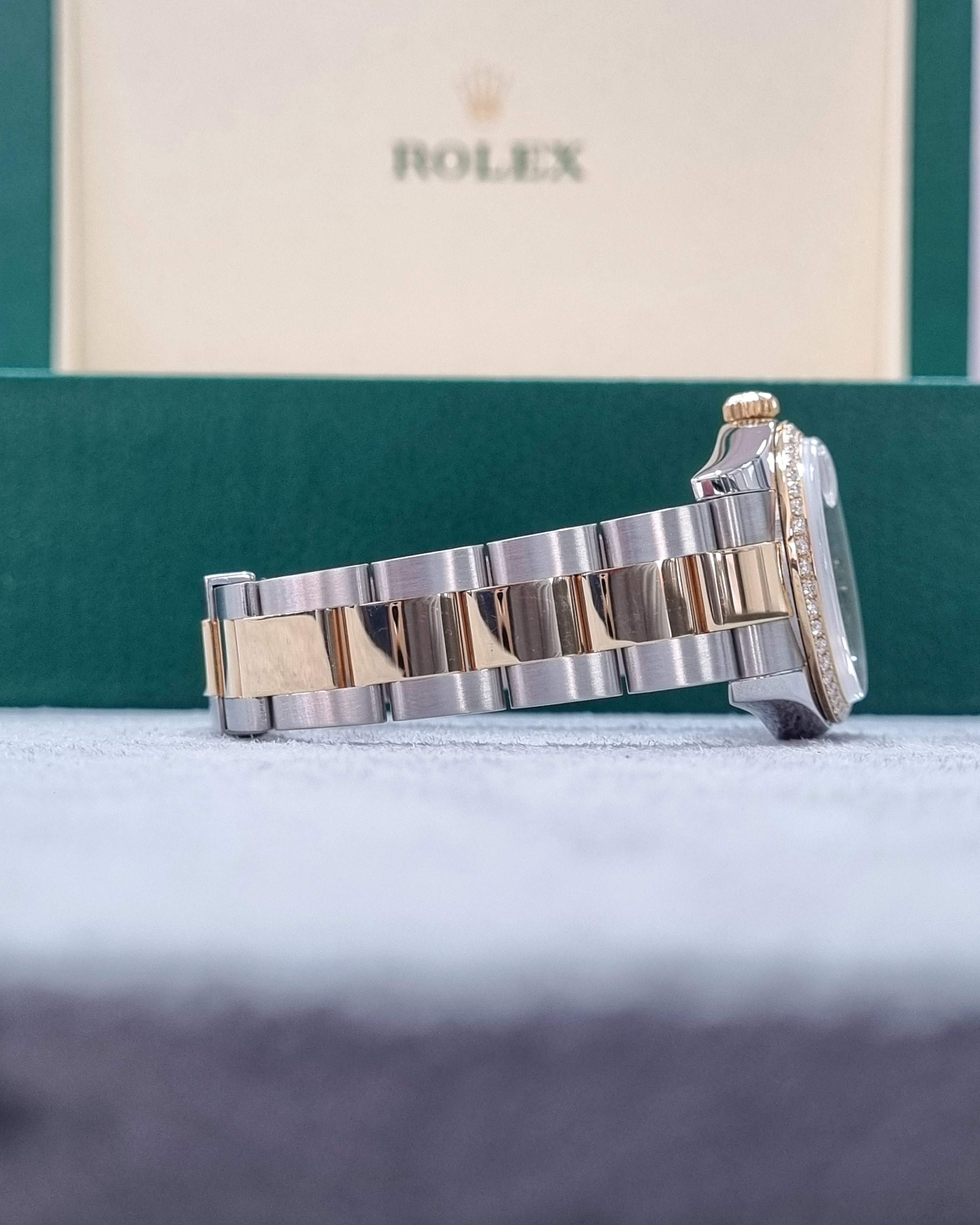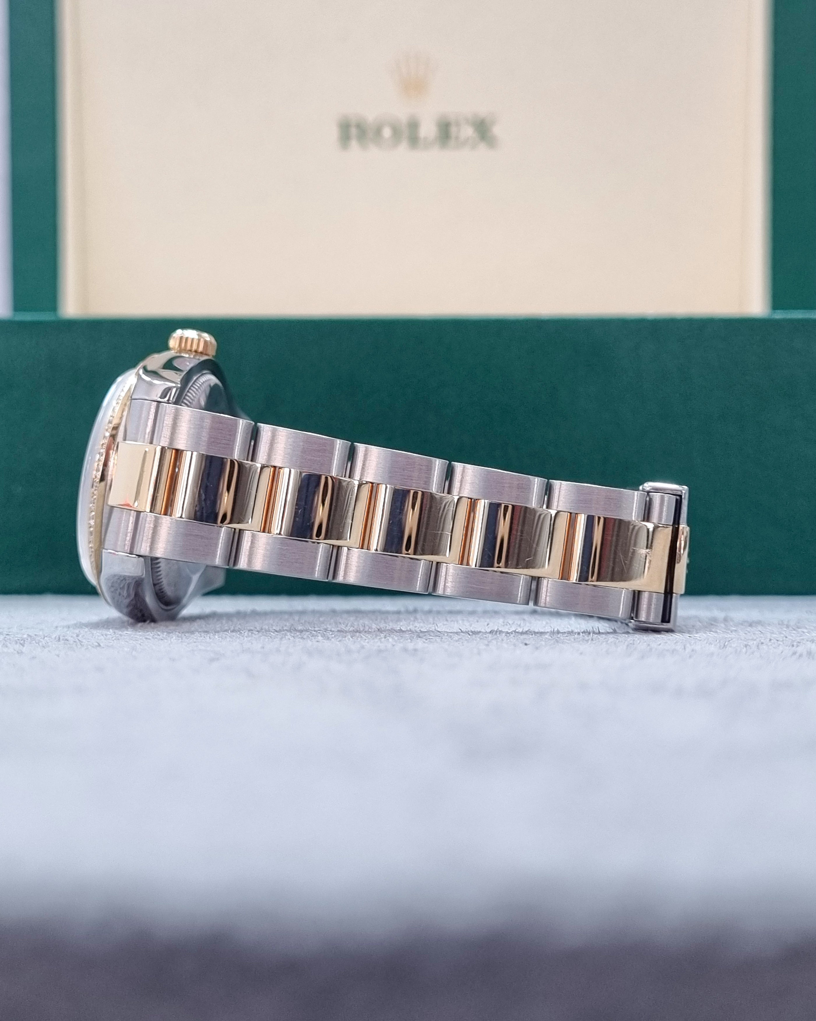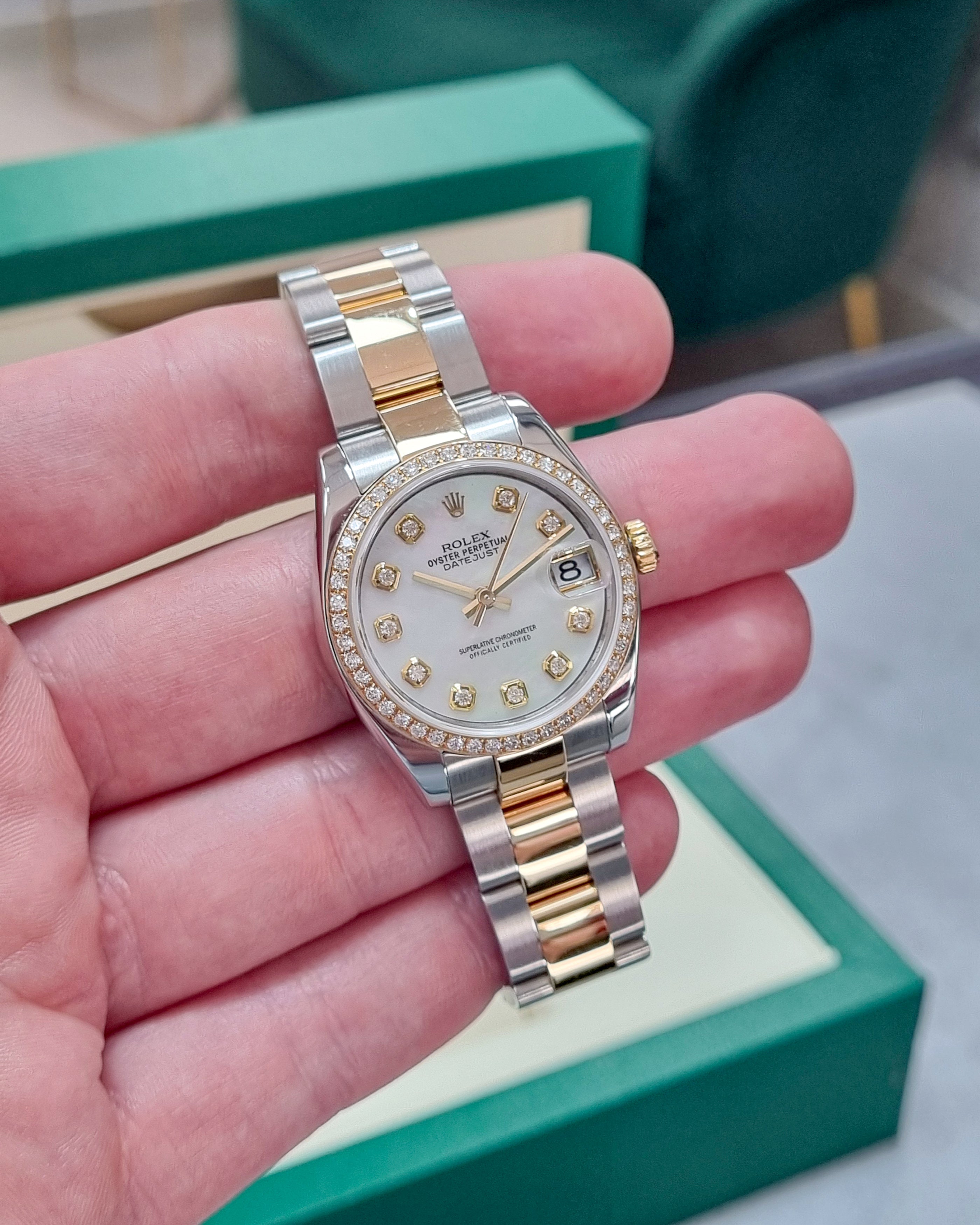 Rolex Datejust 178273 (2008) – A 31mm two-tone timepiece featuring a custom mother-of-pearl dial with diamond markers and a custom diamond-set bezel. Paired with a stainless steel and 18kt yellow gold Oyster bracelet. Supplied with box (papers not included). In very good condition. Cat No. 0684.