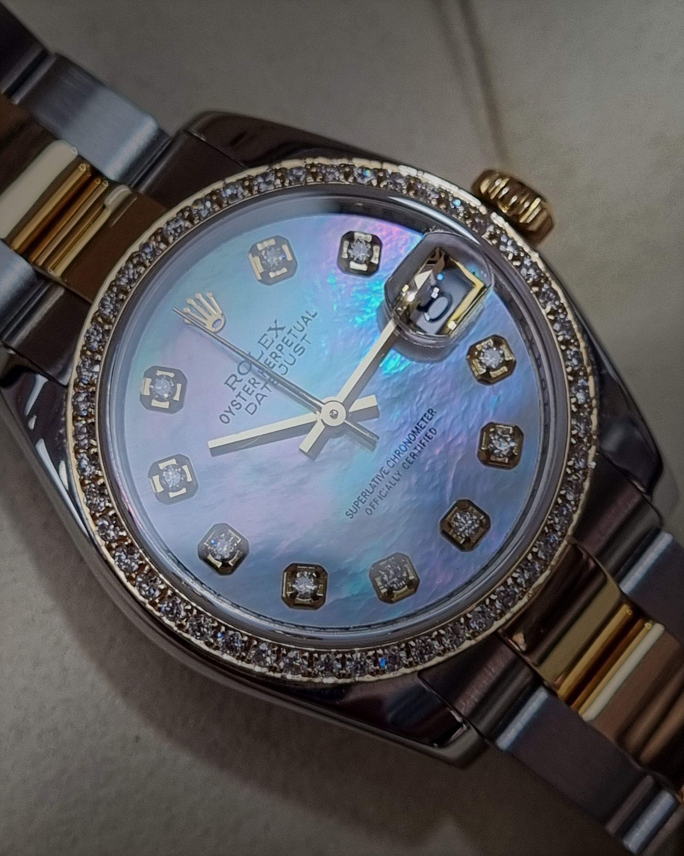 A luxurious and eye-catching Datejust, combining Rolex’s classic design with custom diamond enhancements for a truly unique and sophisticated look.