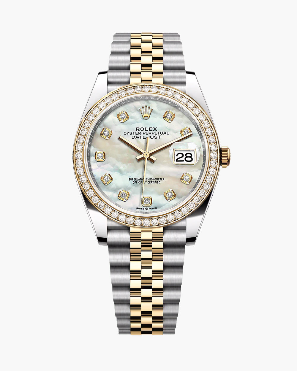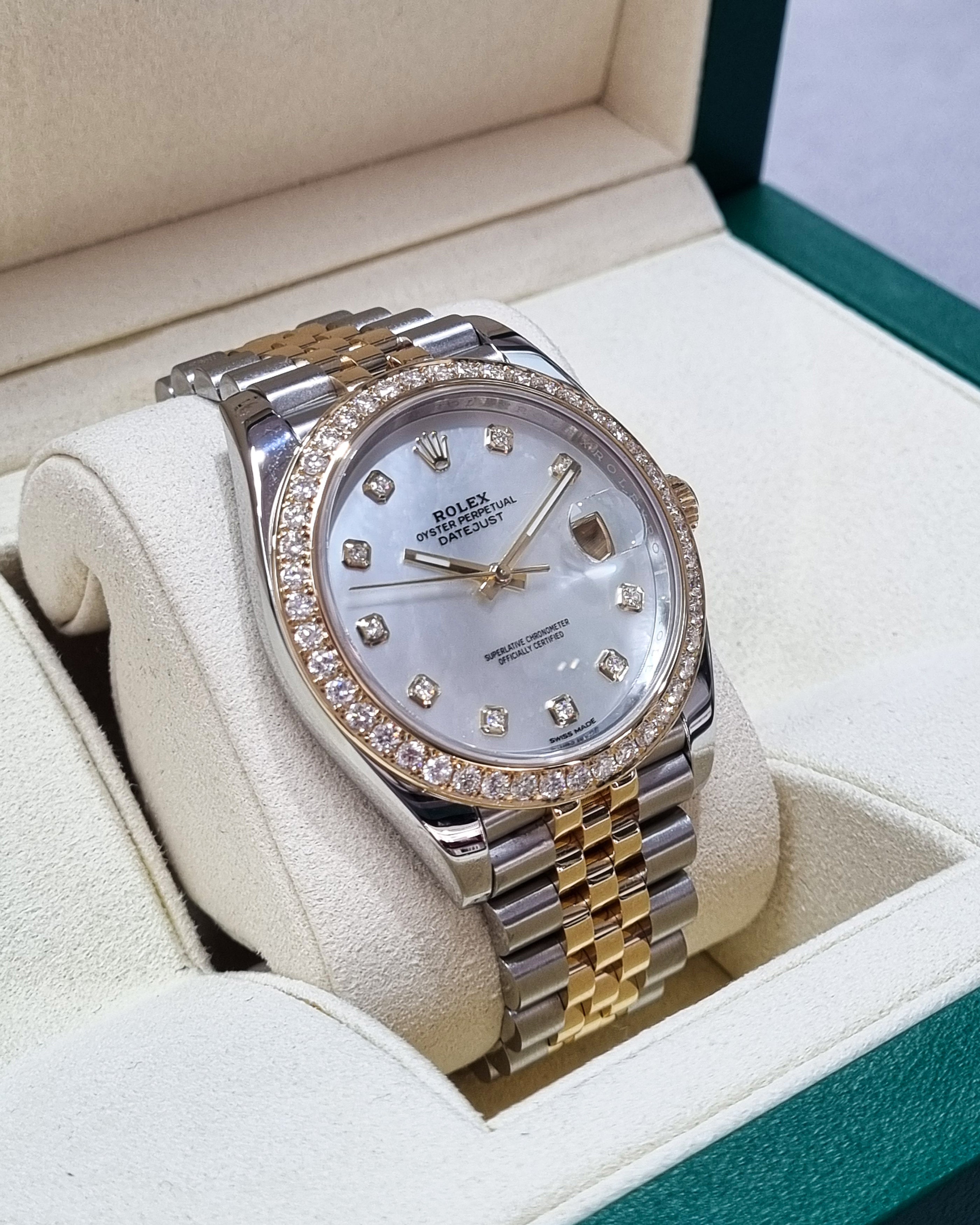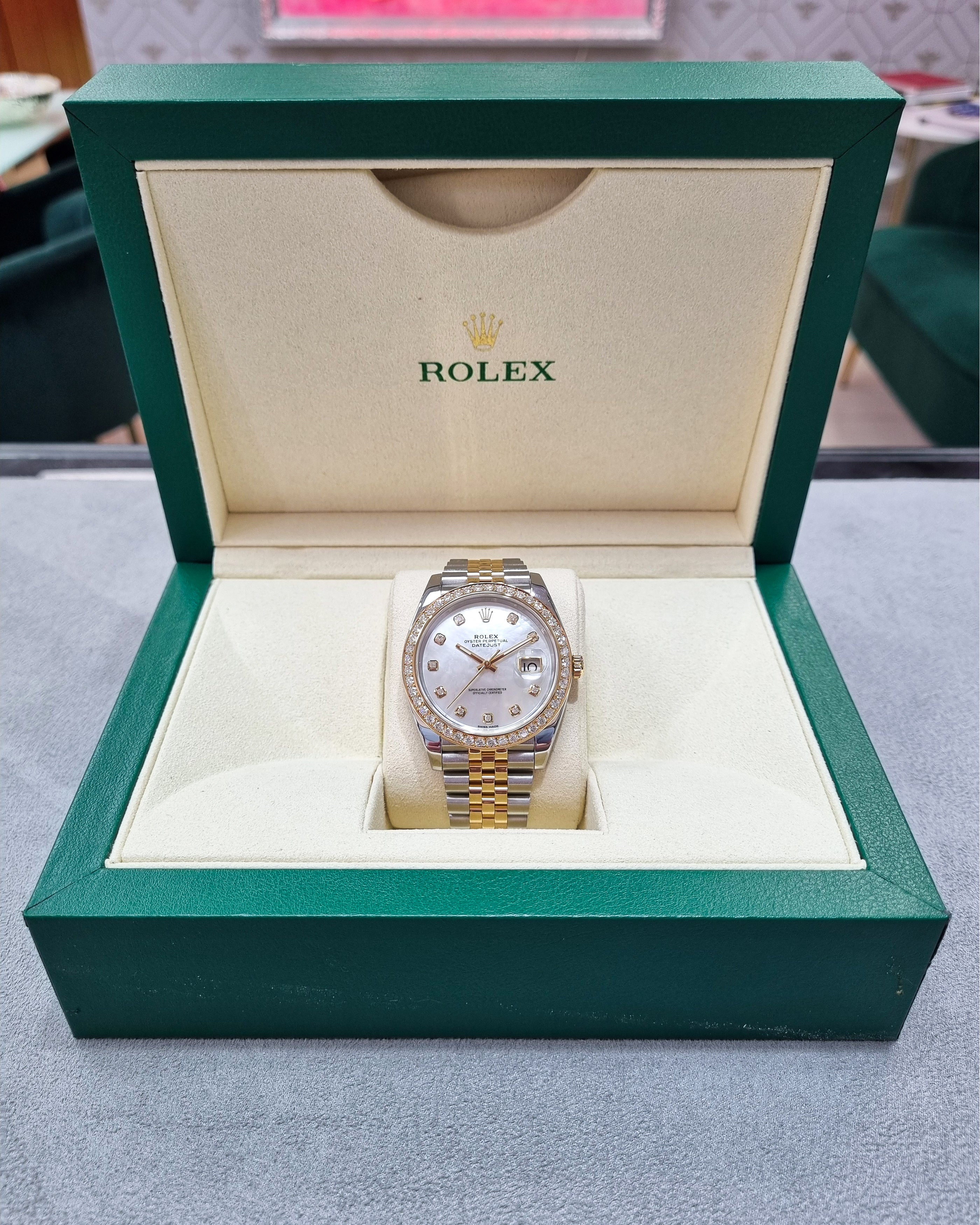 Rolex Datejust 126303 (2019) – A 41mm two-tone timepiece crafted from 18kt yellow gold and stainless steel, featuring a factory mother-of-pearl dial and a custom 45-diamond bezel. Fitted with a two-tone Jubilee bracelet and powered by an automatic movement. Supplied with original box and papers. In very good condition. Cat No. 0675.