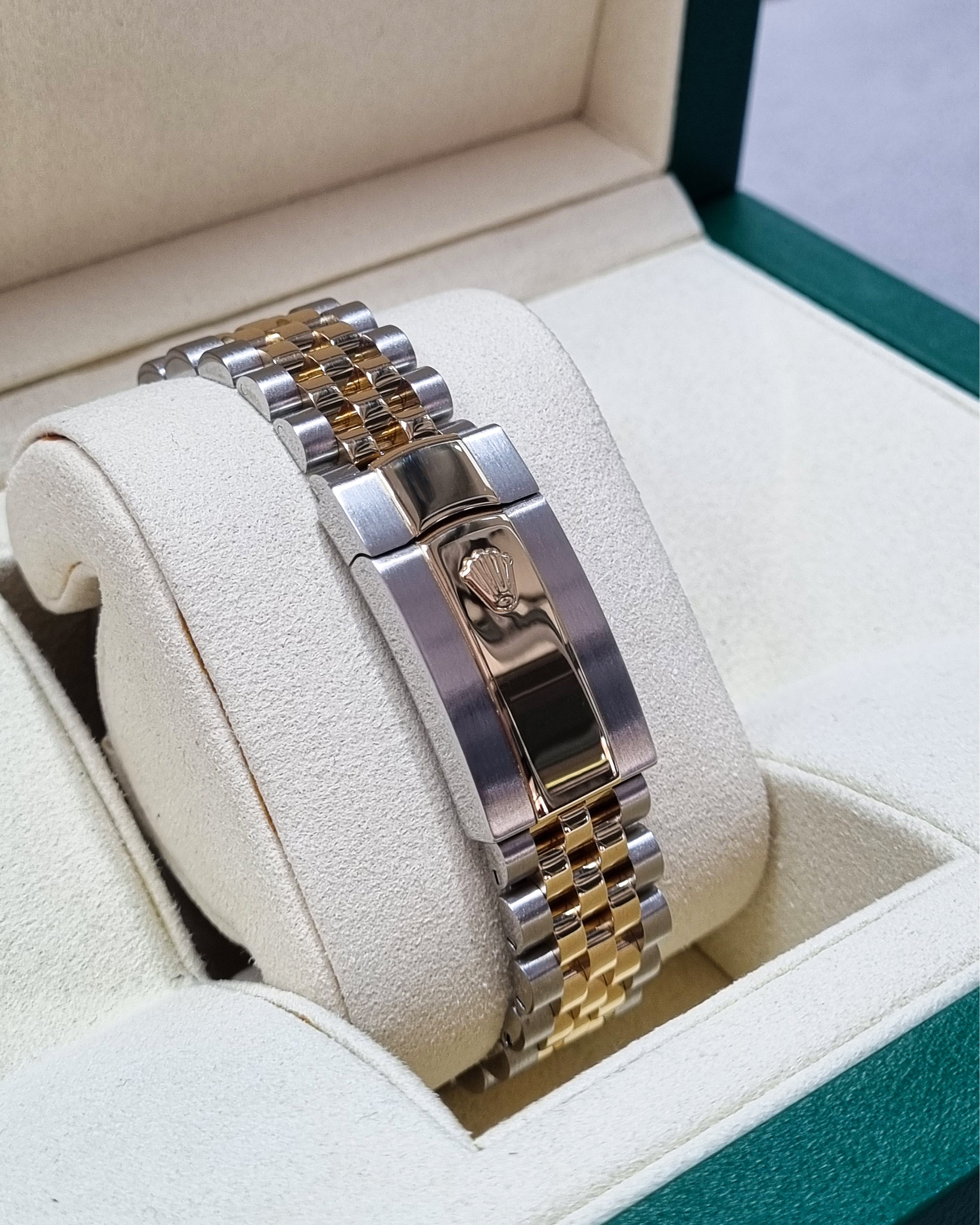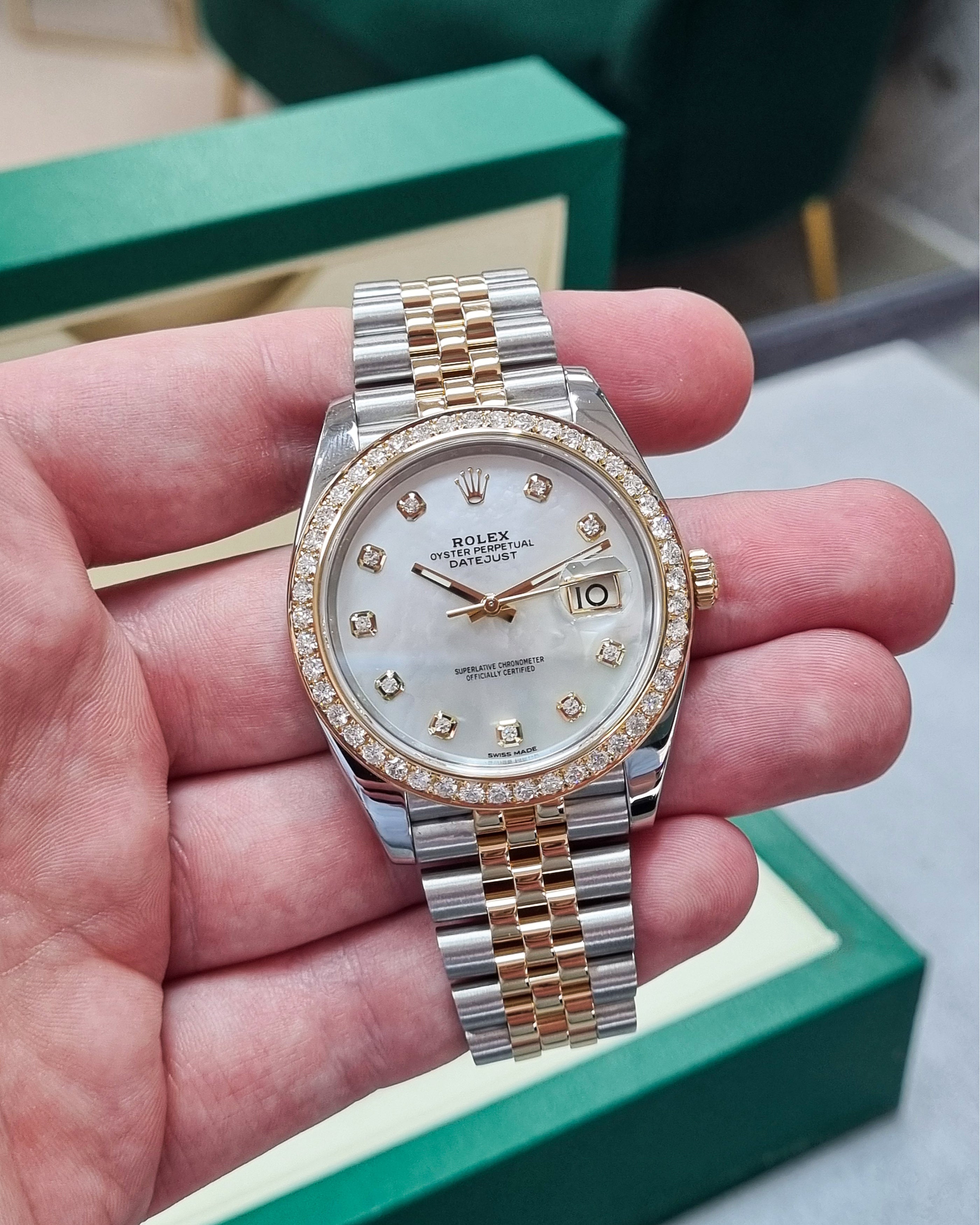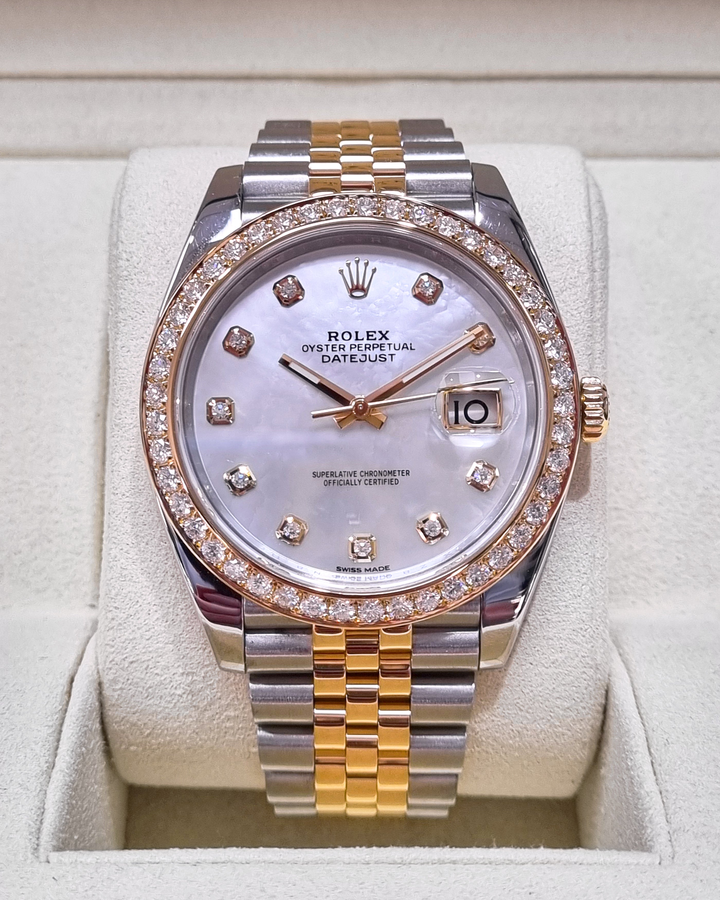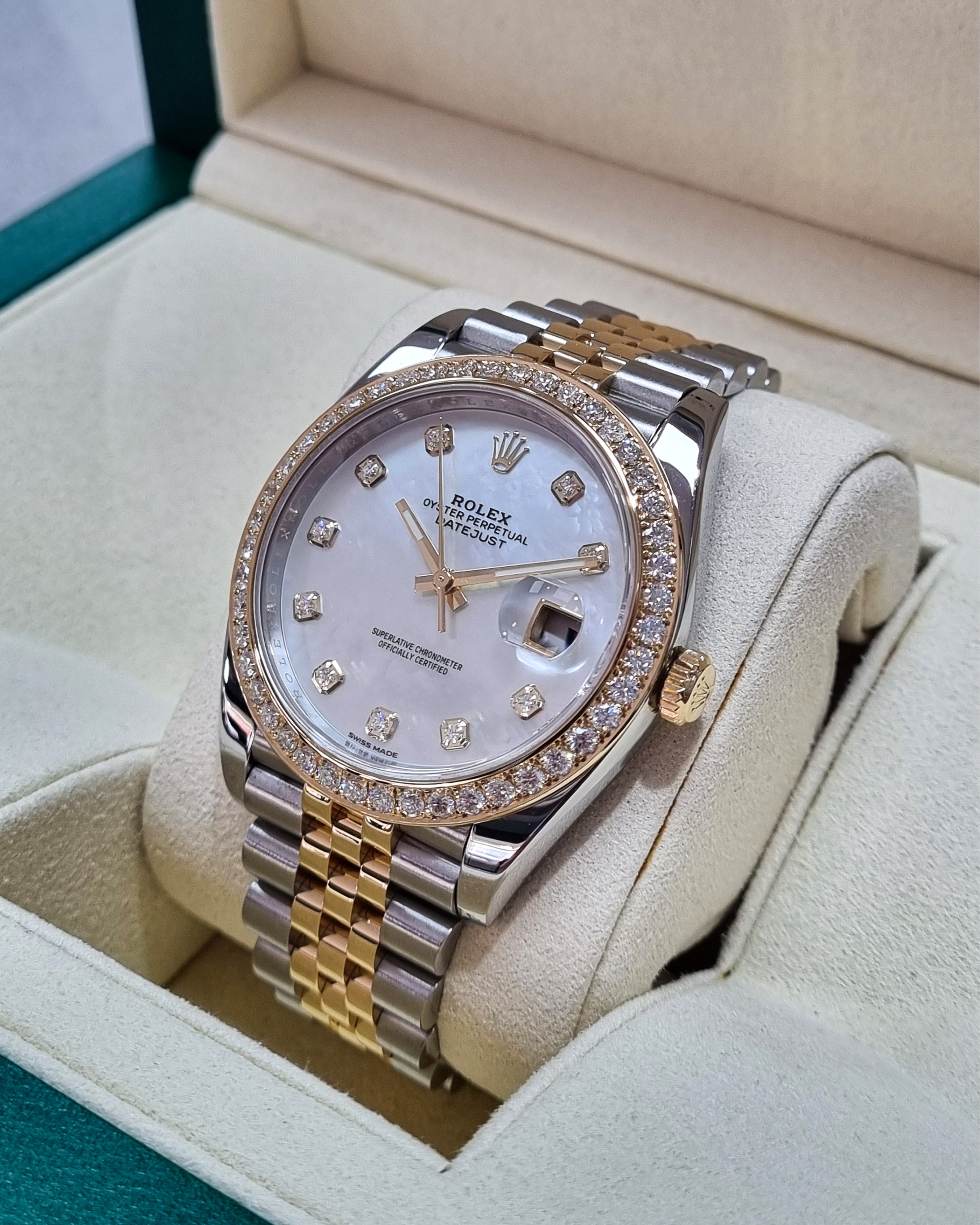 Rolex Datejust 126303 (2019) – A 41mm two-tone timepiece crafted from 18kt yellow gold and stainless steel, featuring a factory mother-of-pearl dial and a custom 45-diamond bezel. Fitted with a two-tone Jubilee bracelet and powered by an automatic movement. Supplied with original box and papers. In very good condition. Cat No. 0675.