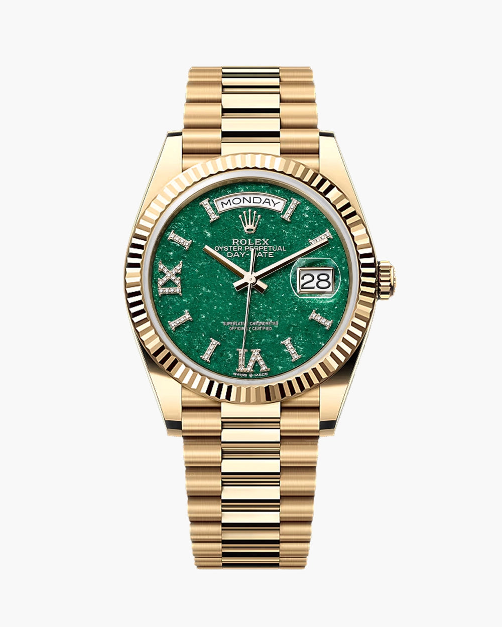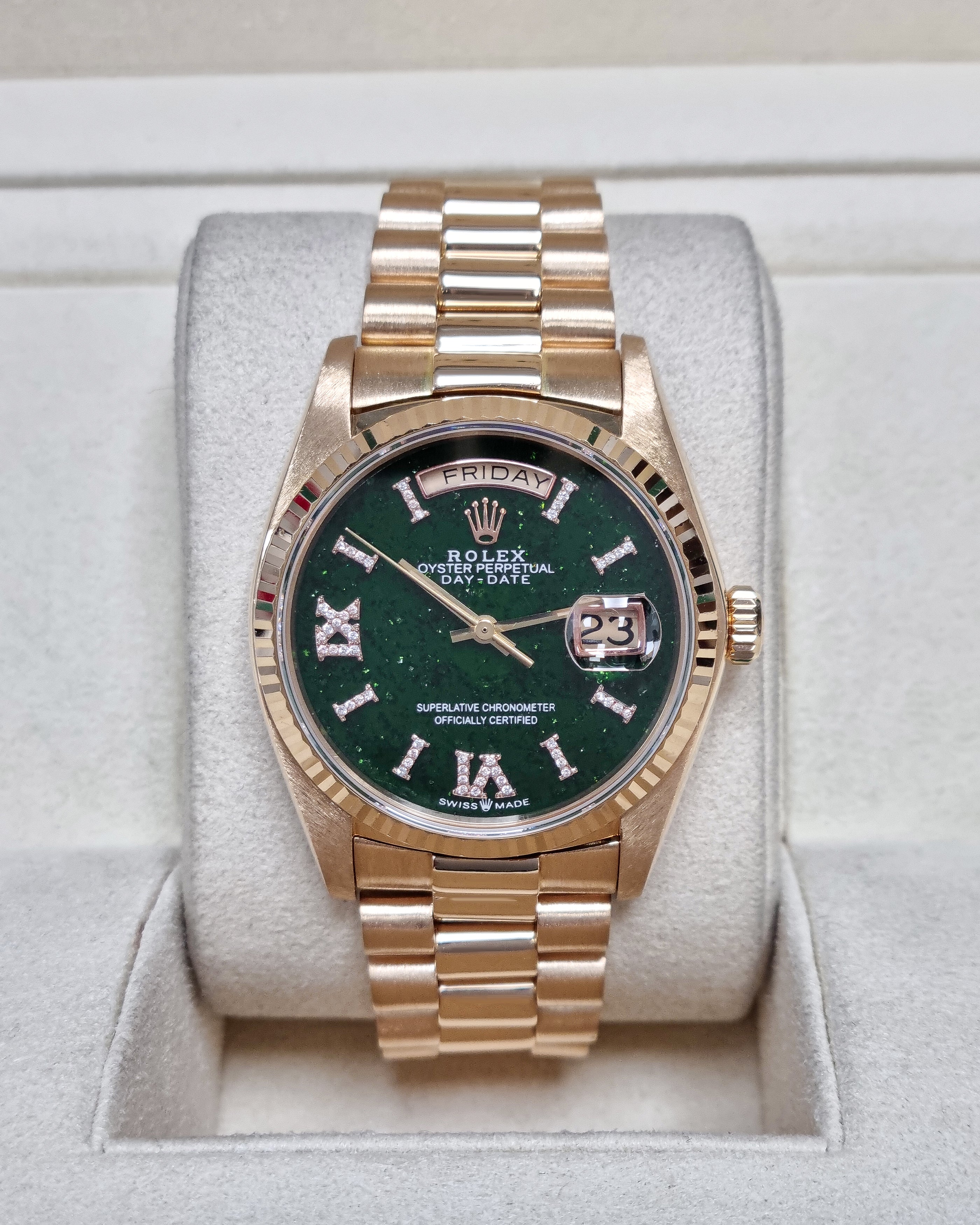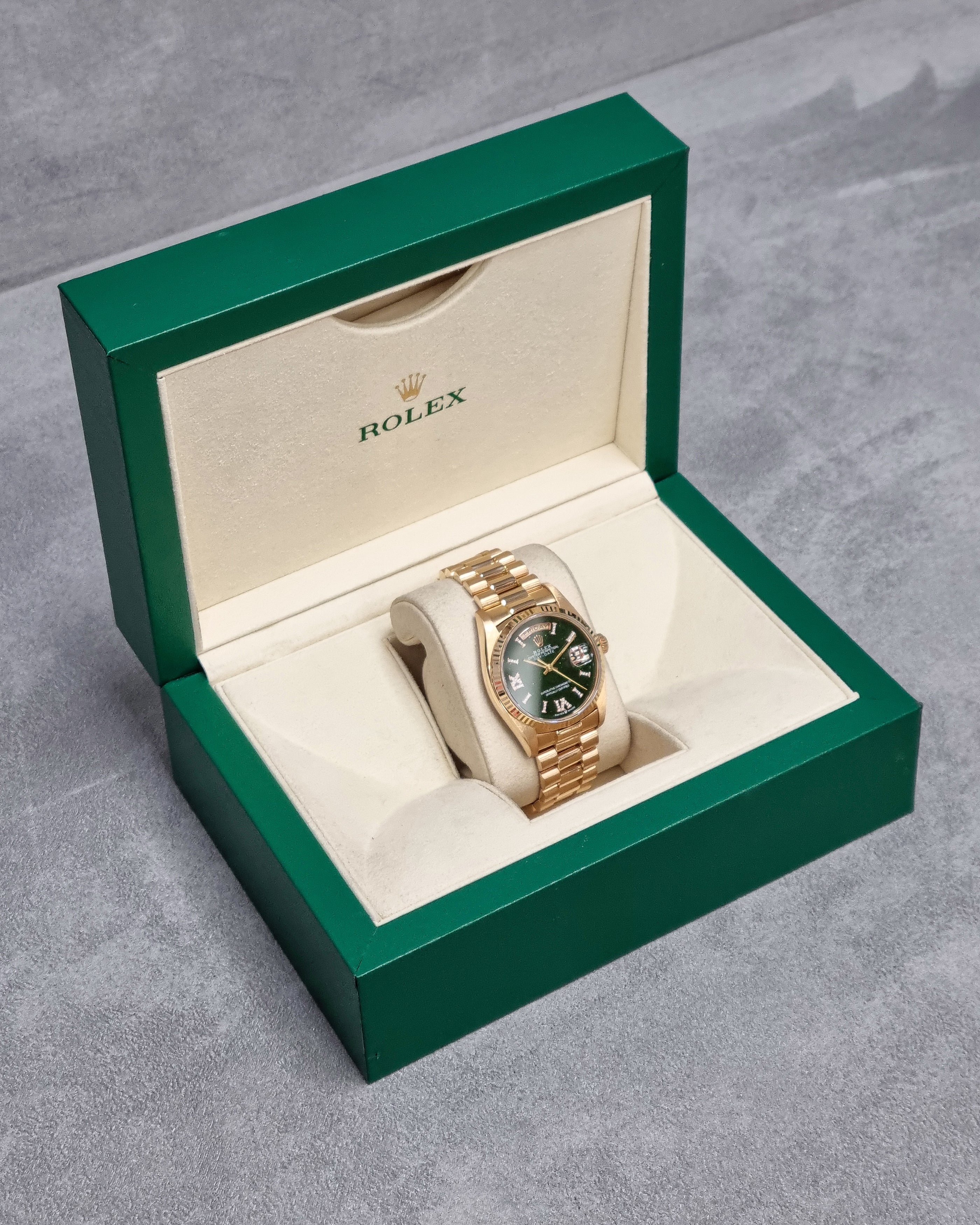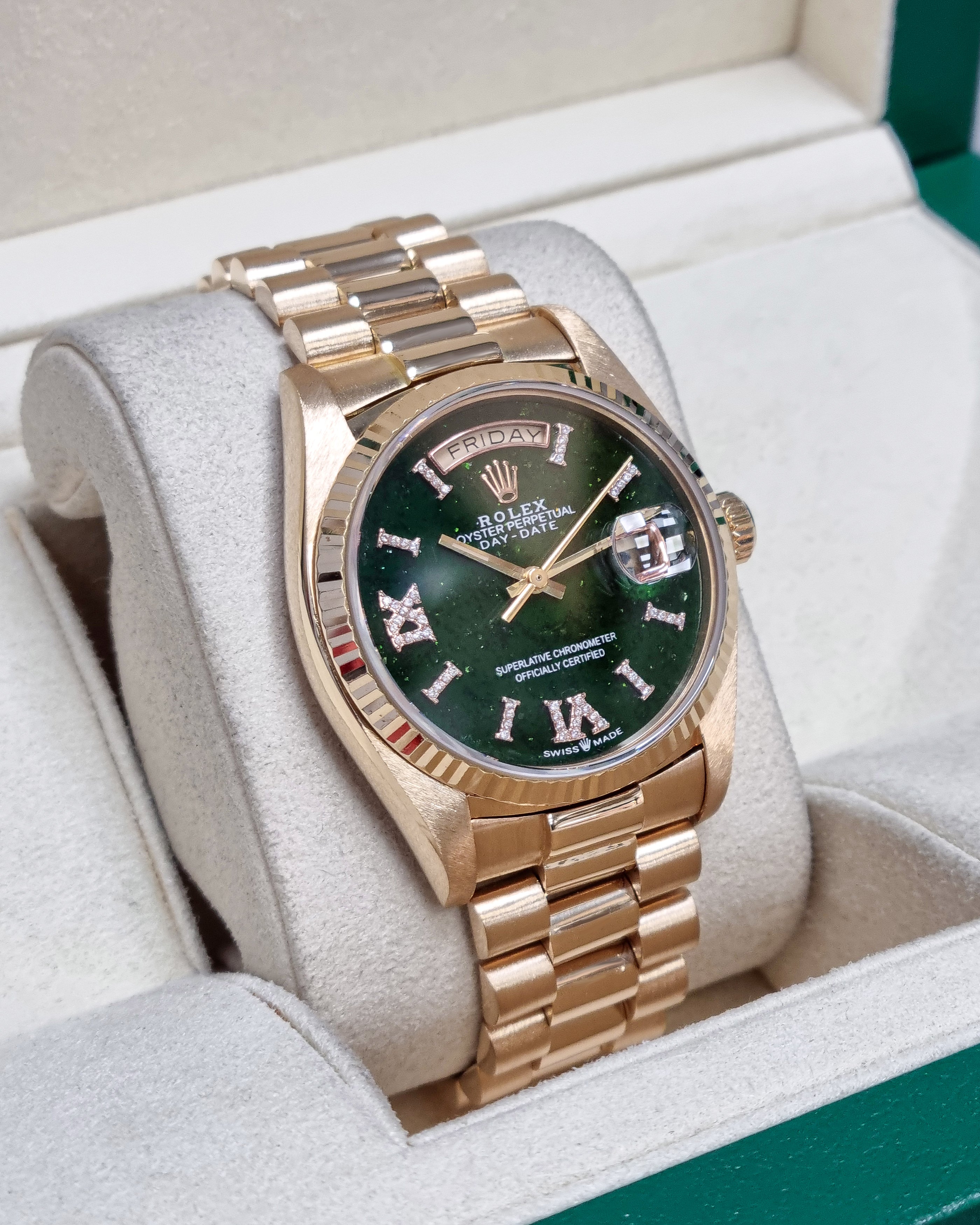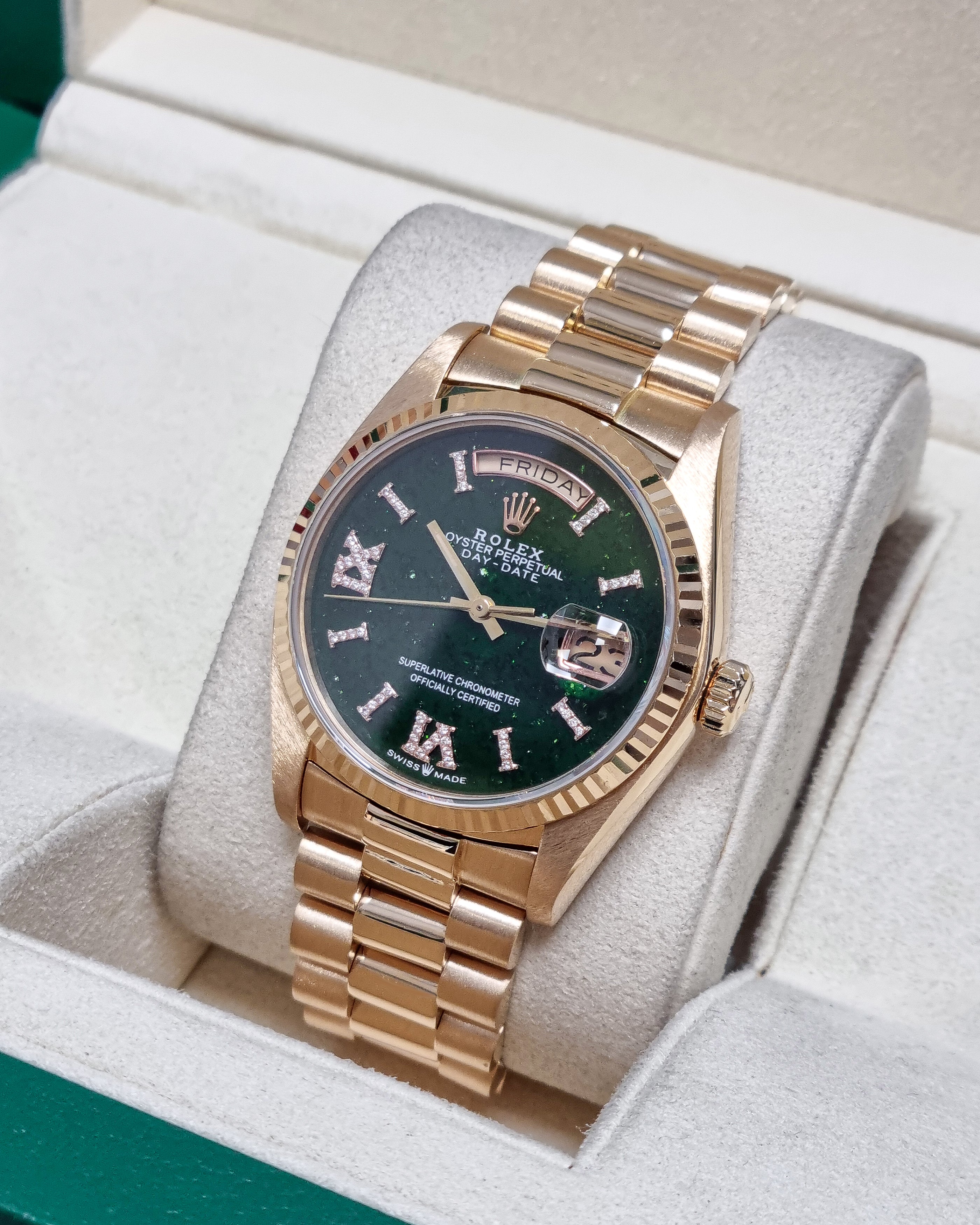 Rolex Day-Date 18038 (1979) – A striking and luxurious 36mm classic crafted in 18kt yellow gold. This standout piece features an 18kt fluted bezel paired with a custom green dial set with diamond Roman numerals, giving the watch a bold and elegant presence on the wrist.