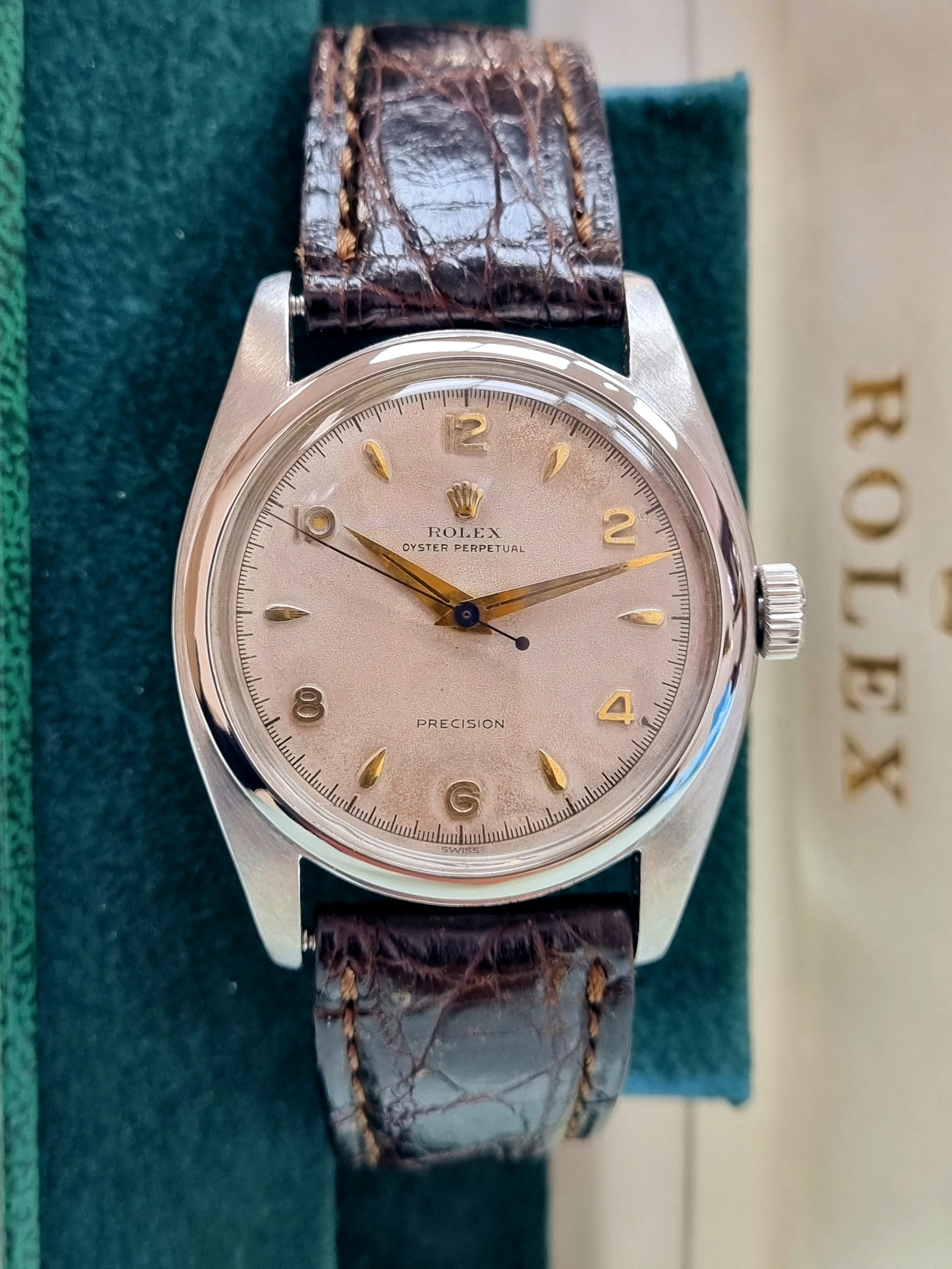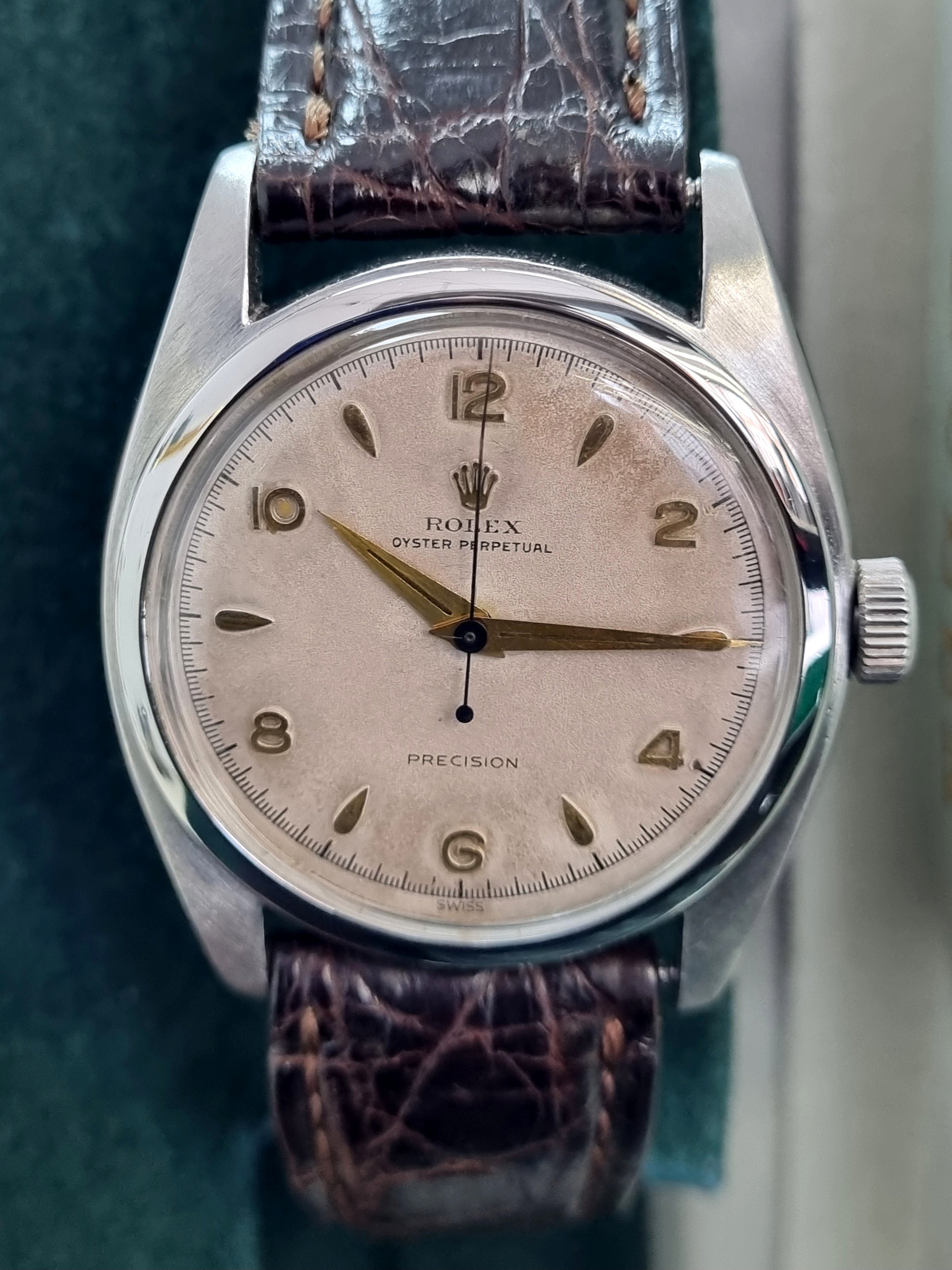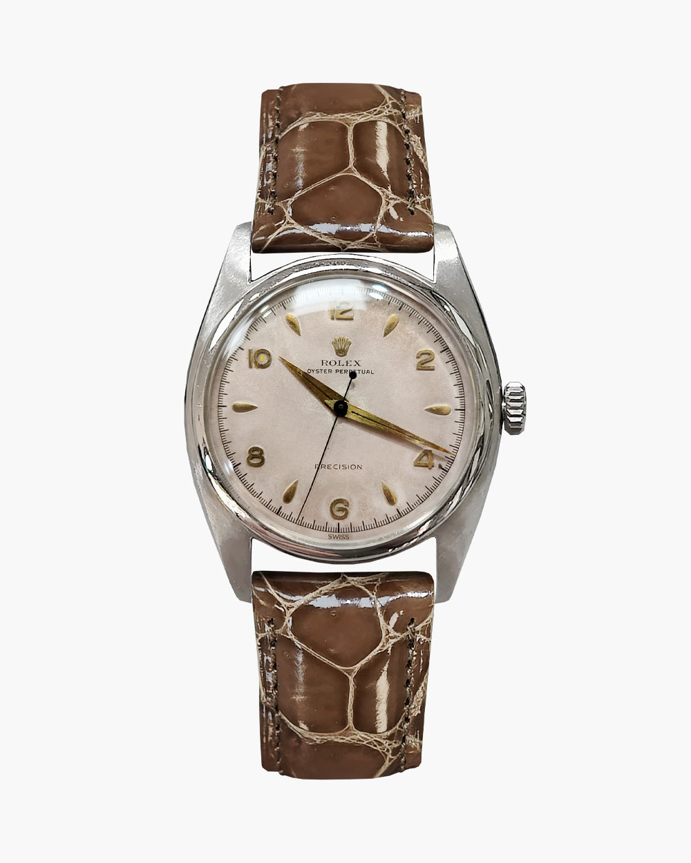 Rolex Explorer Precision 6098 (1949) – A 36mm stainless steel timepiece featuring a classic white dial, stainless steel bezel, and fitted with a genuine Rolex brown leather strap. Supplied with original box (no papers). In very good condition. Cat No. 0418.