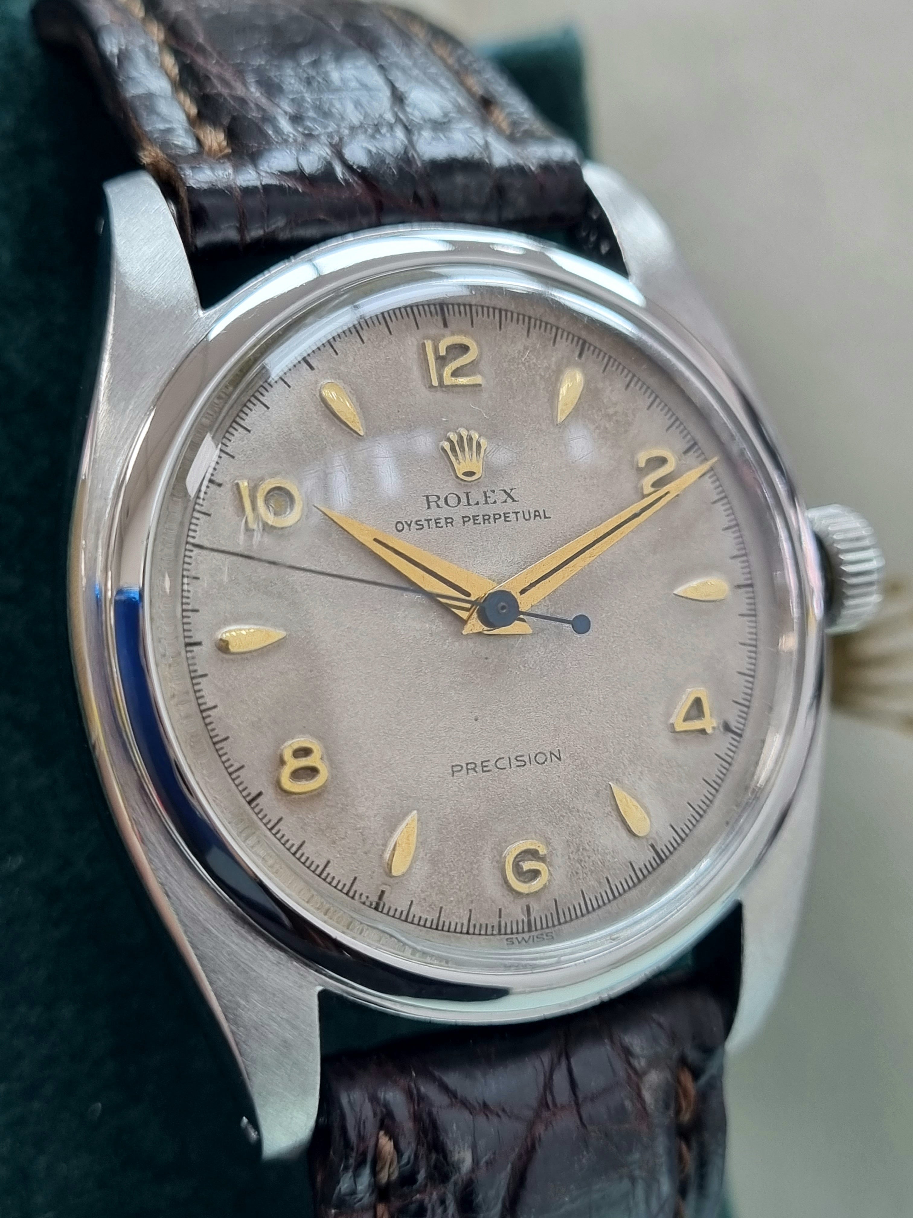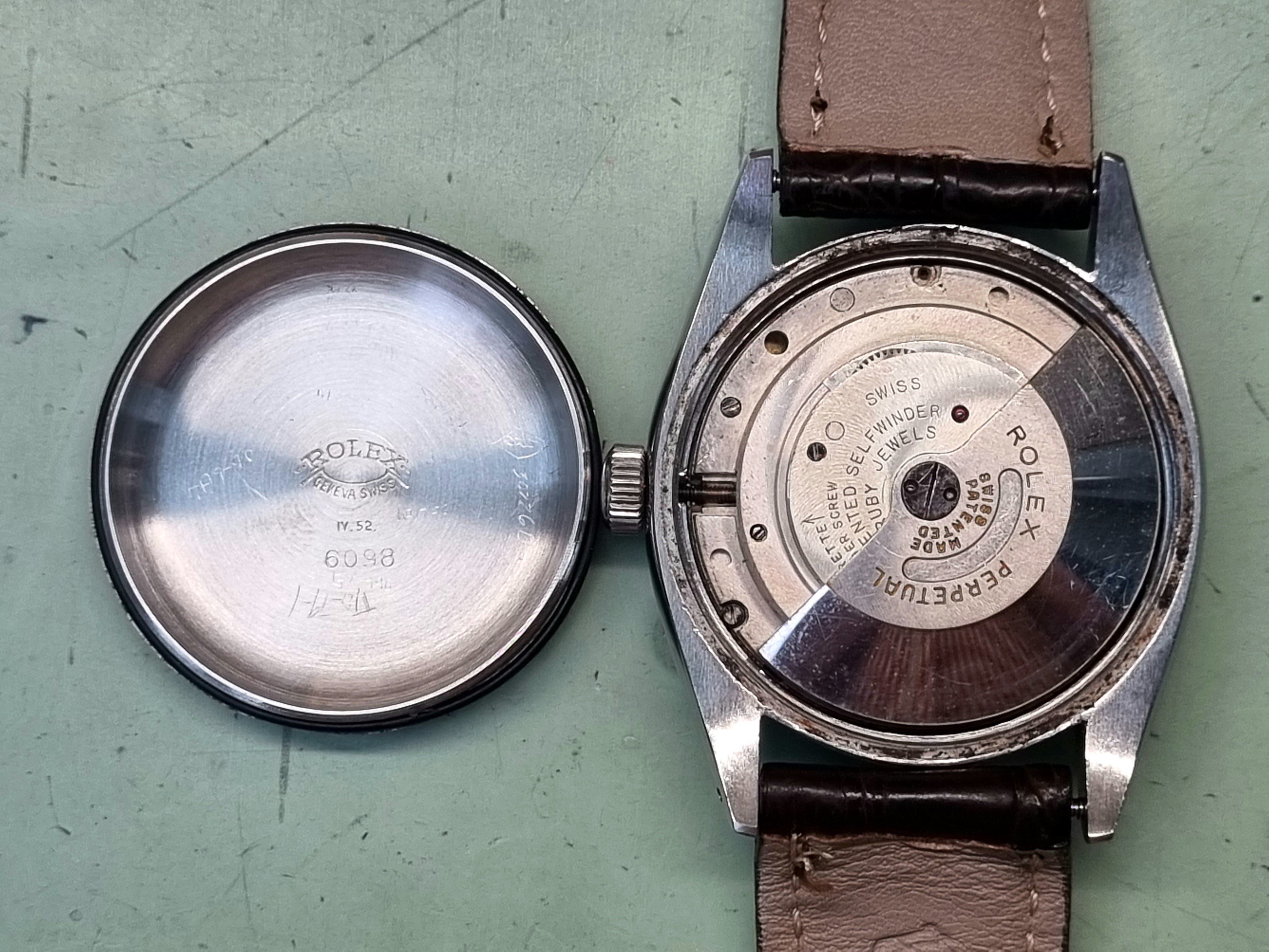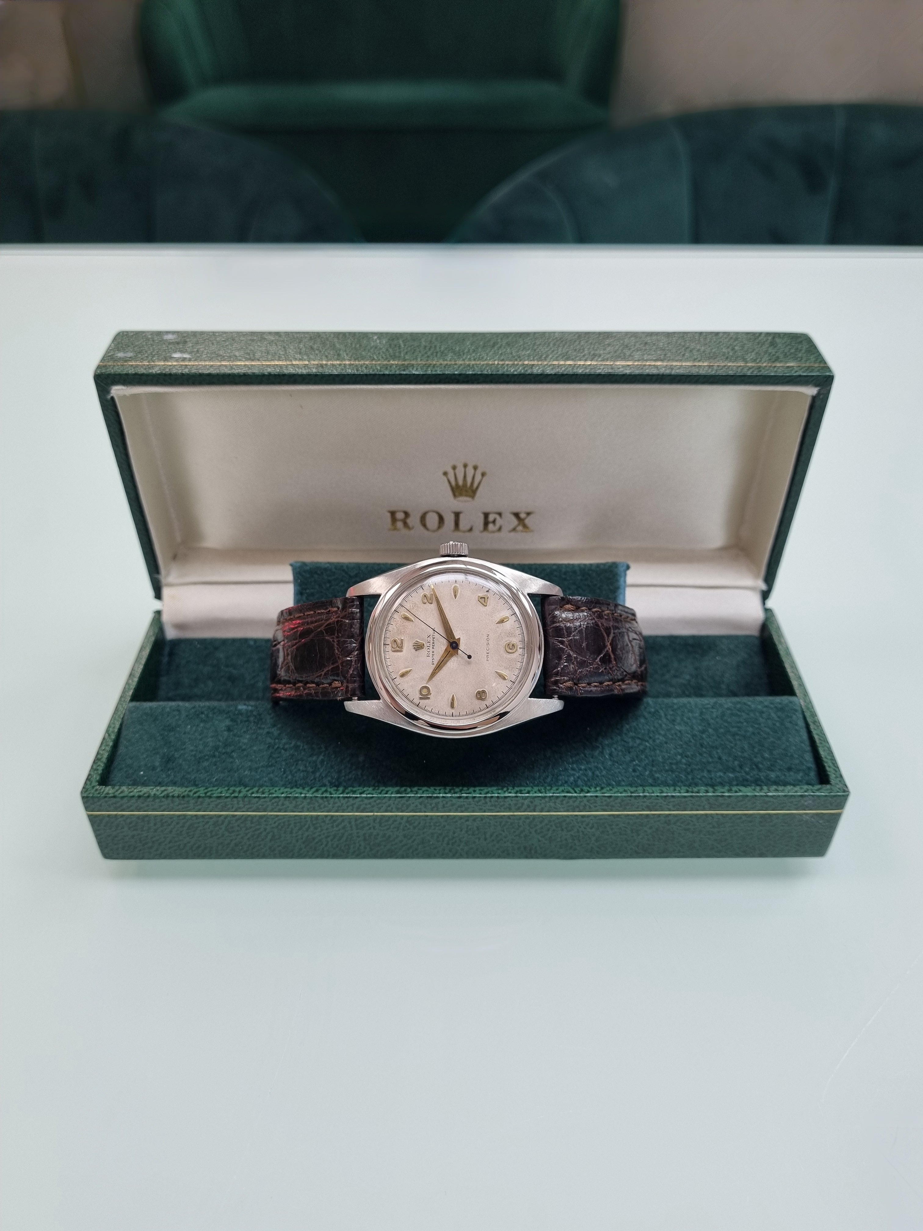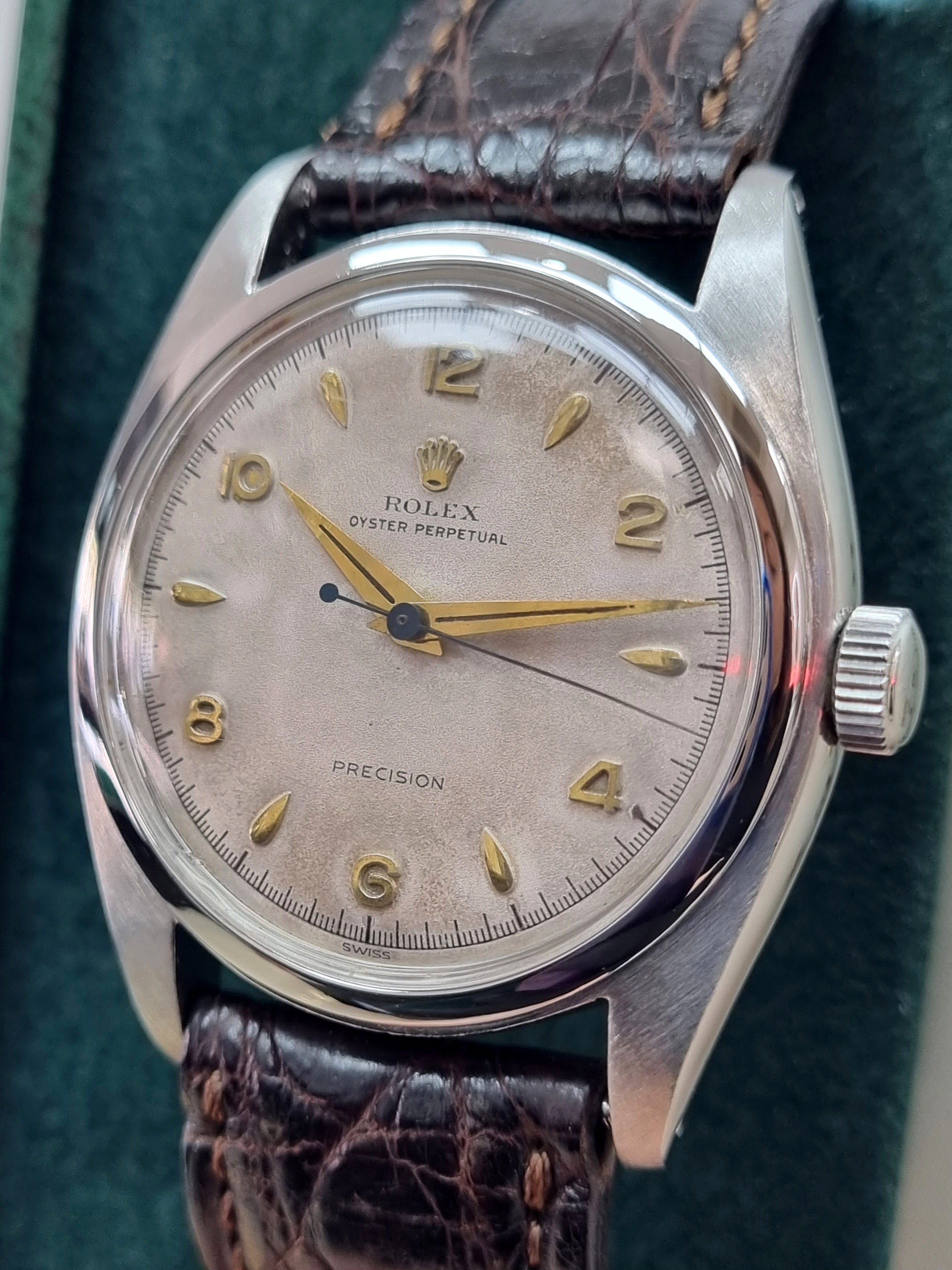 Rolex Explorer Precision 6098 (1949) – A 36mm stainless steel timepiece featuring a classic white dial, stainless steel bezel, and fitted with a genuine Rolex brown leather strap. Supplied with original box (no papers). In very good condition. Cat No. 0418.