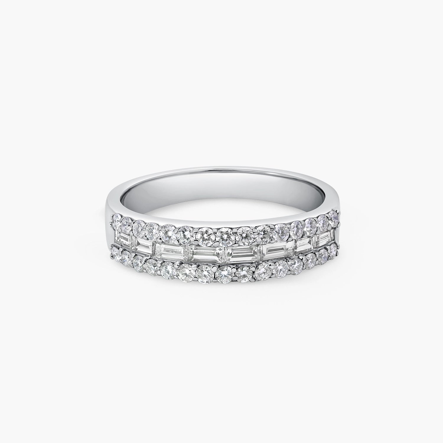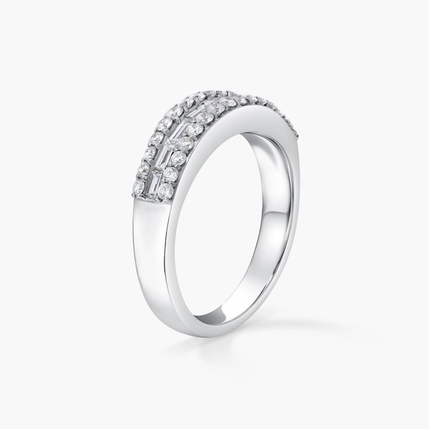 An elegant 18kt white gold 1/4 eternity ring set with 0.90ct of natural diamonds, featuring baguette and round cuts arranged in three dazzling rows. The mix of shapes creates a rhythmic sparkle, blending modern design with timeless sophistication.