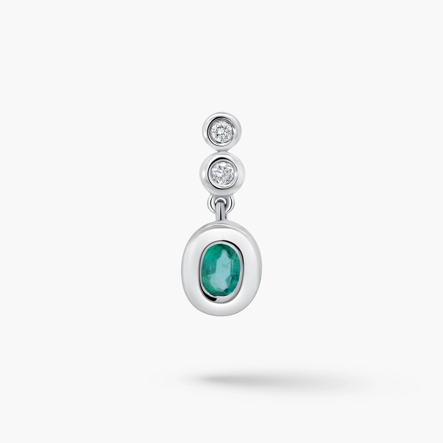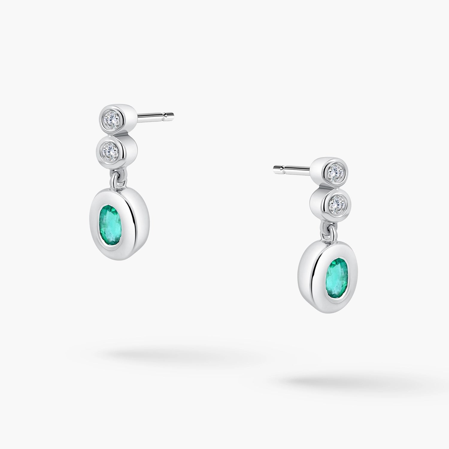 Elegant 18kt white gold drop earrings featuring 0.2ct green emeralds accented by two 0.1ct natural diamonds in a refined bezel setting. Weighing 2.7g, their delicate design offers subtle sparkle and graceful movement.